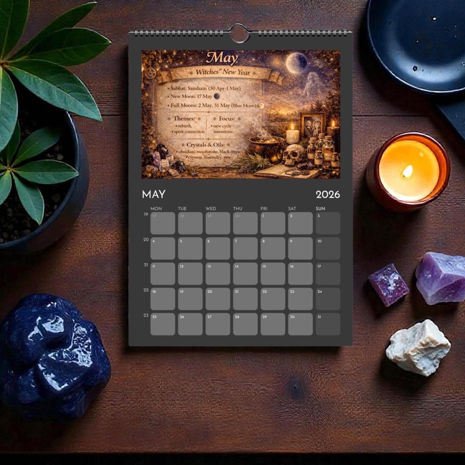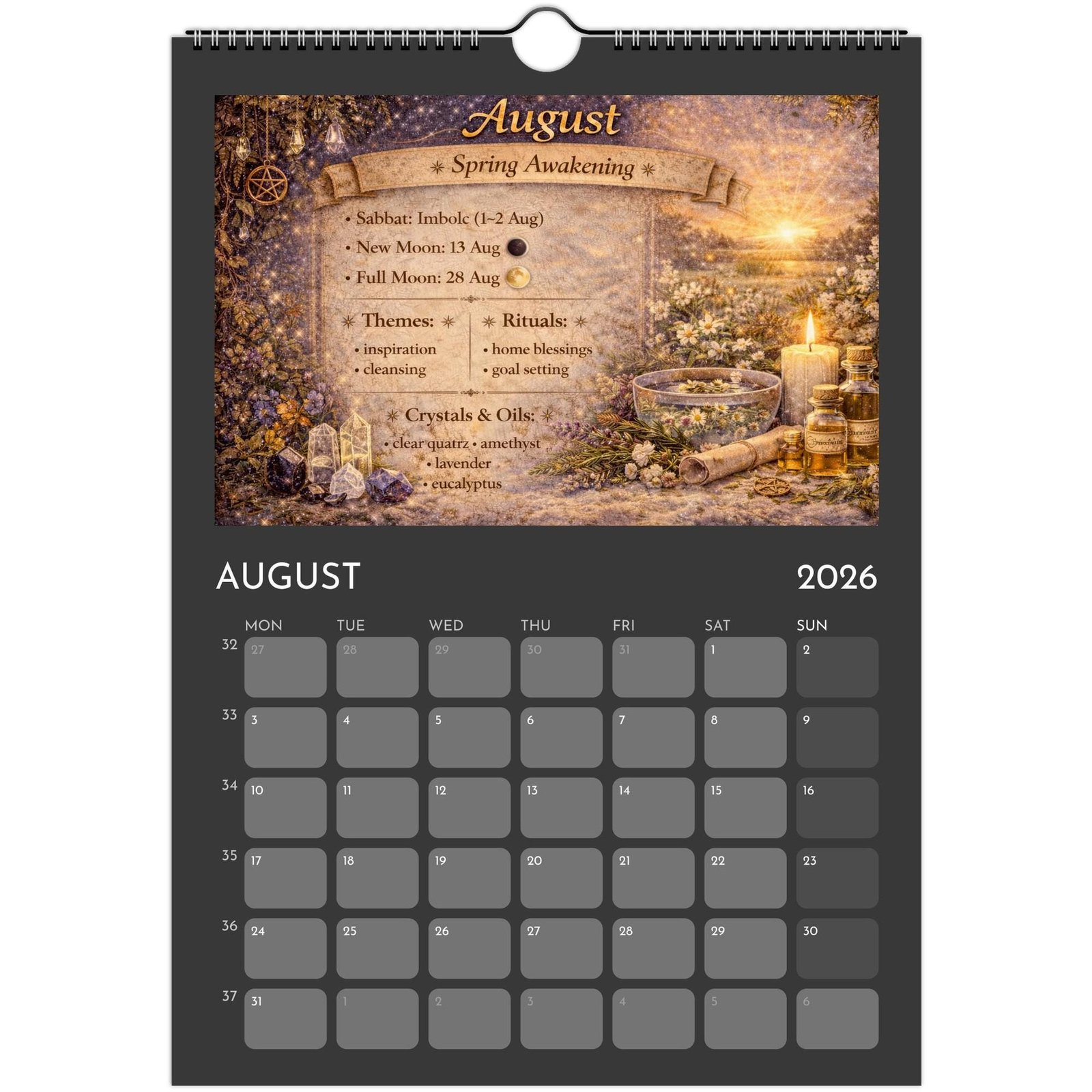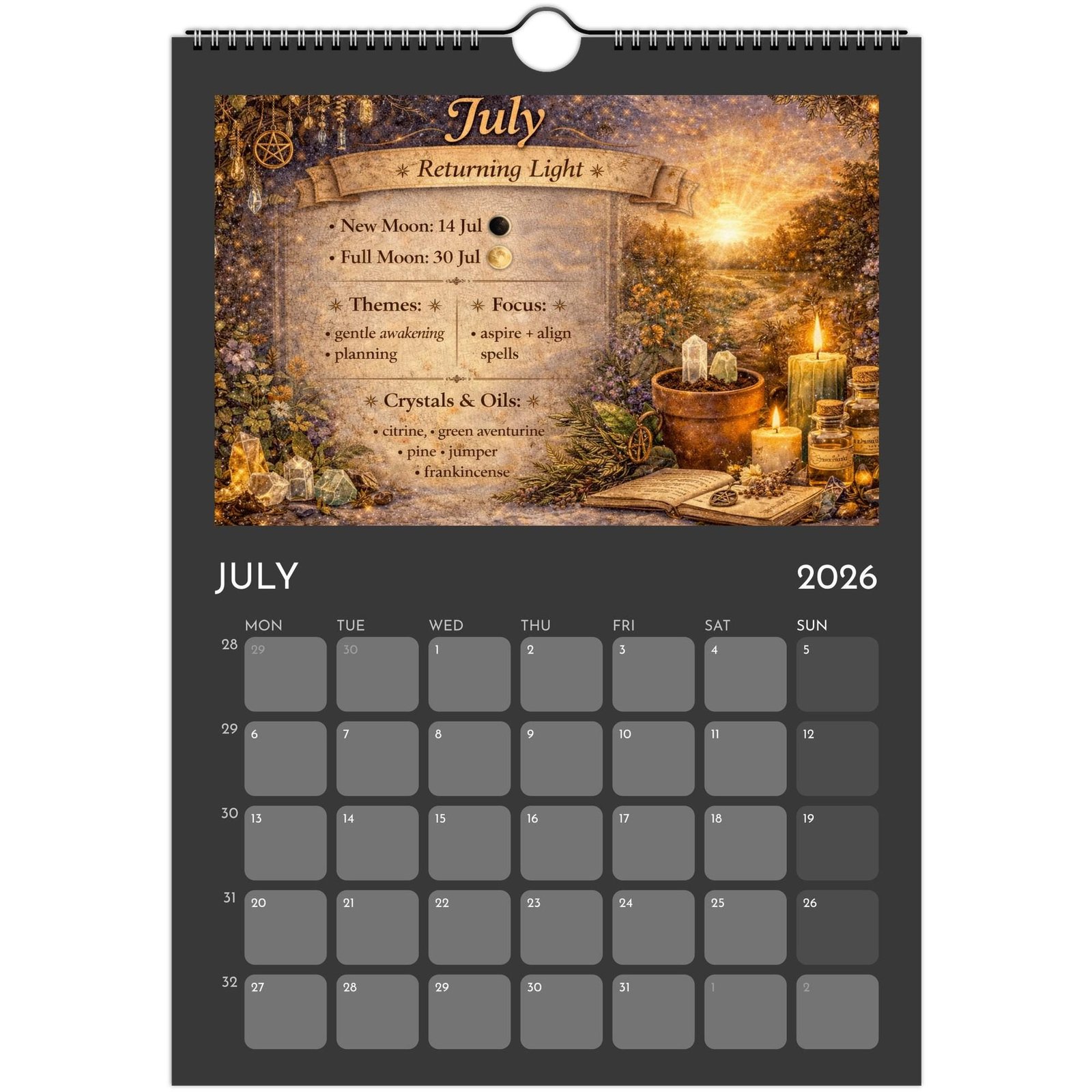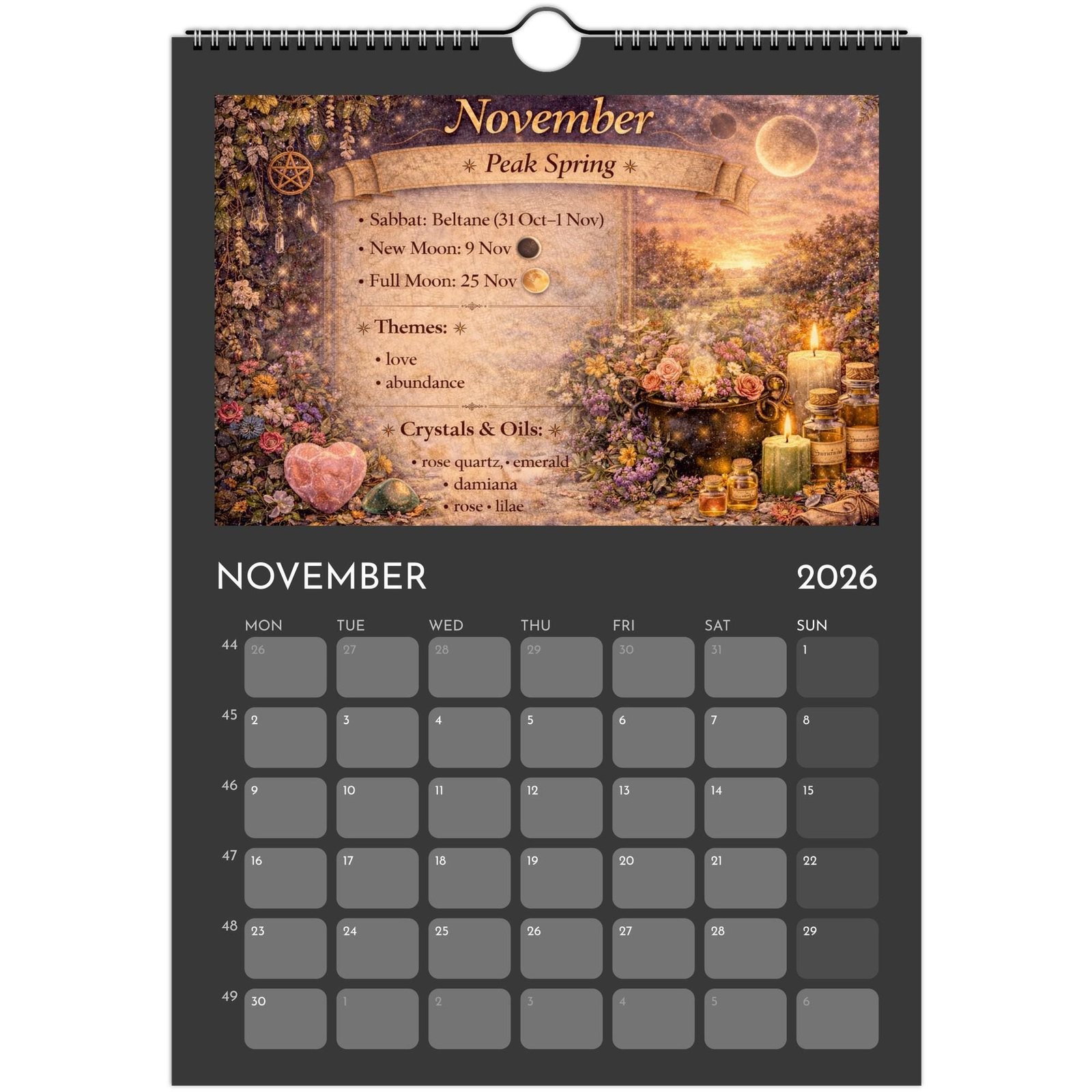 Each month blends practical calendar space with spiritual guidance — featuring Full Moons, New Moons, Sabbats, seasonal themes, crystals and essential oils to support your rituals, manifestations, and daily magic.