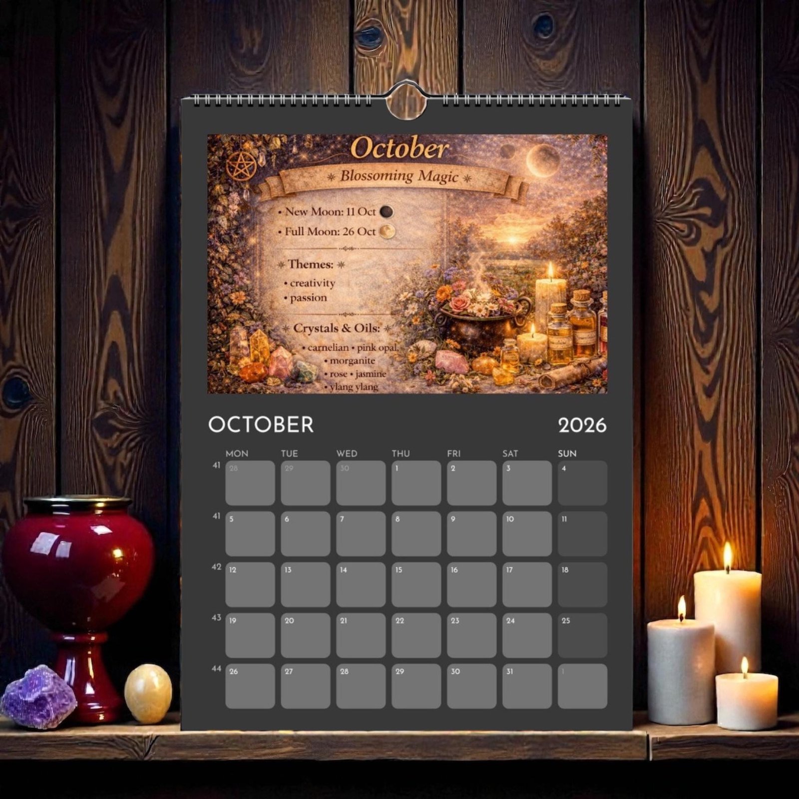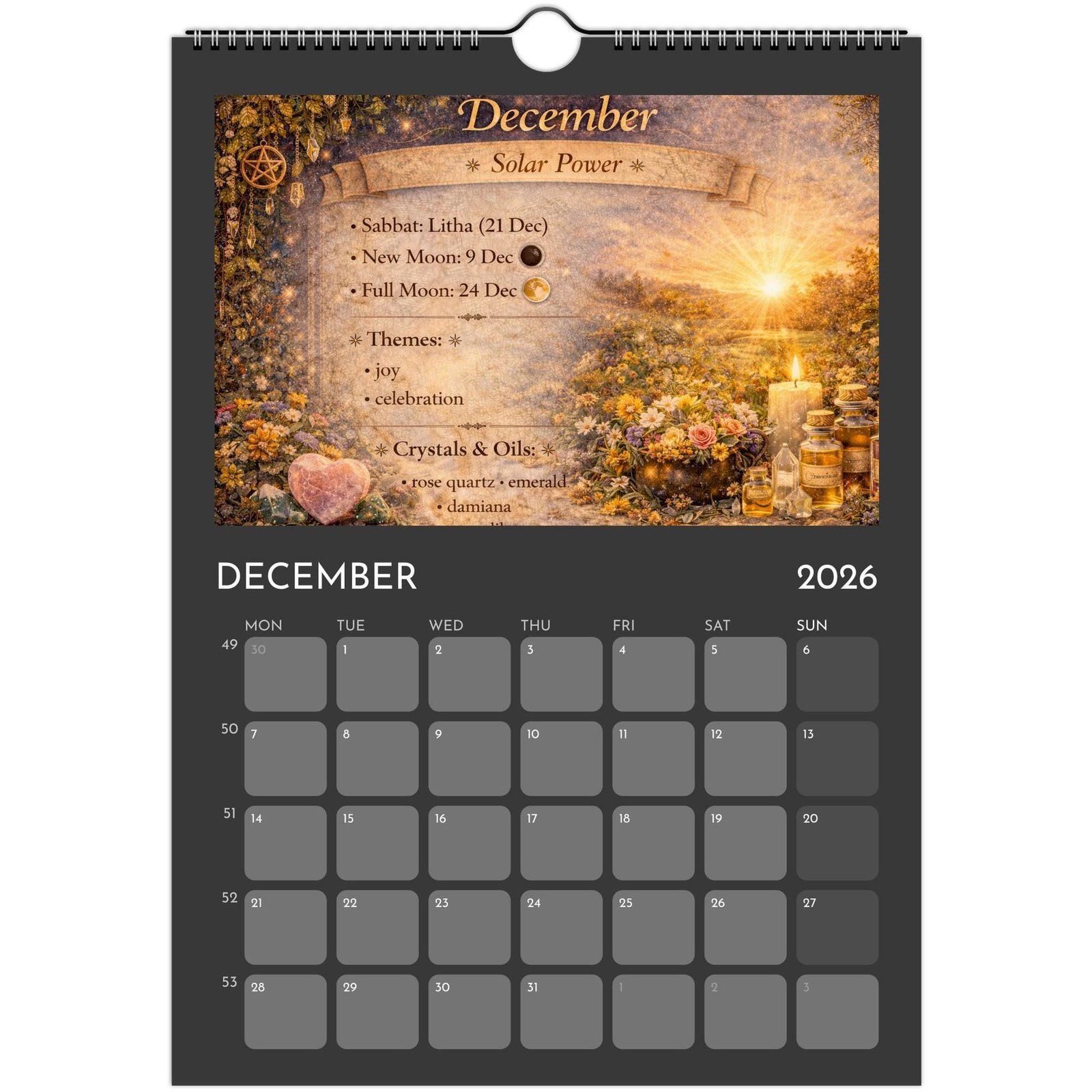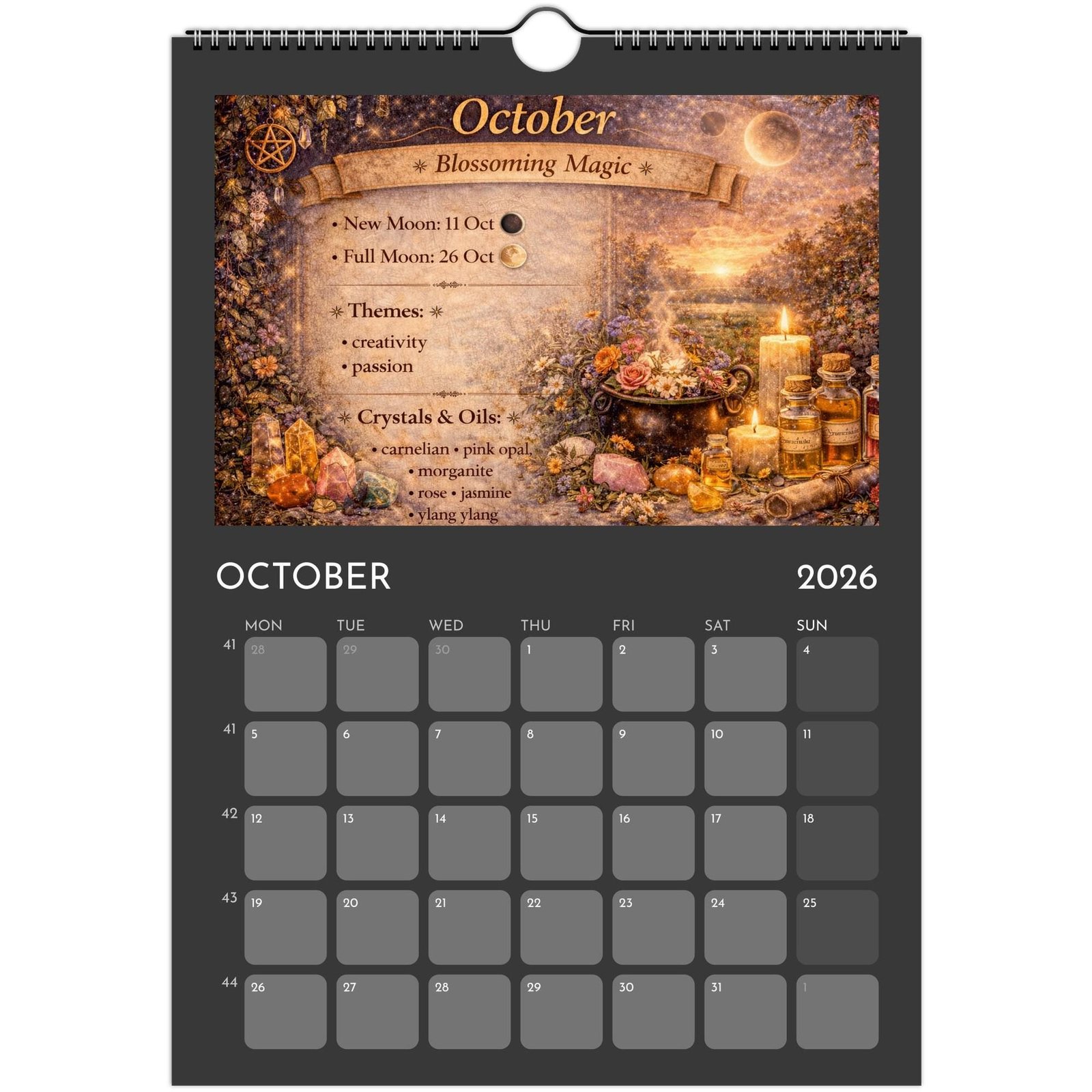 Each month blends practical calendar space with spiritual guidance — featuring Full Moons, New Moons, Sabbats, seasonal themes, crystals and essential oils to support your rituals, manifestations, and daily magic.