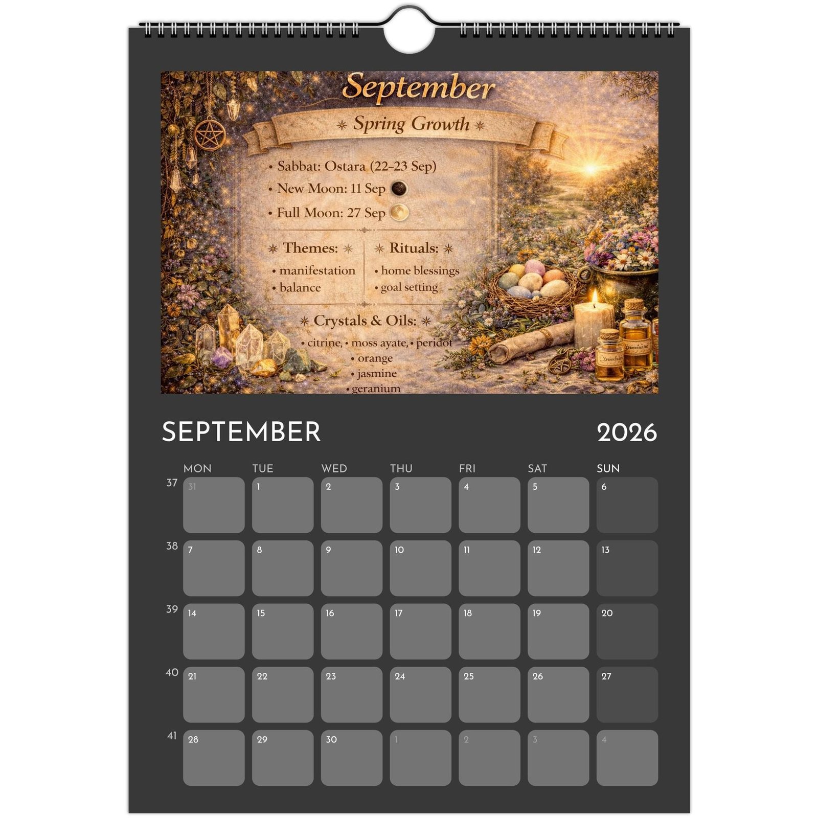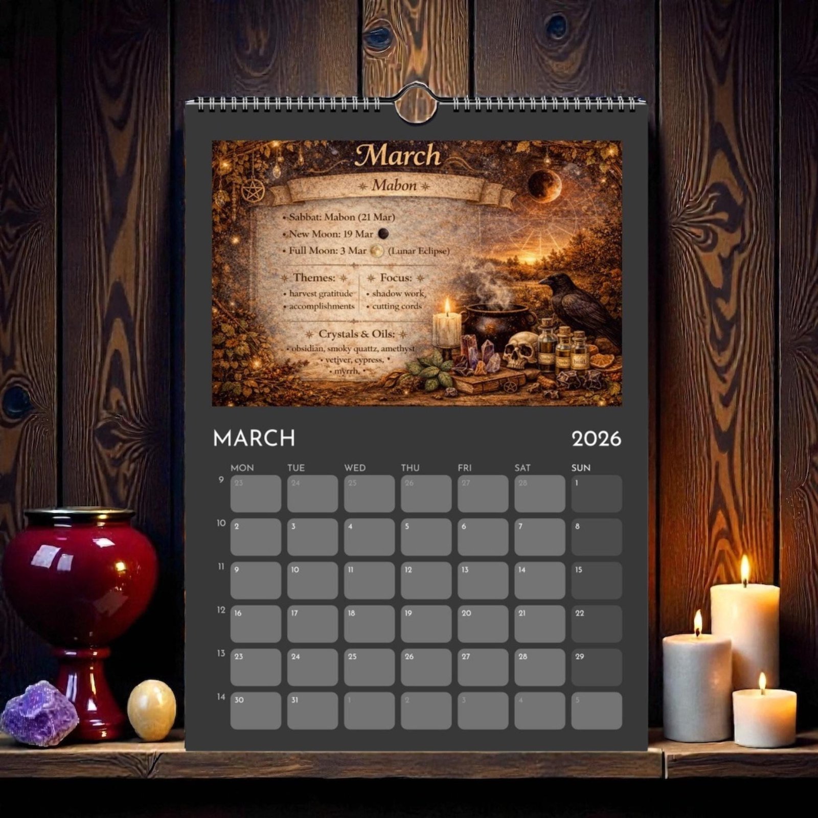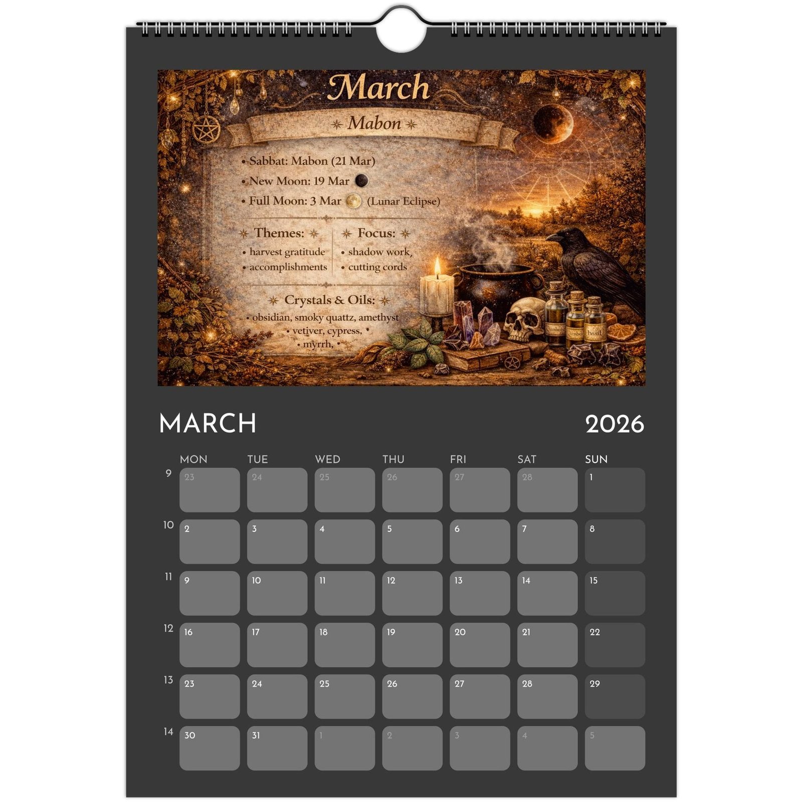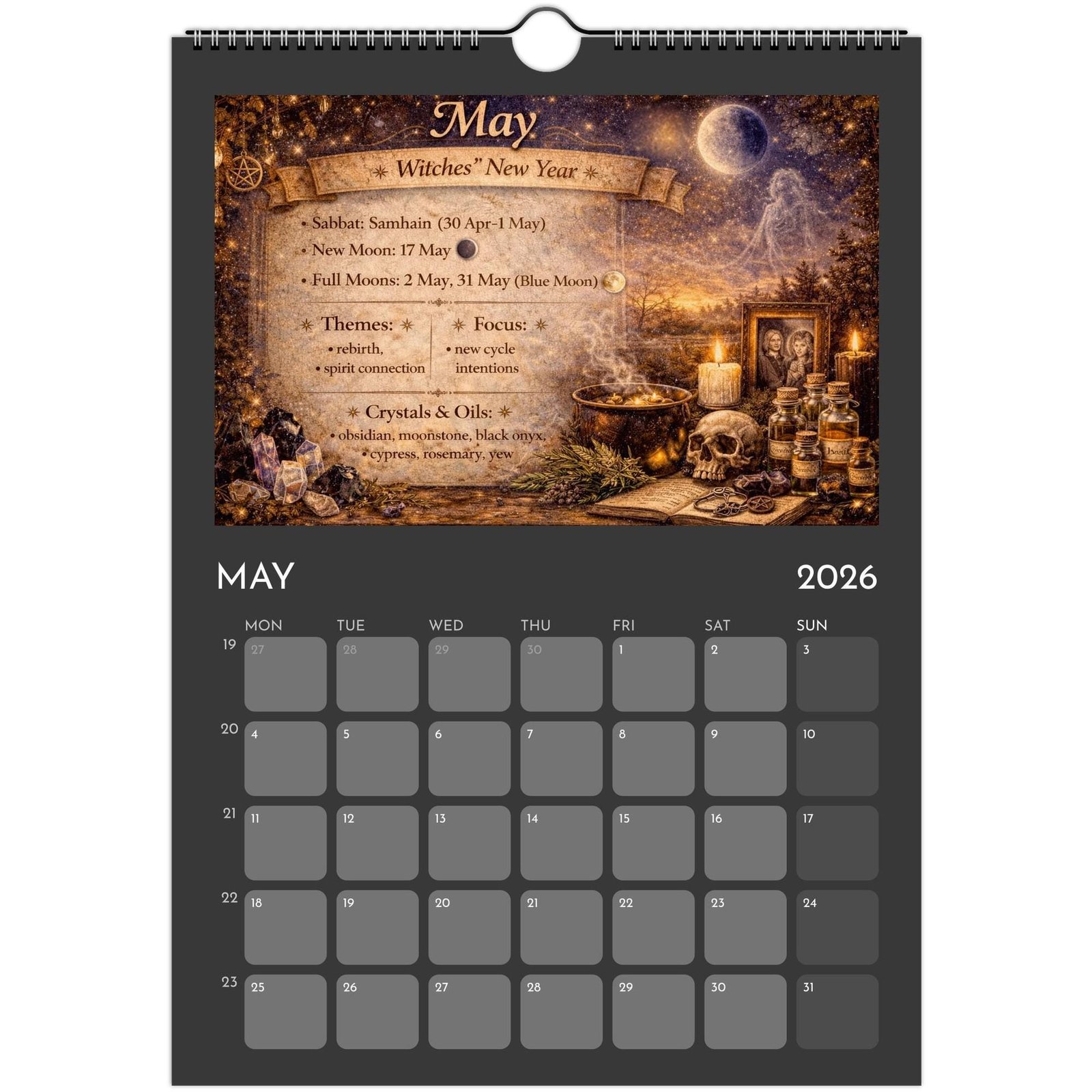 Each month blends practical calendar space with spiritual guidance — featuring Full Moons, New Moons, Sabbats, seasonal themes, crystals and essential oils to support your rituals, manifestations, and daily magic.