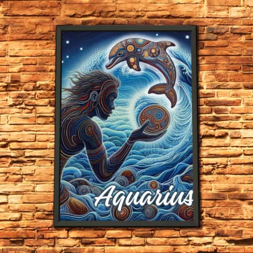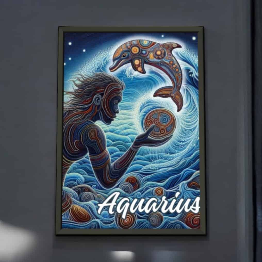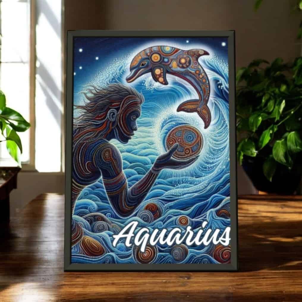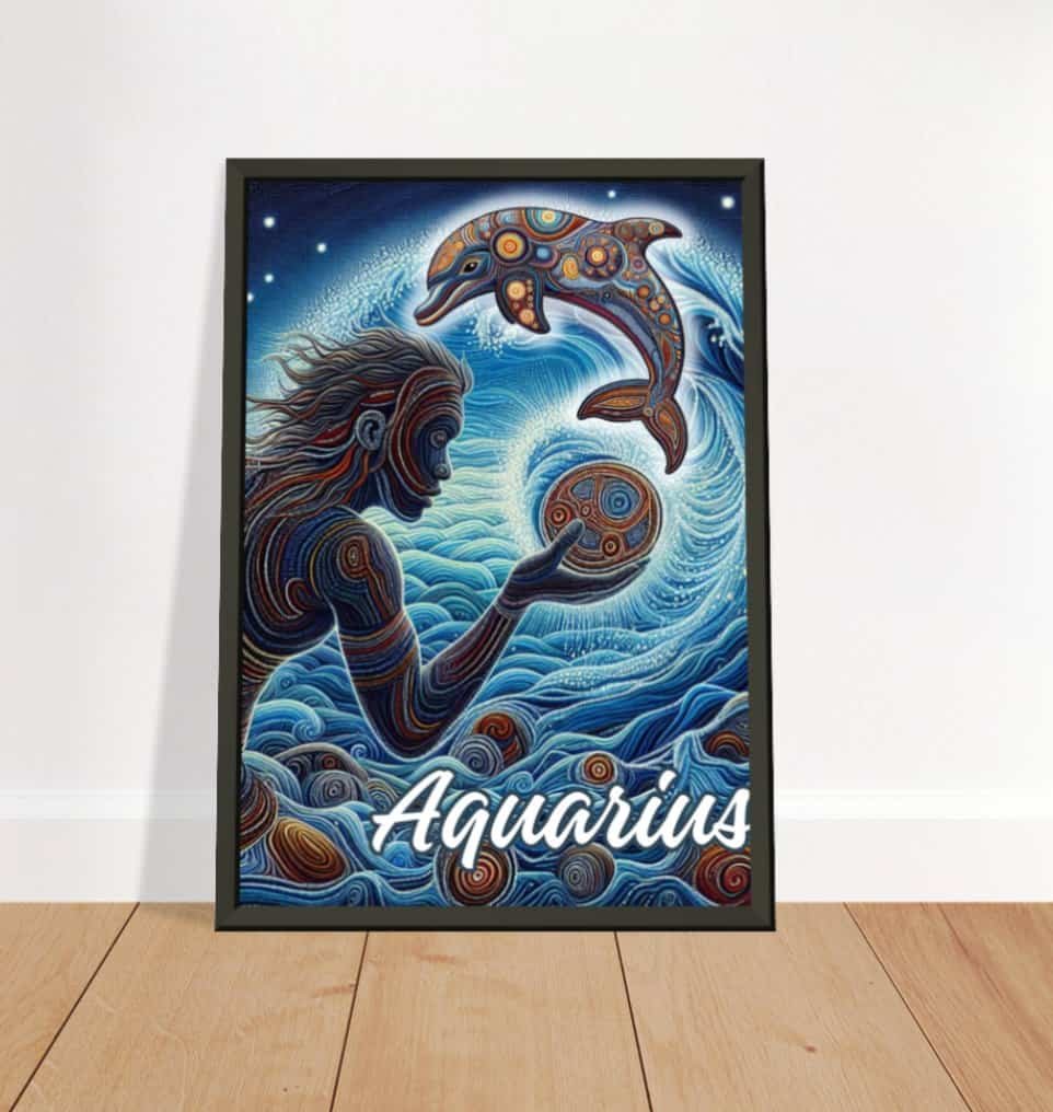 Dive into the mystical world of the Aquarius with this captivating art print. Featuring a harmonious blend of swirling blues and intricate patterns, this piece brings the essence of the Water Bearer to life. A graceful figure interacts with an ornate dolphin, ( the Aboriginal Aquarius symbol) symbolising wisdom and freedom, set against a backdrop of cosmic waves and celestial energy.