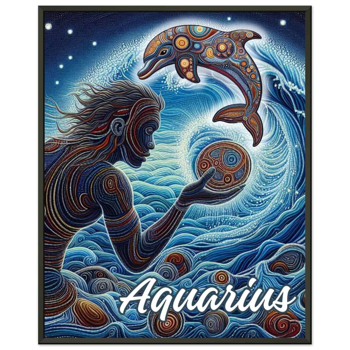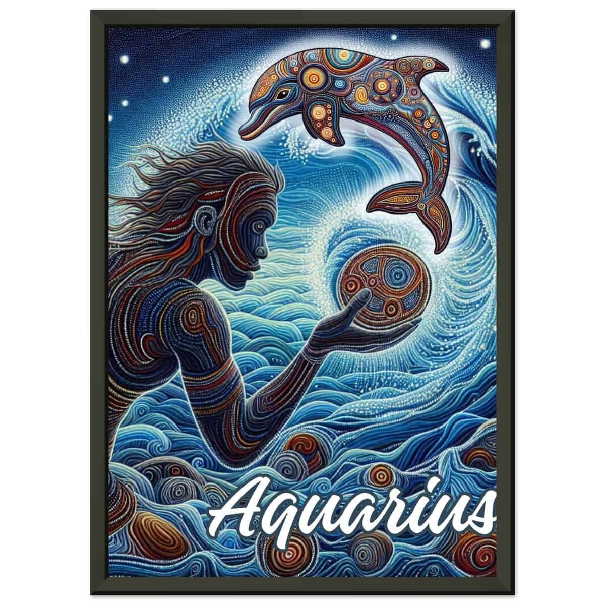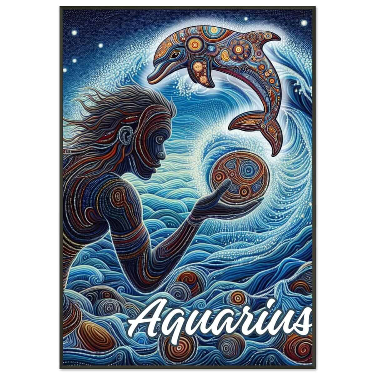Dive into the mystical world of the Aquarius with this captivating art print. Featuring a harmonious blend of swirling blues and intricate patterns, this piece brings the essence of the Water Bearer to life. A graceful figure interacts with an ornate dolphin, ( the Aboriginal Aquarius symbol) symbolising wisdom and freedom, set against a backdrop of cosmic waves and celestial energy.
