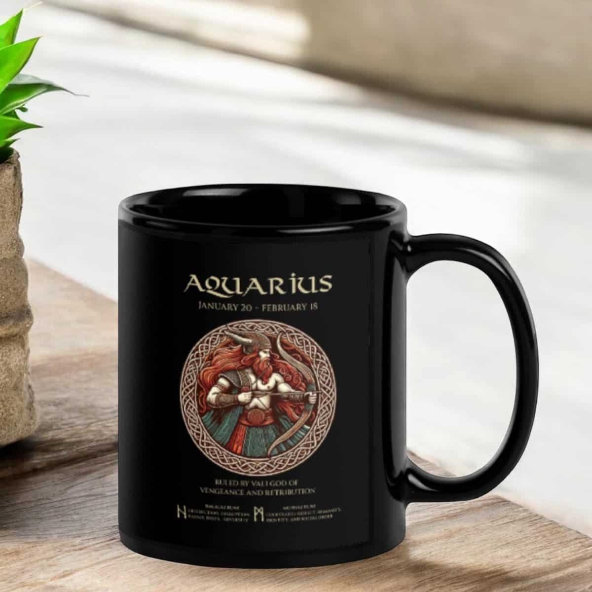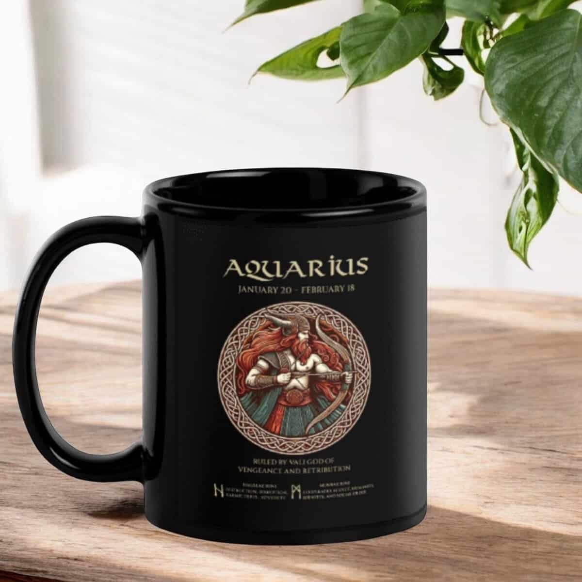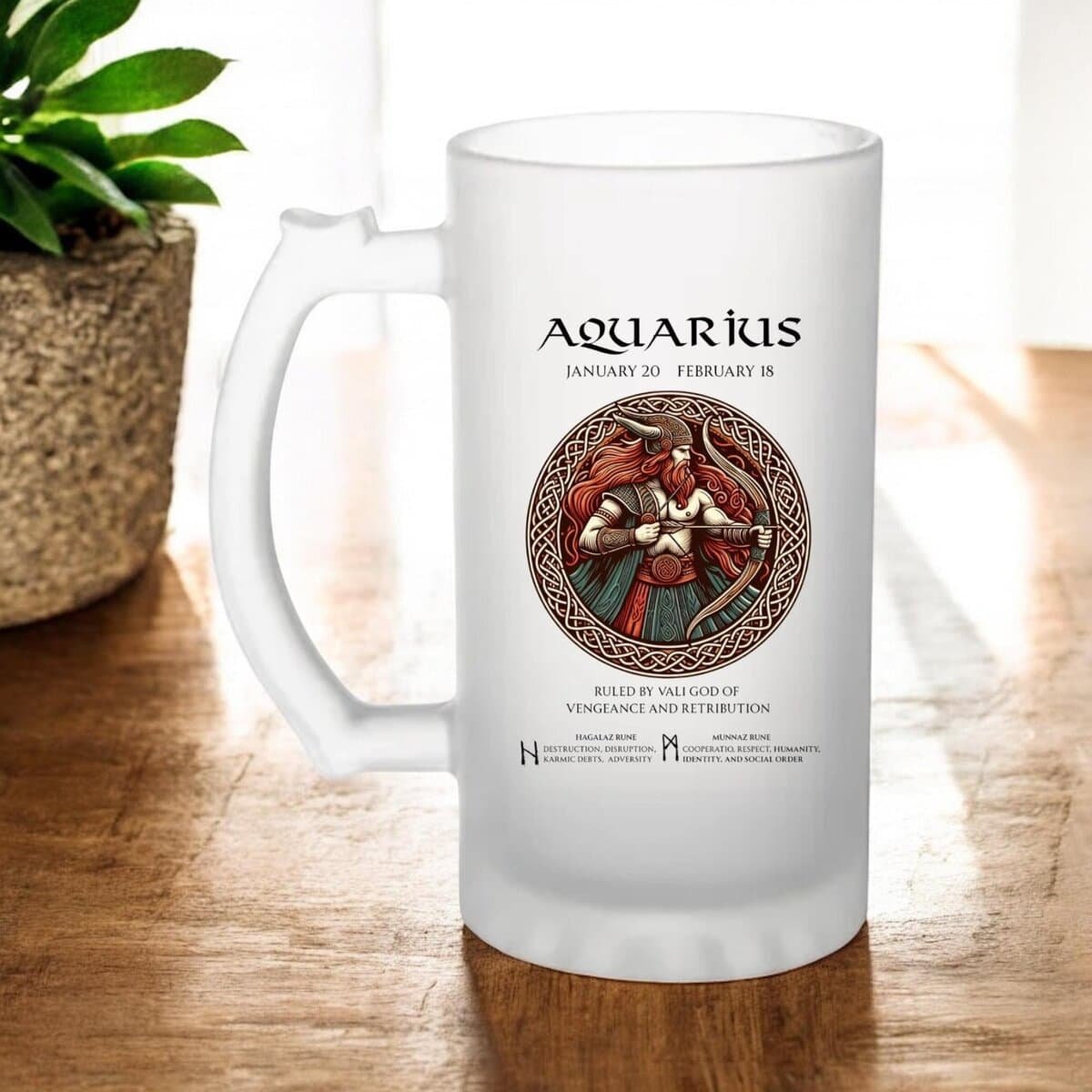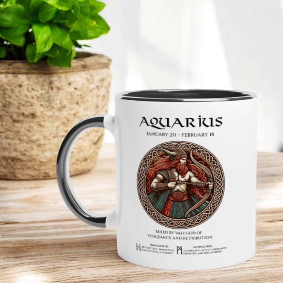 Featuring a Celtic design of the Aquarius Ruler Vali with his bow and arrow , God of vengeance and retribution and the runes of Aquarius , Hagalaz and Munnaz and their meanings, printed on 11oz microwave and dishwasher safe ceramic coffee mugs , or a 16 oz frosted glass beer mug.