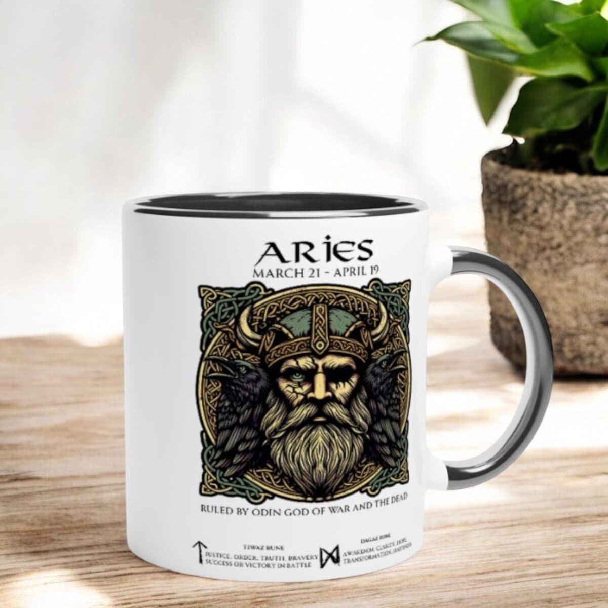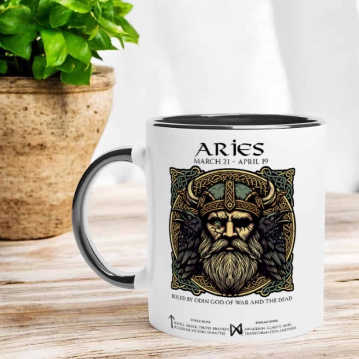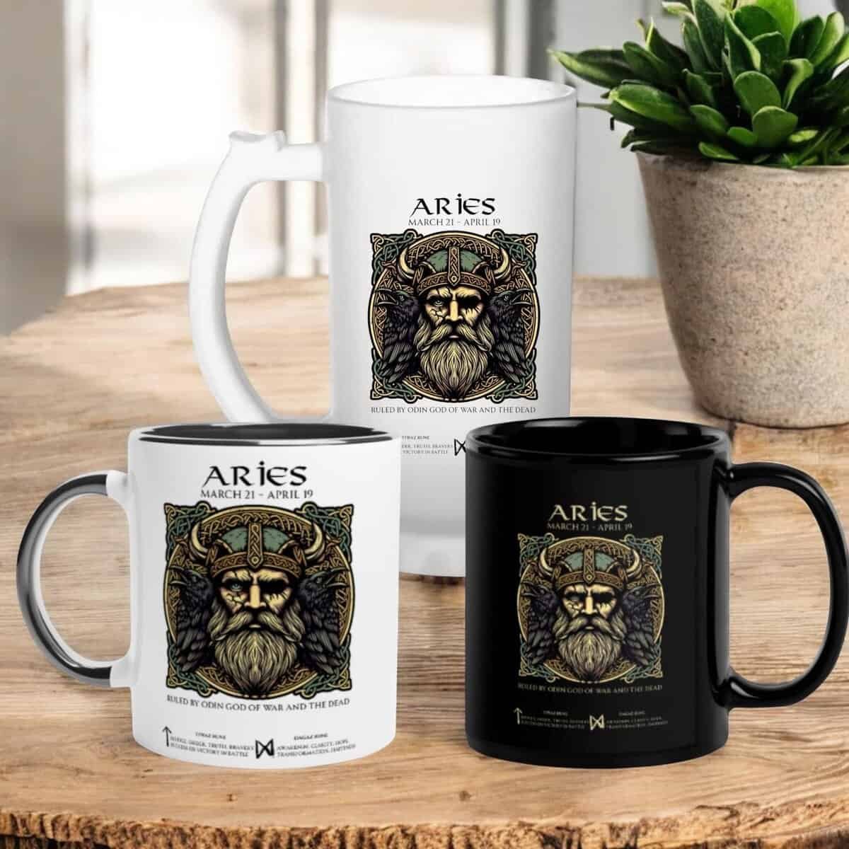 Featuring a Celtic design of the Aries Ruler Odin, the God of War and Death with his 2 ravens, Huginn and Muginn as well as the runes of Aries, Tiwaz and Dagaz and their meanings, printed on 11oz microwave and dishwasher safe ceramic coffee mugs , or a 16 oz frosted glass beer mug.