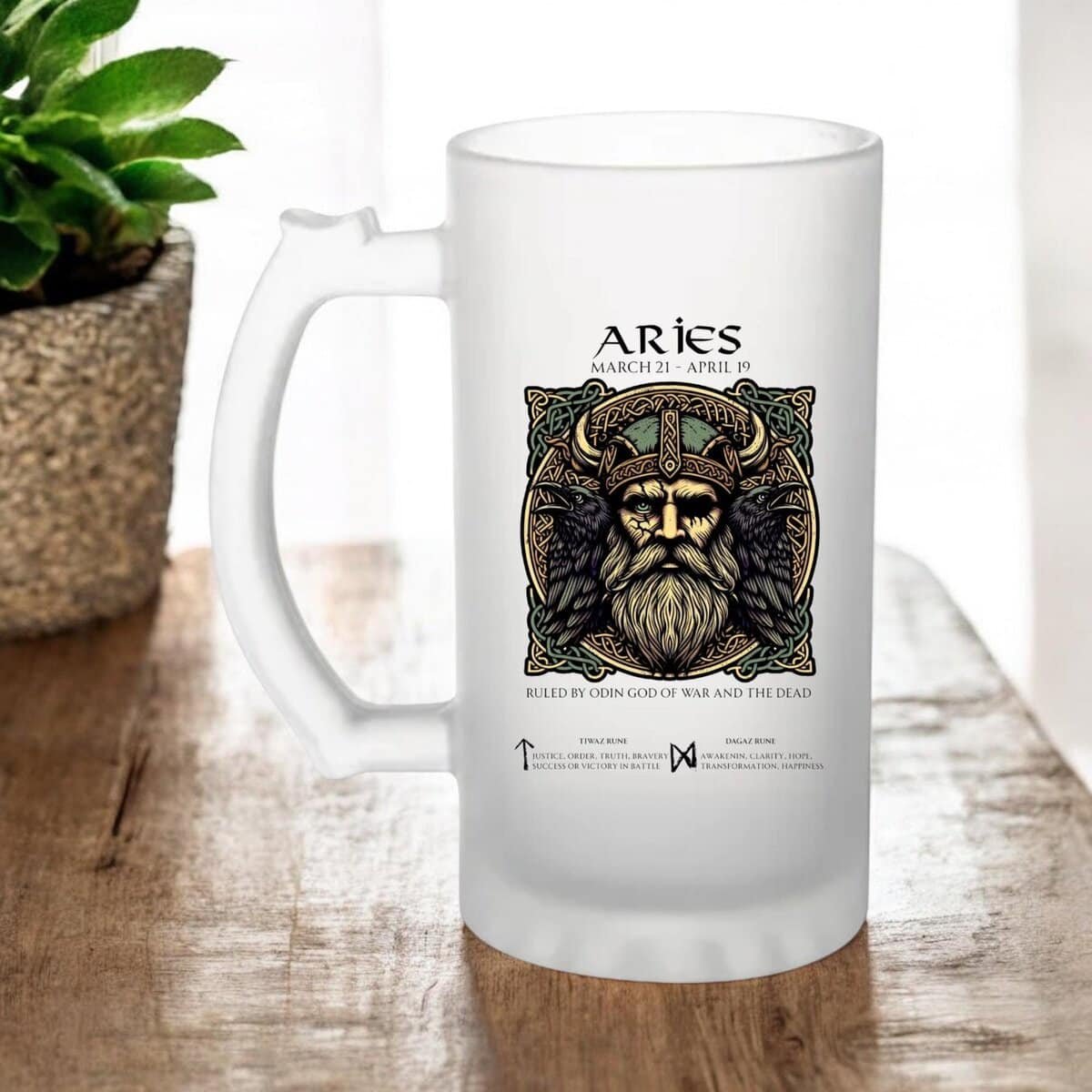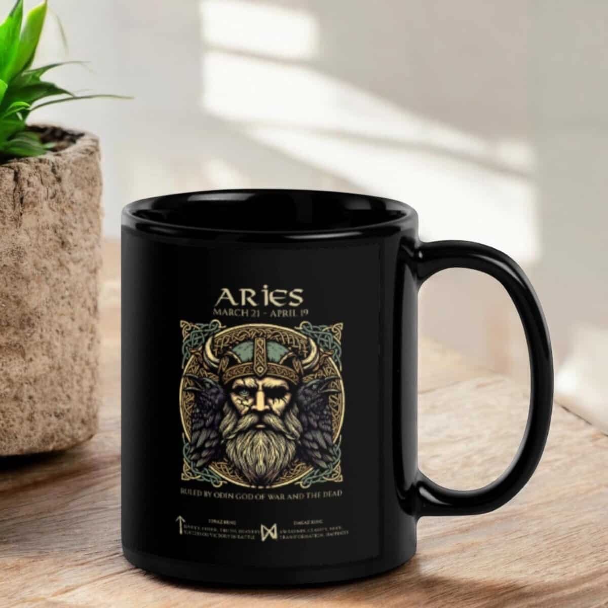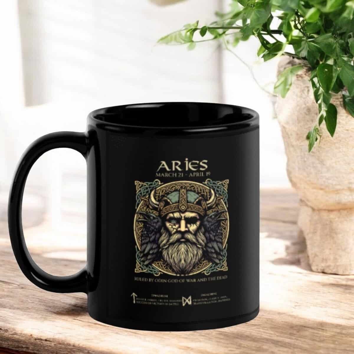 Featuring a Celtic design of the Aries Ruler Odin, the God of War and Death with his 2 ravens, Huginn and Muginn as well as the runes of Aries, Tiwaz and Dagaz and their meanings, printed on 11oz microwave and dishwasher safe ceramic coffee mugs , or a 16 oz frosted glass beer mug.