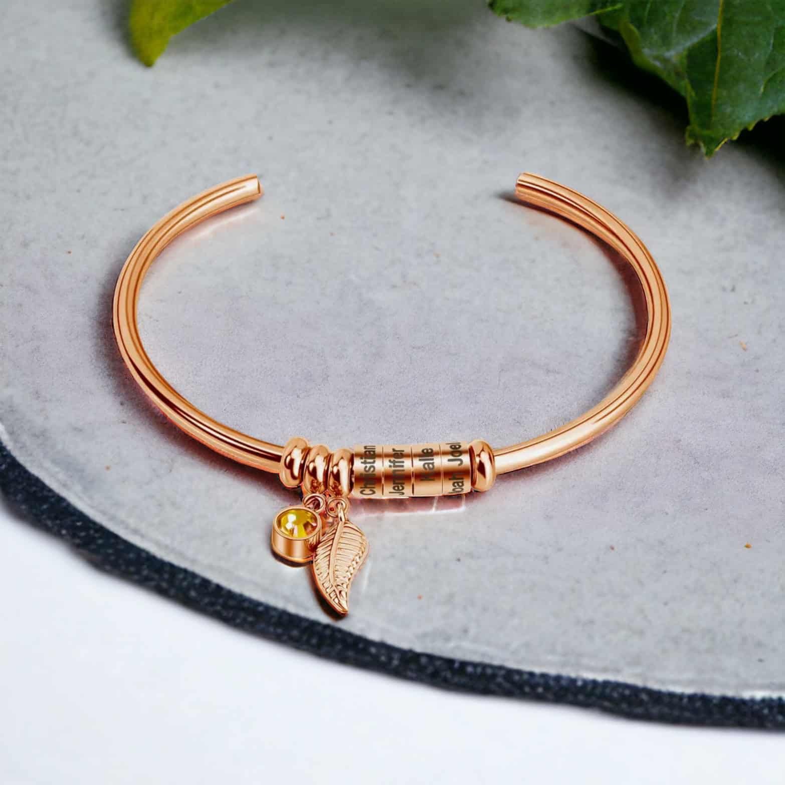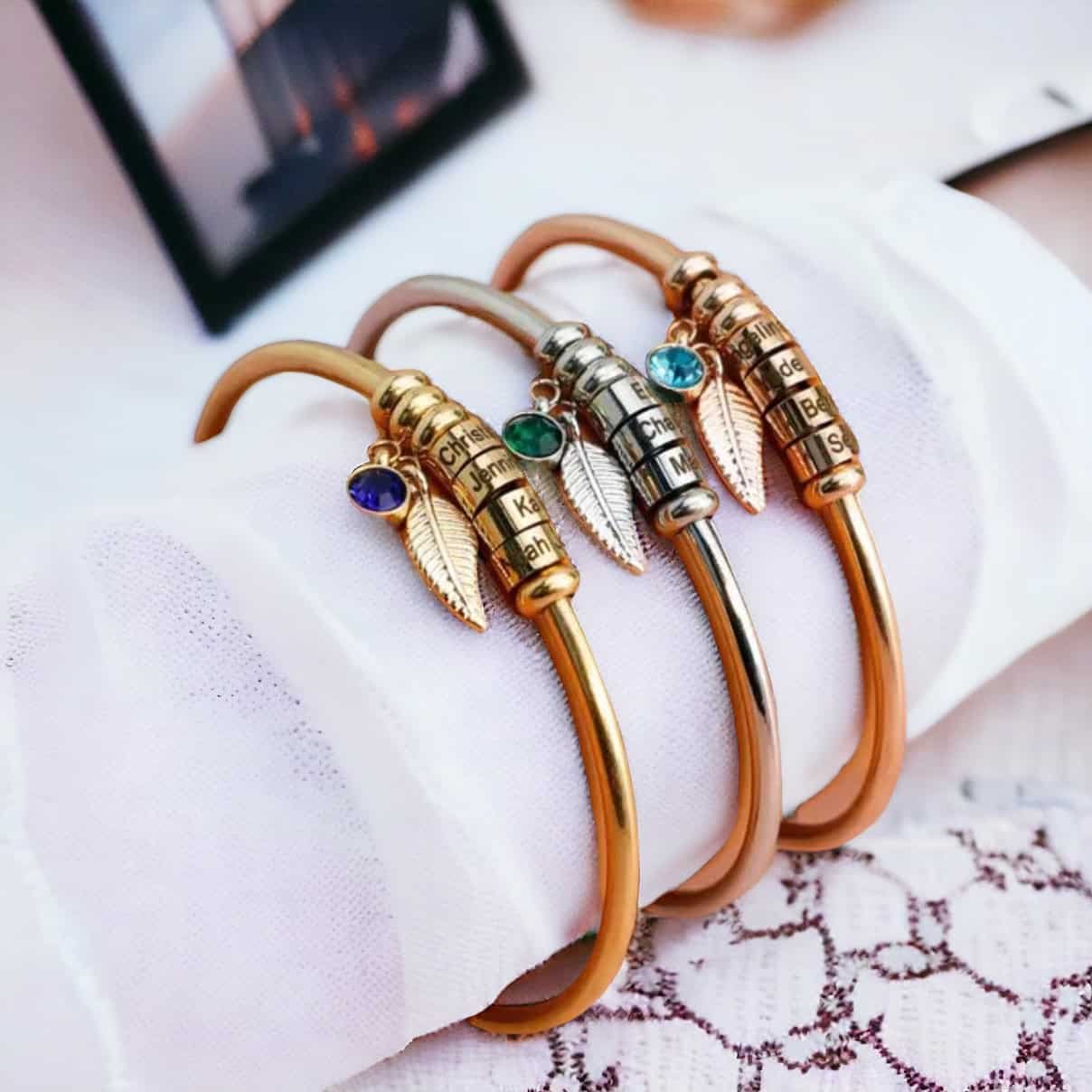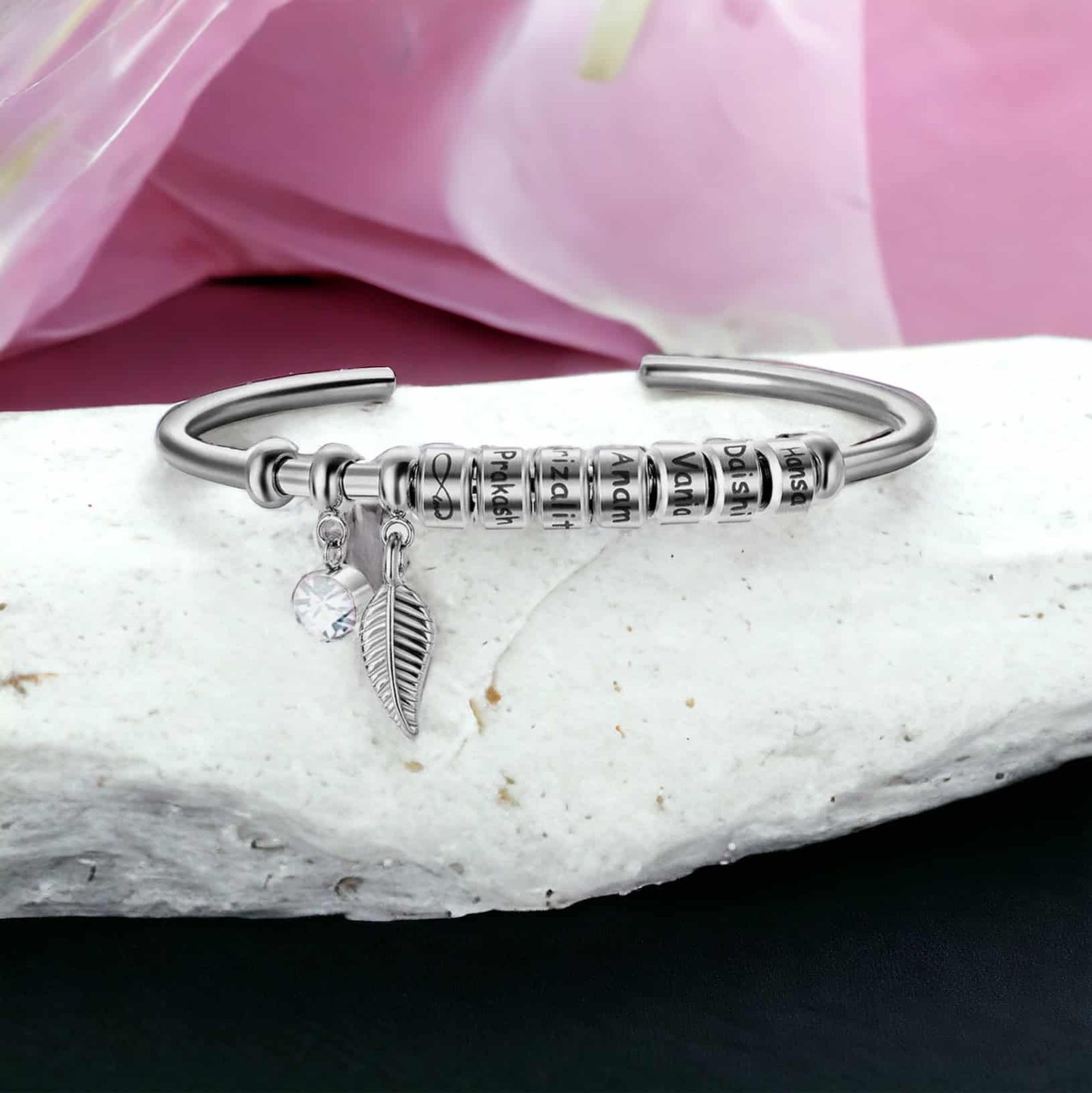 Hand crafted these stunning bracelets feature the birthstone of its wearer accompanied with a leaf, as well as 1-8 beads each engraved with a name . Add the names of each family member, all the kids or grand children, or even the names of your closest friends or fur babies.