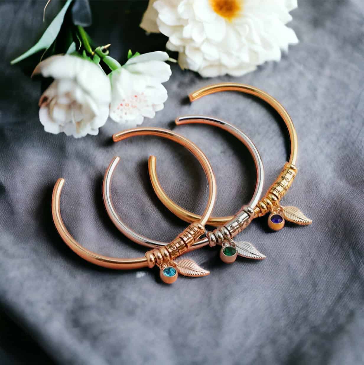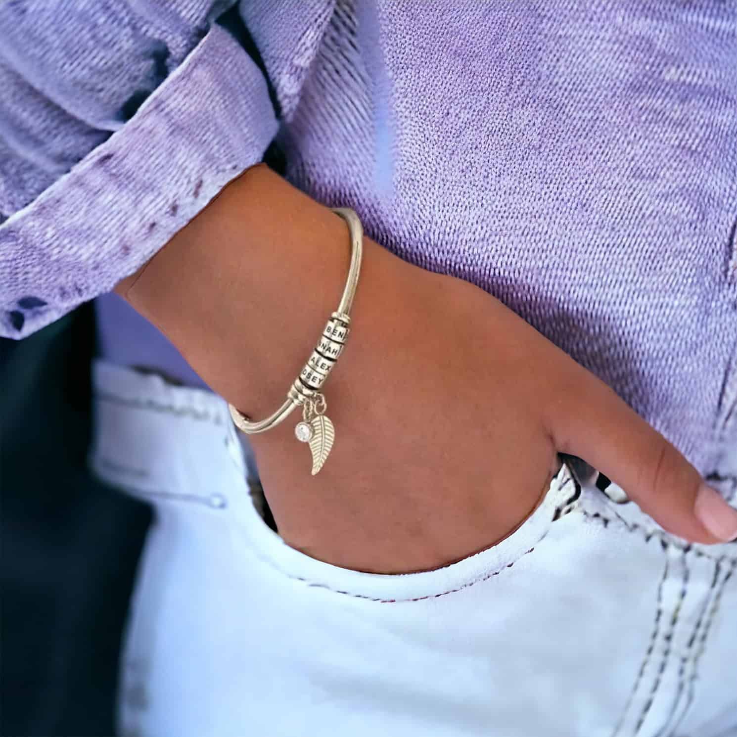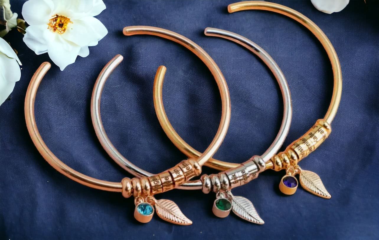 Hand crafted these stunning bracelets feature the birthstone of its wearer accompanied with a leaf, as well as 1-8 beads each engraved with a name . Add the names of each family member, all the kids or grand children, or even the names of your closest friends or fur babies.