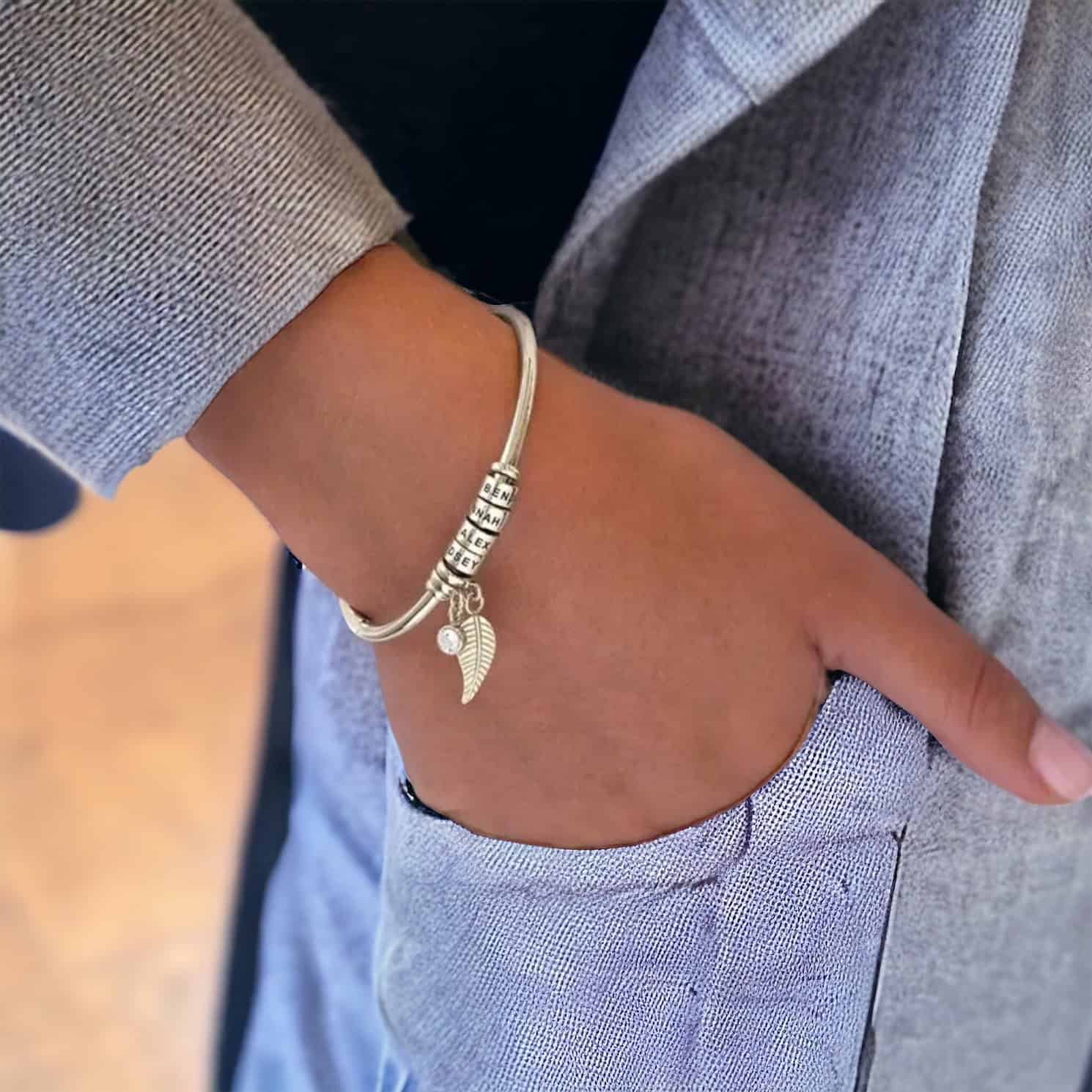 Birthstone Leaf Personalised Bead Bracelet. Elegant design features birthstone and leaf charm in silver, gold or rose gold. Add up to 8 personalised name beads.