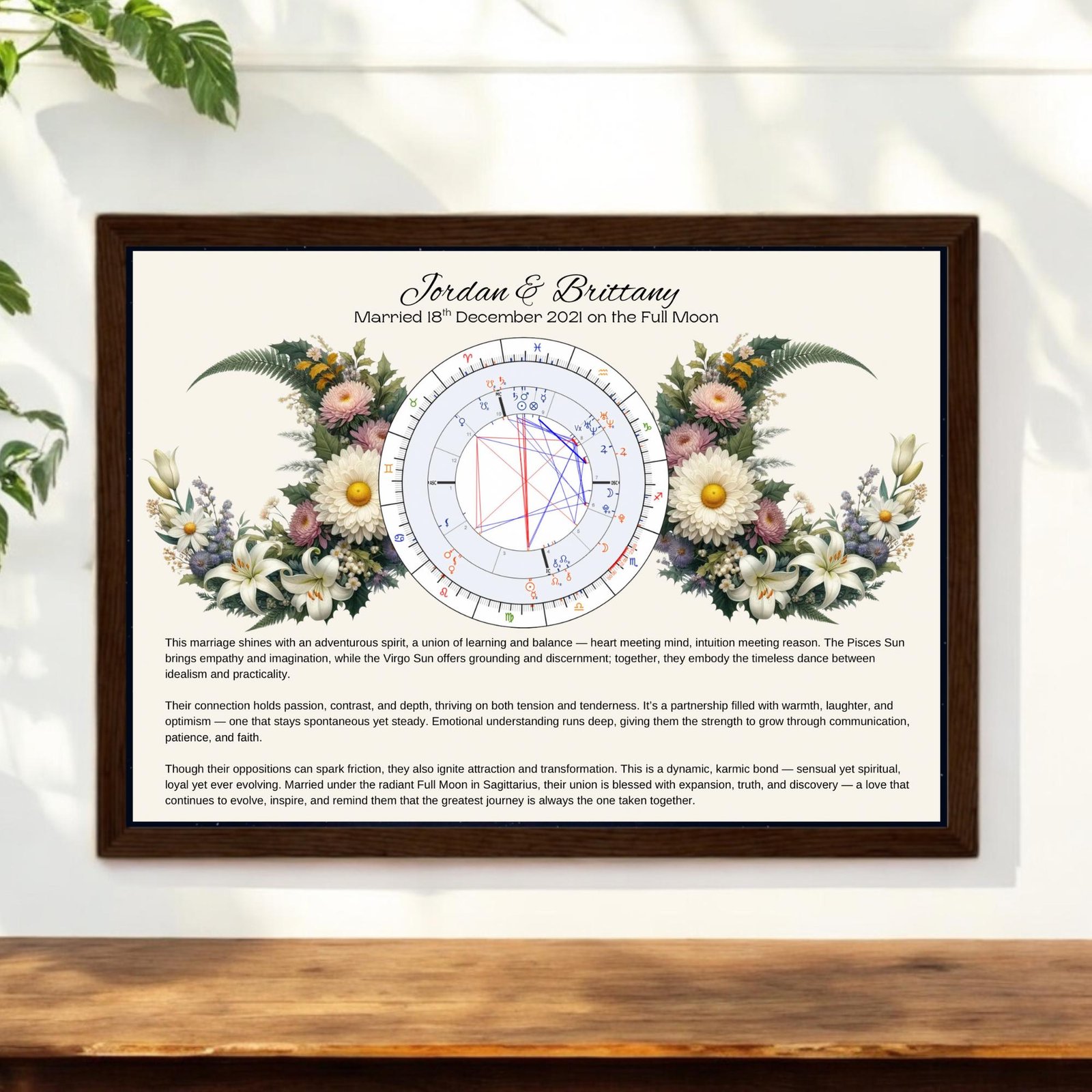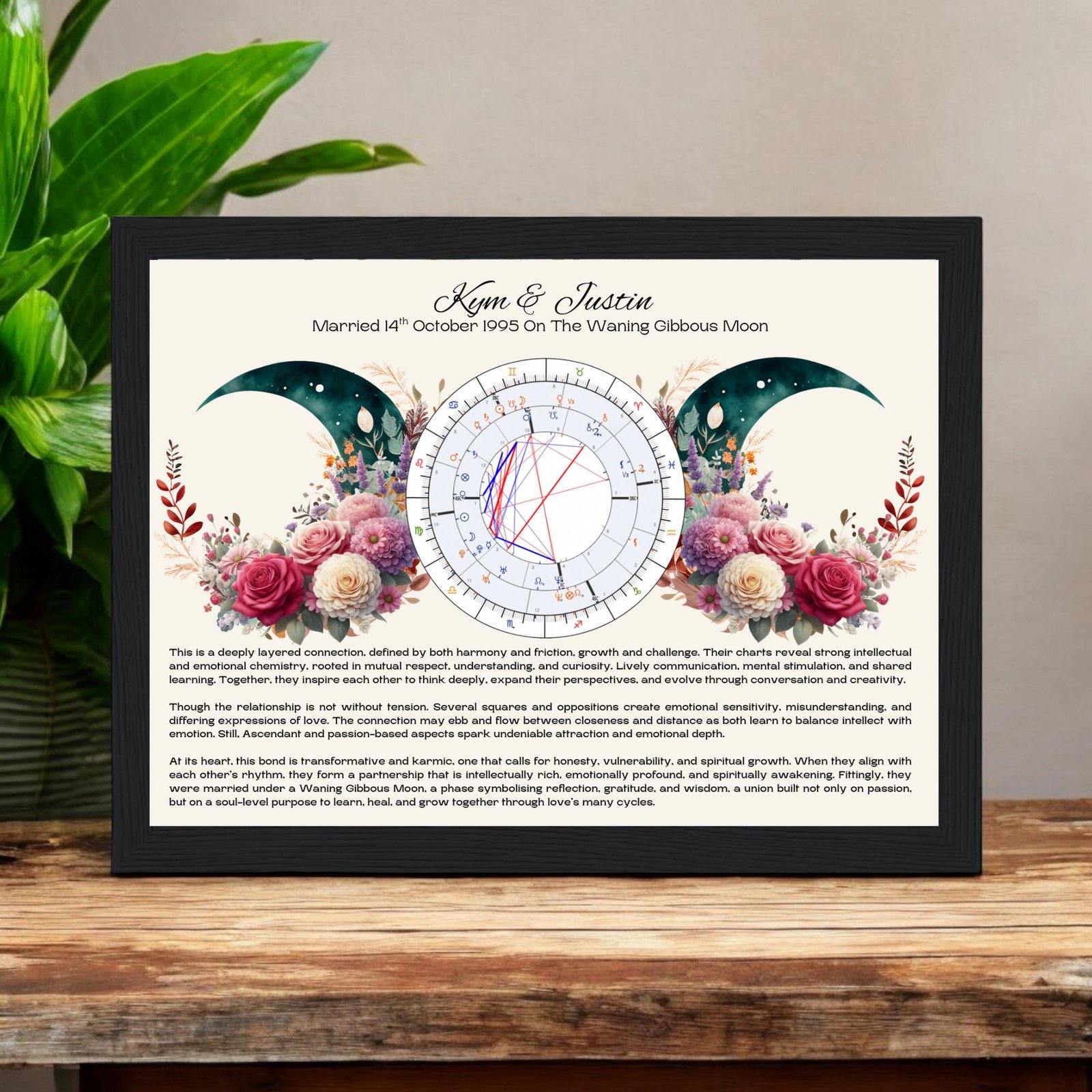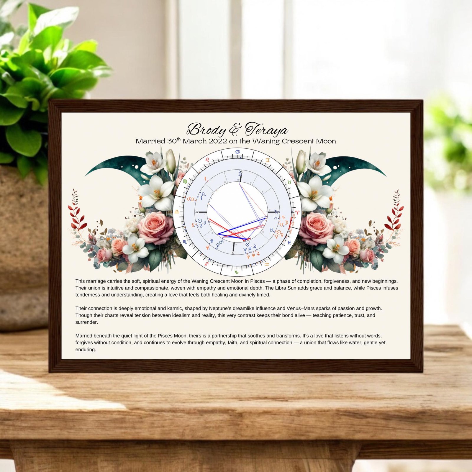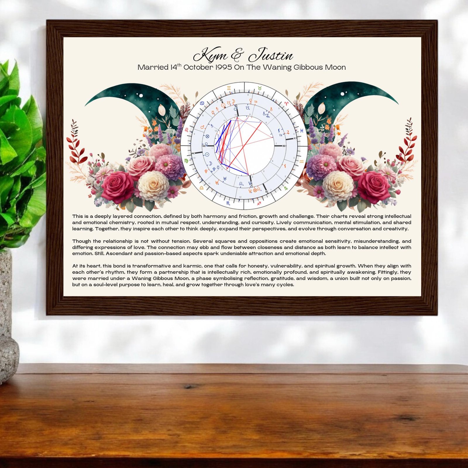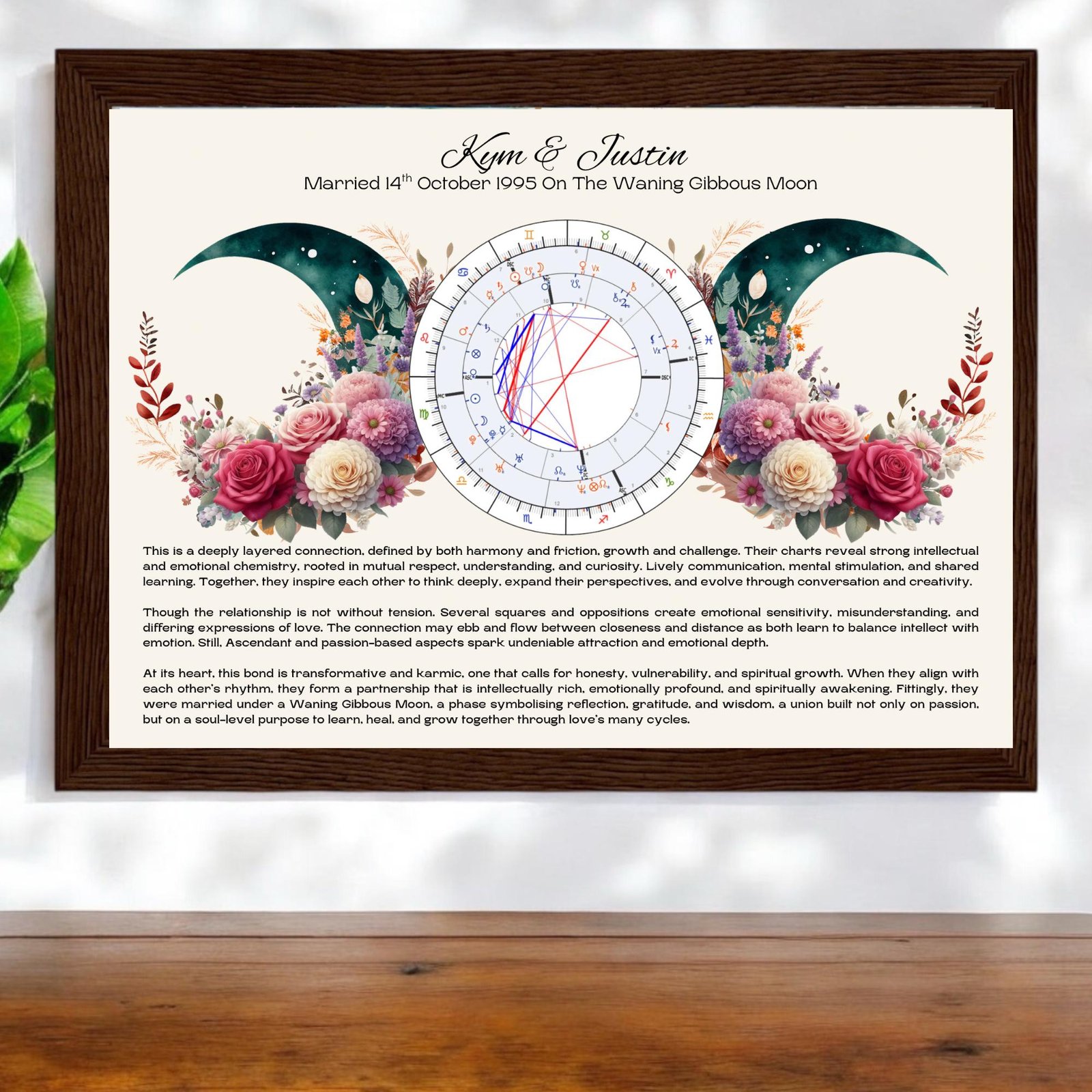 Commemorative Wedding Synastry Chart — Custom Astrology Print with Moon Phase & Birth Flowers