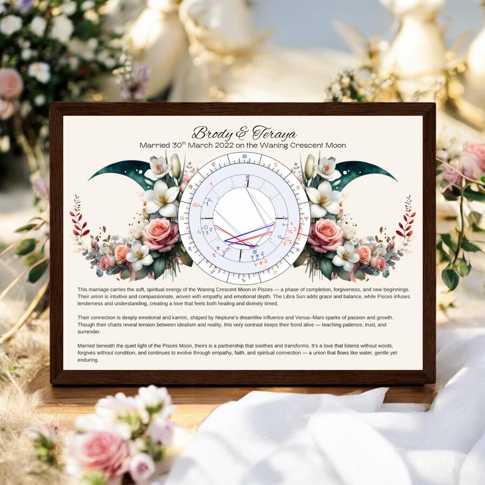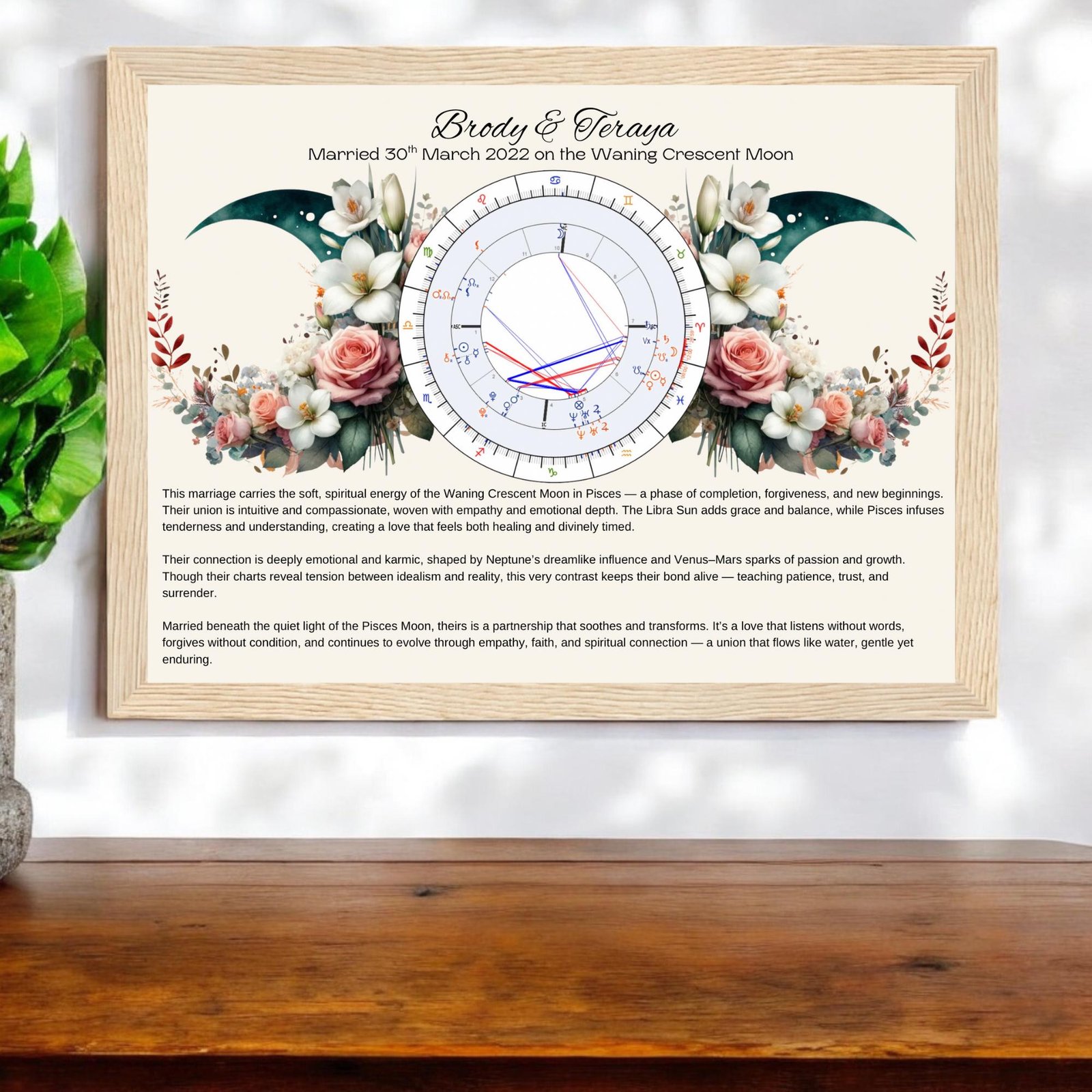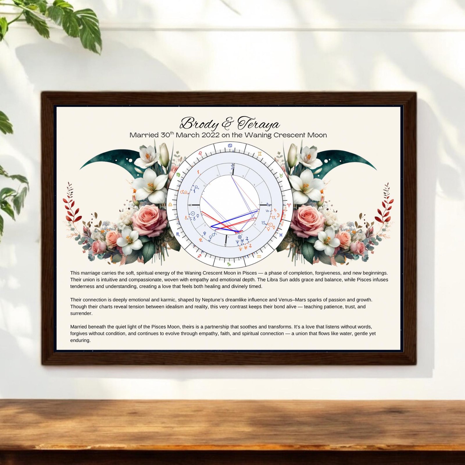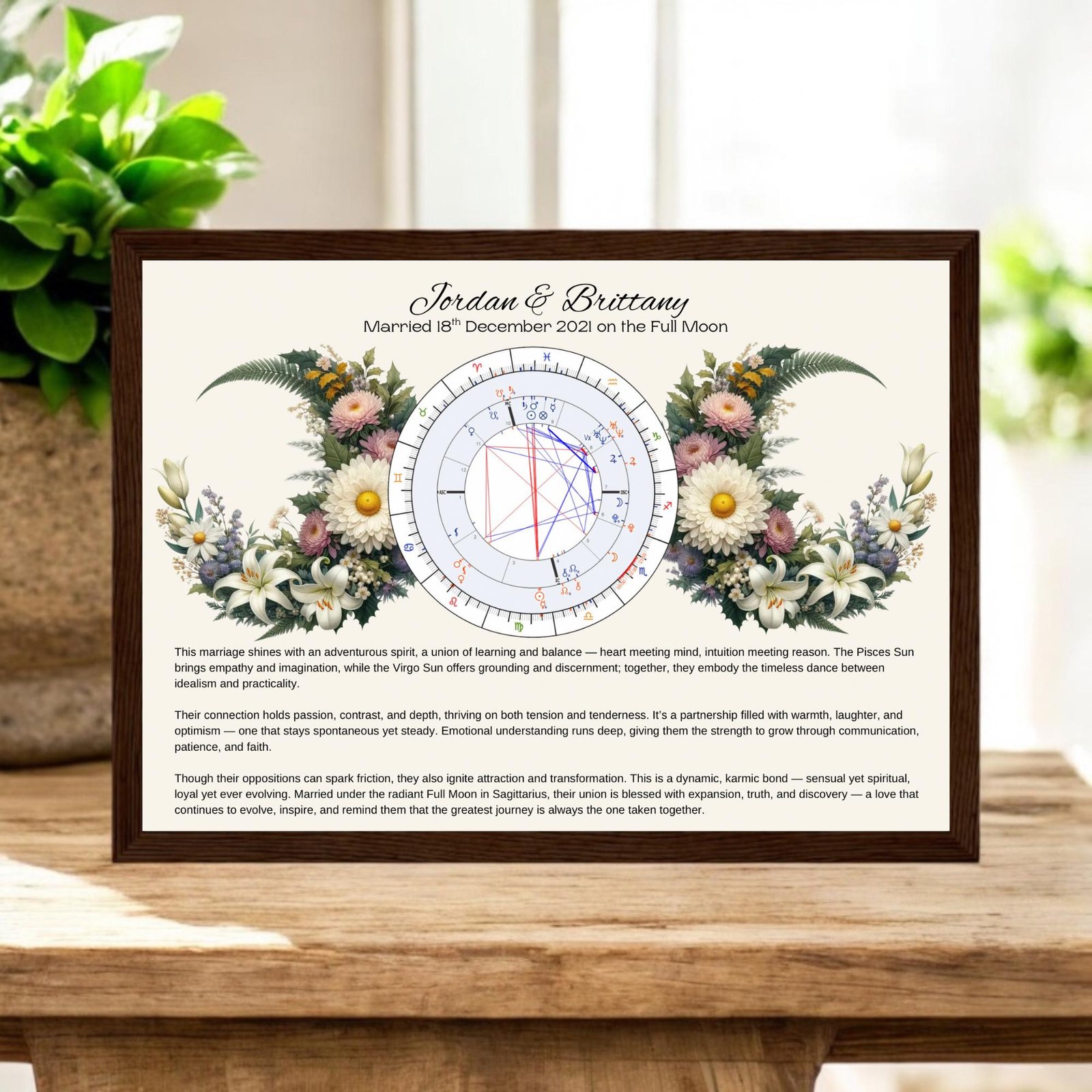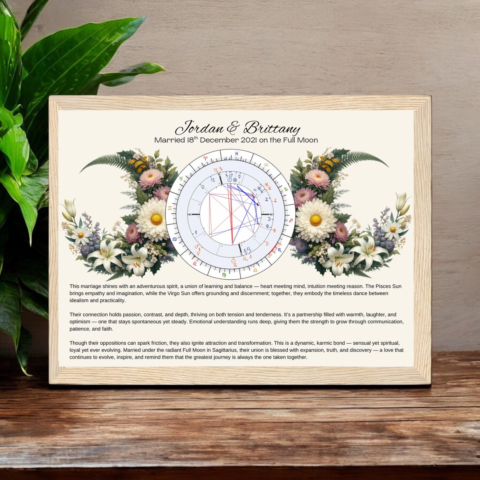 Commemorative Wedding Synastry Chart — Custom Astrology Print with Moon Phase & Birth Flowers