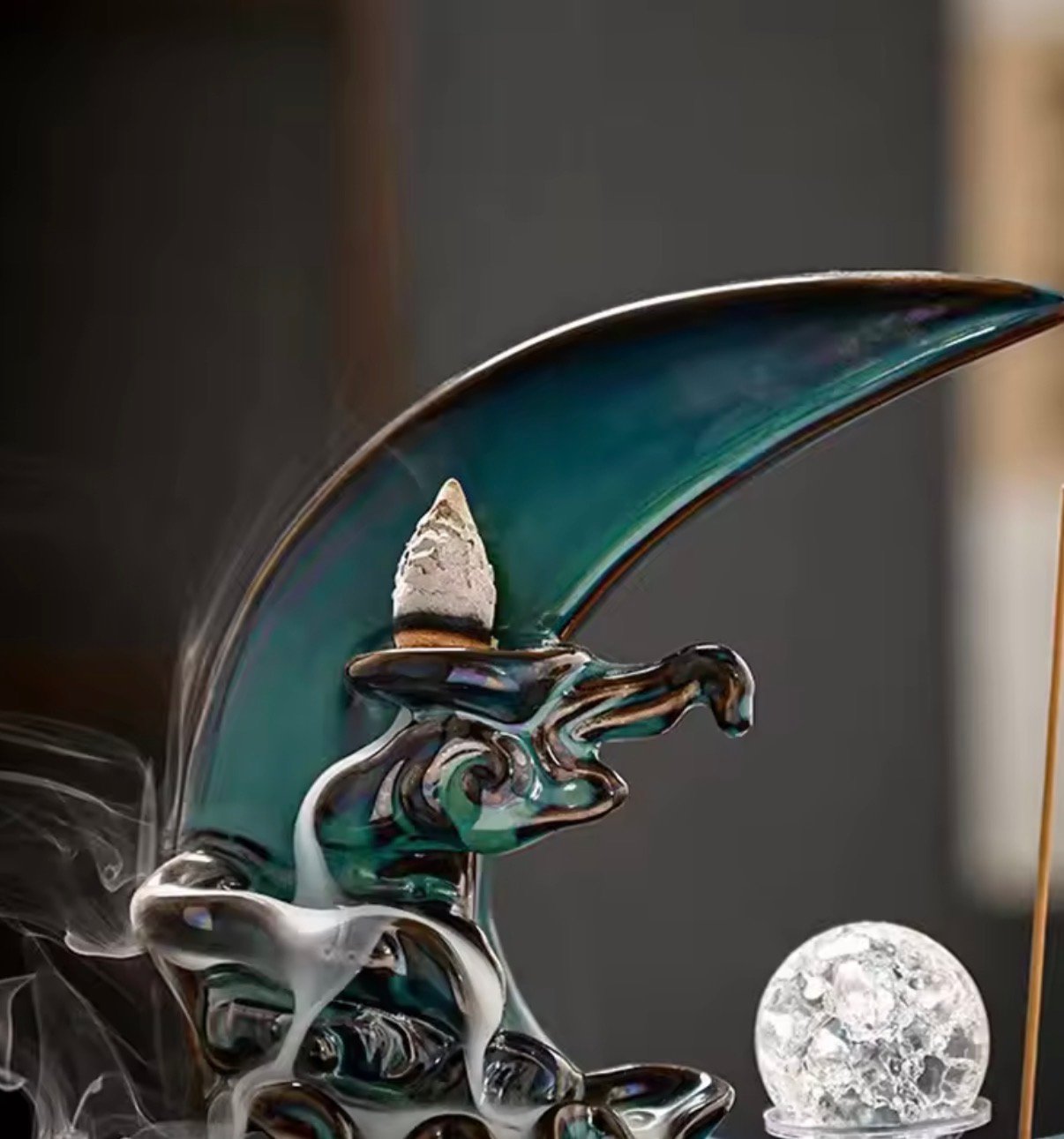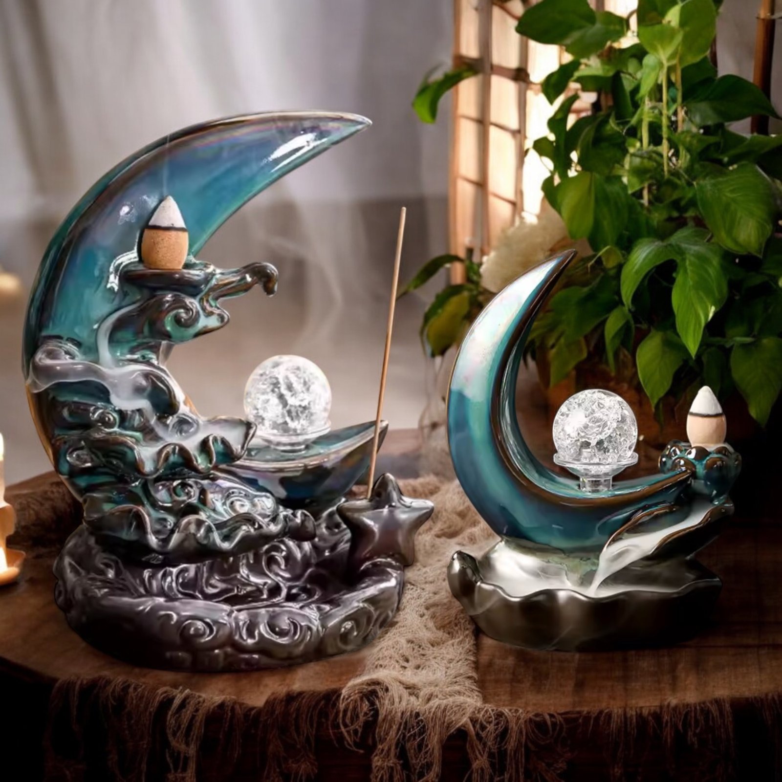 Ceramic crescent moon backflow incense burner for cones. Calming smoke waterfall effect, perfect for relaxation, meditation, and gifting.