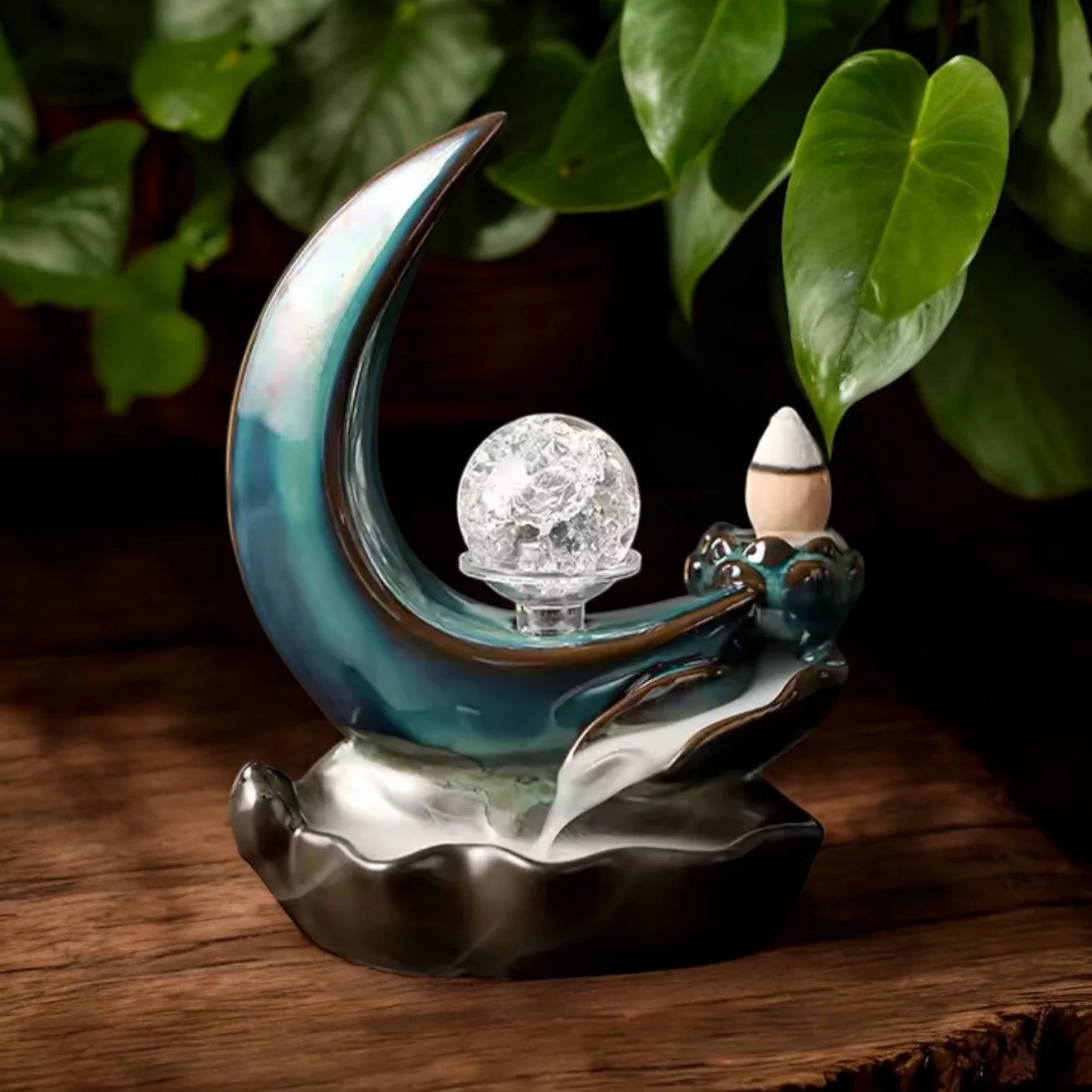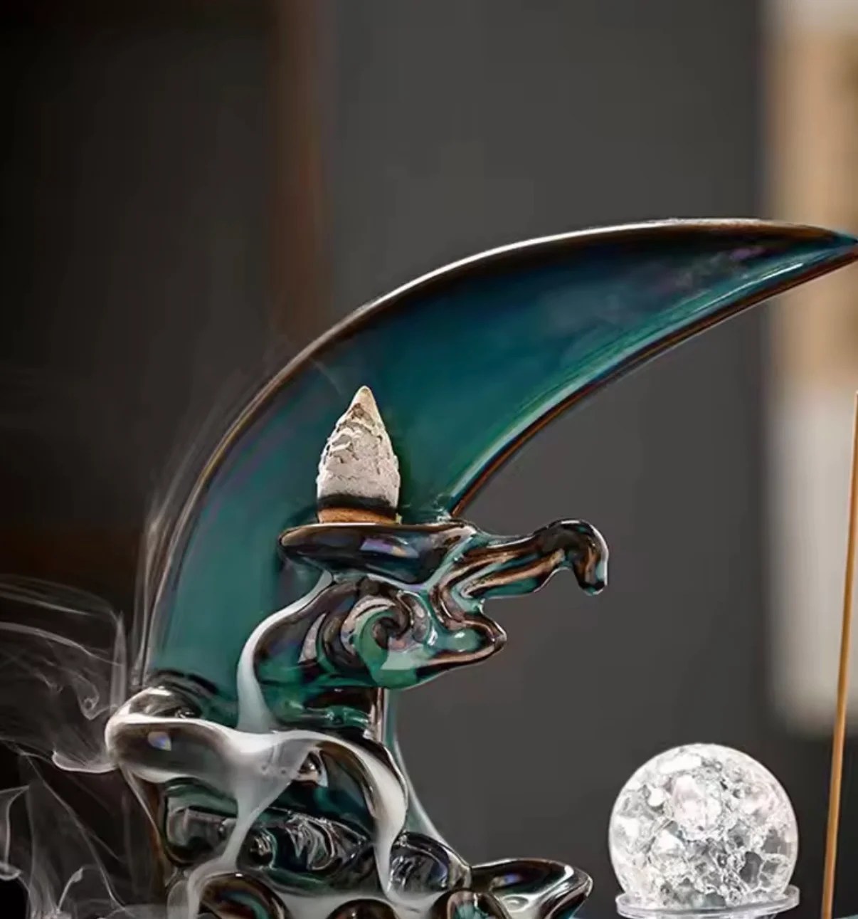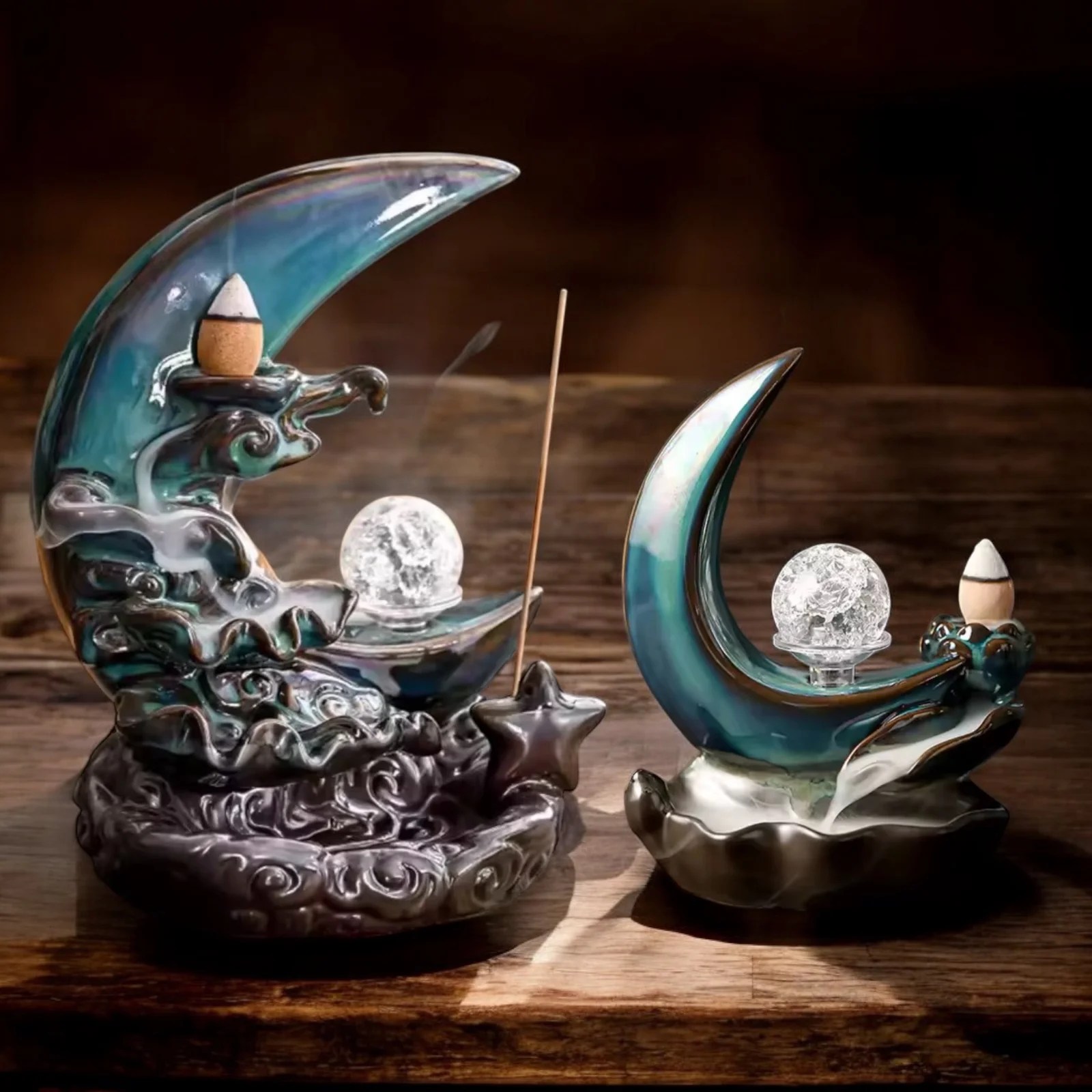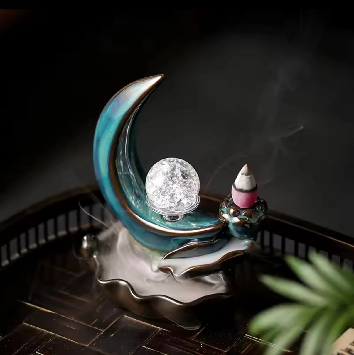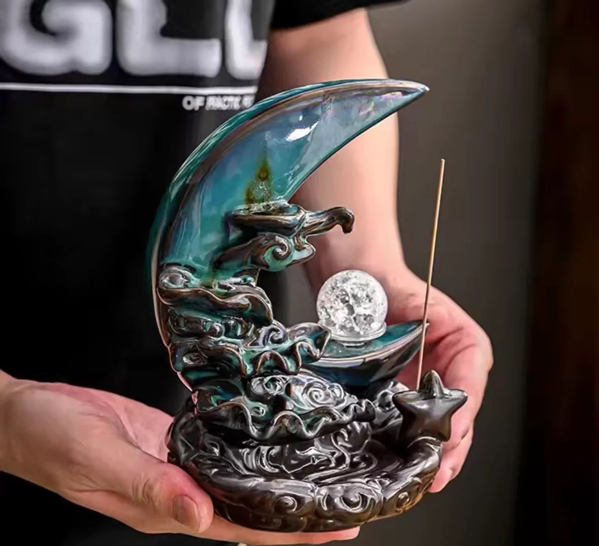 Ceramic crescent moon backflow incense burner for cones. Calming smoke waterfall effect, perfect for relaxation, meditation, and gifting.