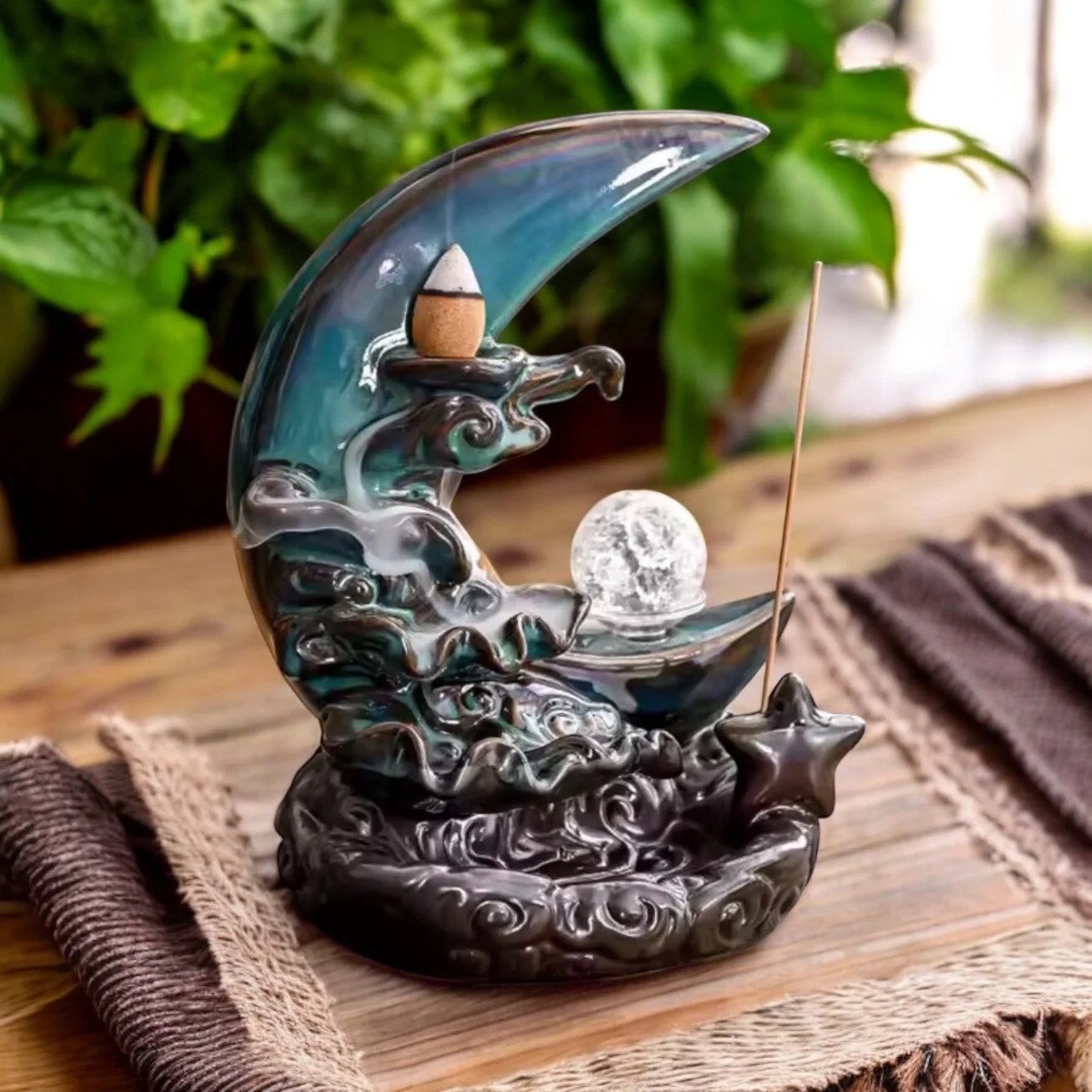 • 🌙 Crescent Moon & Star Burner – Can be used with both backflow incense cones and stick incense. Size: approx. 18 × 14 cm