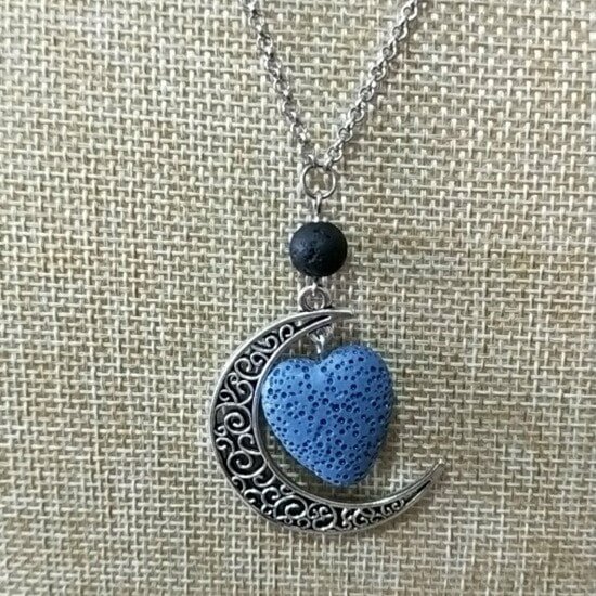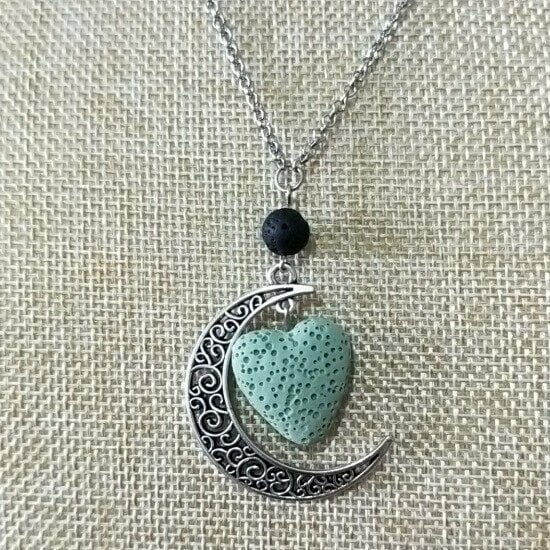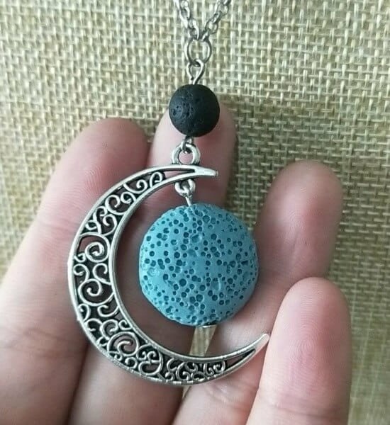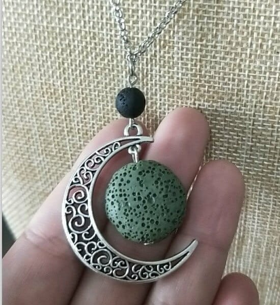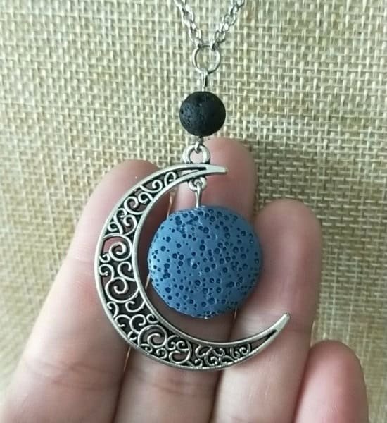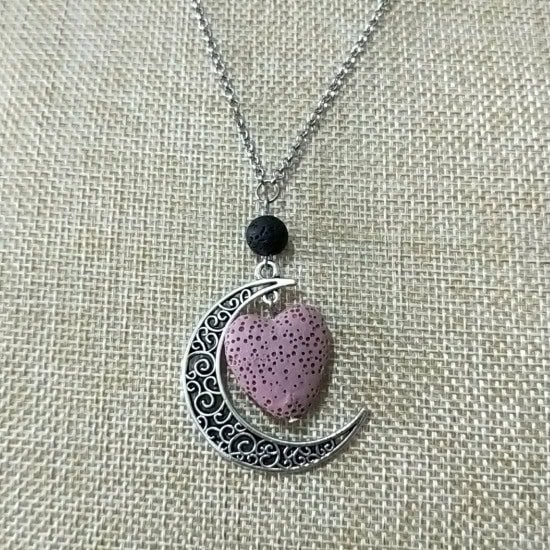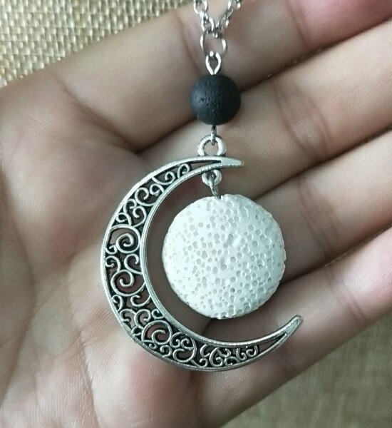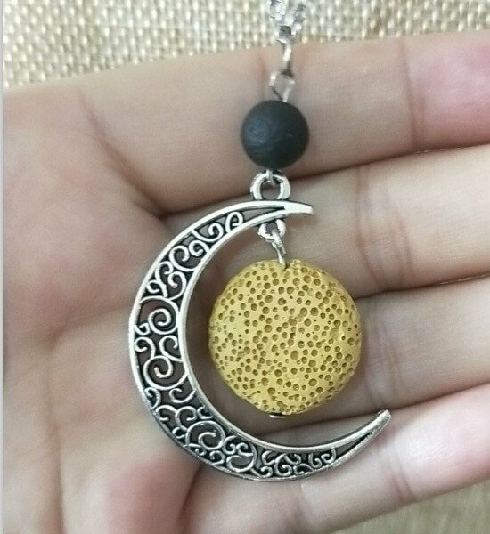 Crescent moon lava bead aroma / perfume necklace. Beautiful silver chain with crescent moon pendant, includes a coloured lava bead.