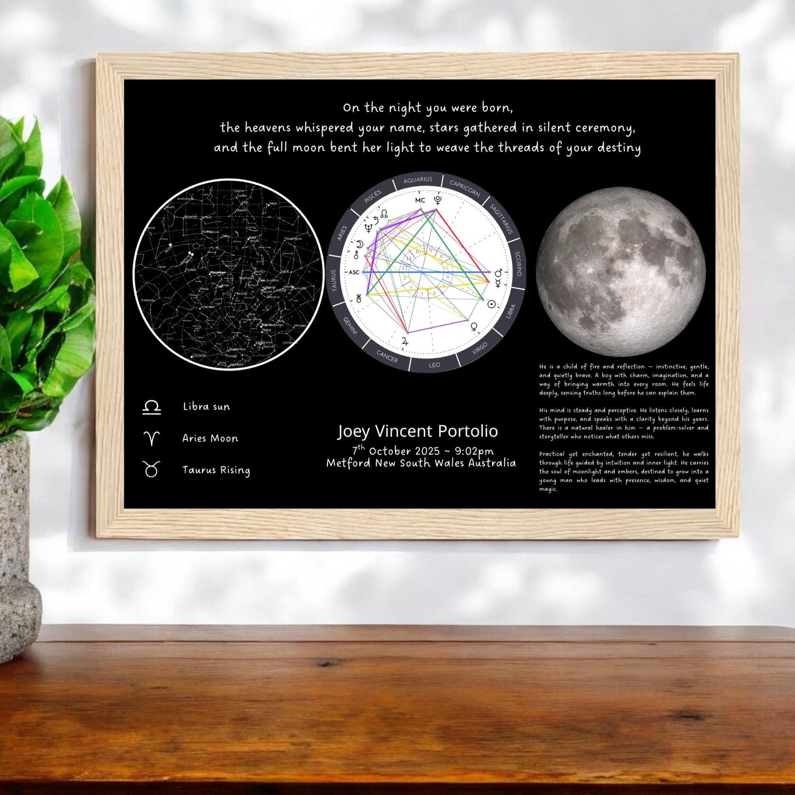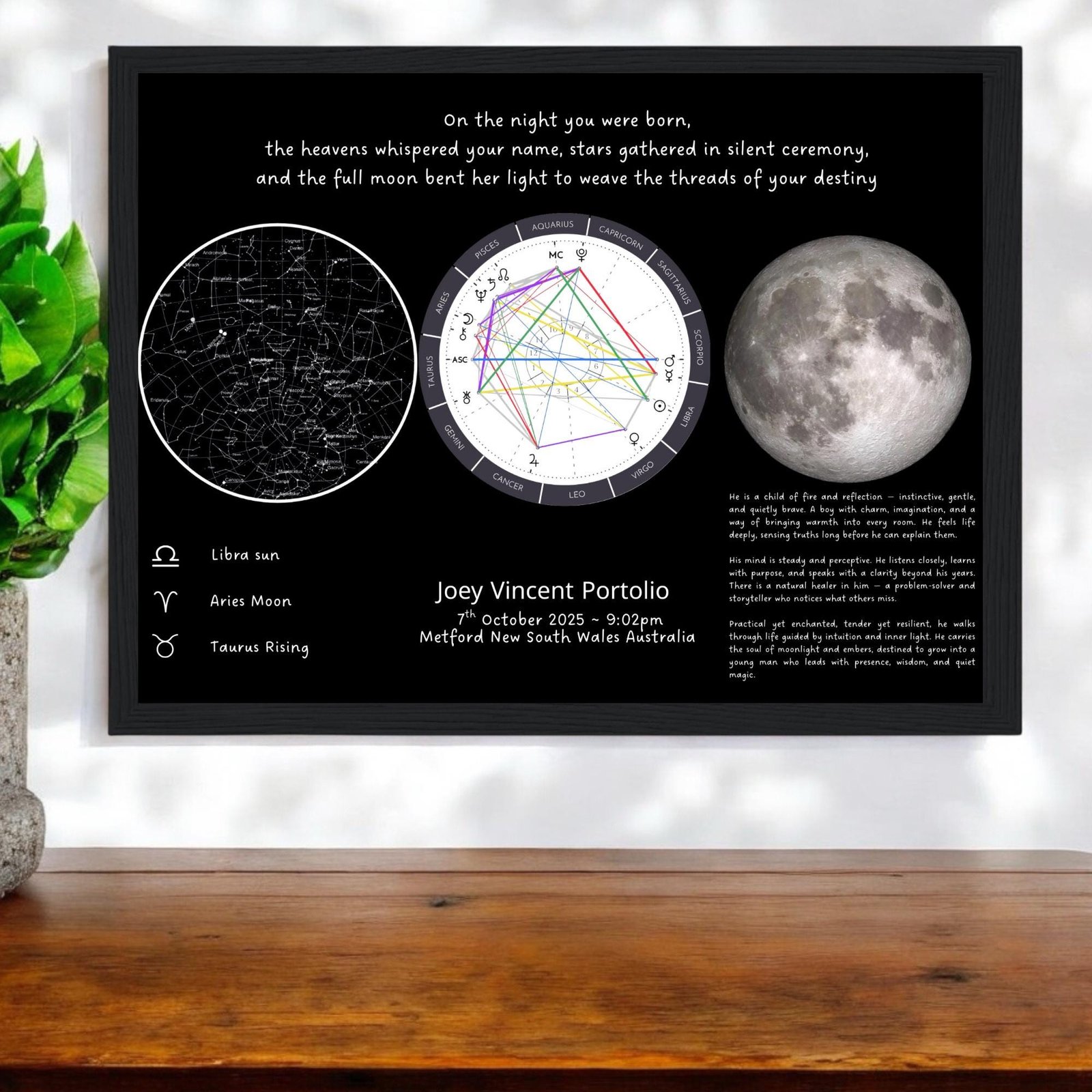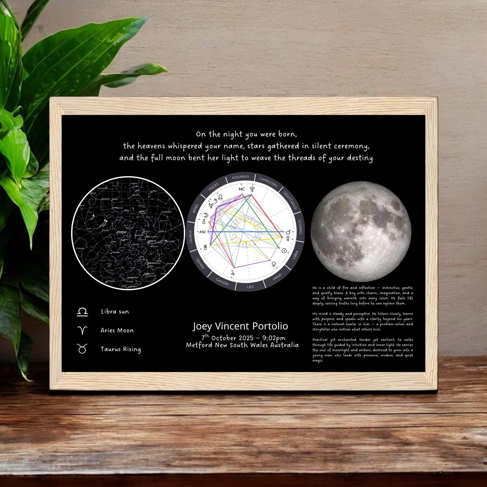 Custom Astrology Triple Chart — Birth Chart • Moon Phase • Night Sky Map • Big 3 Signs & Traits