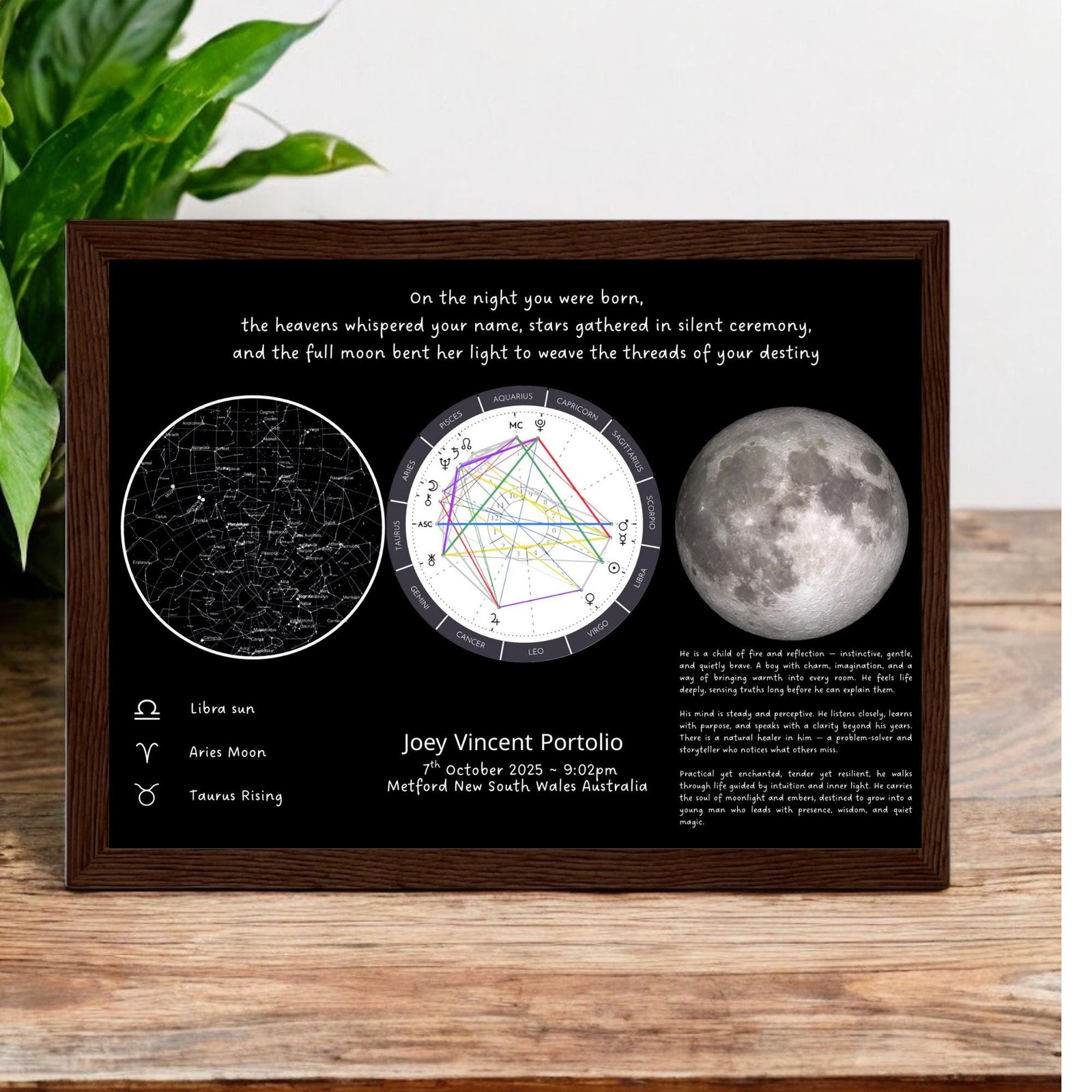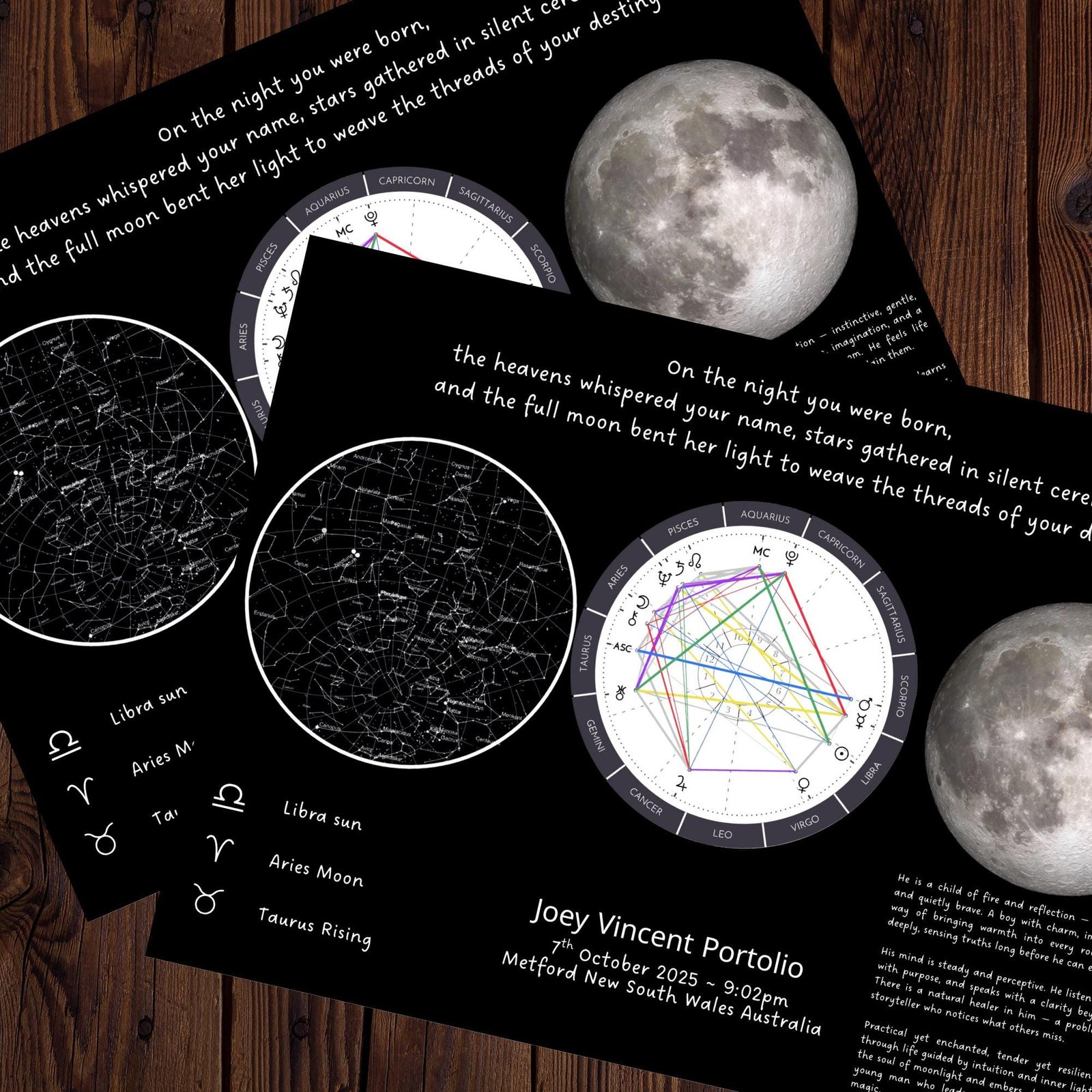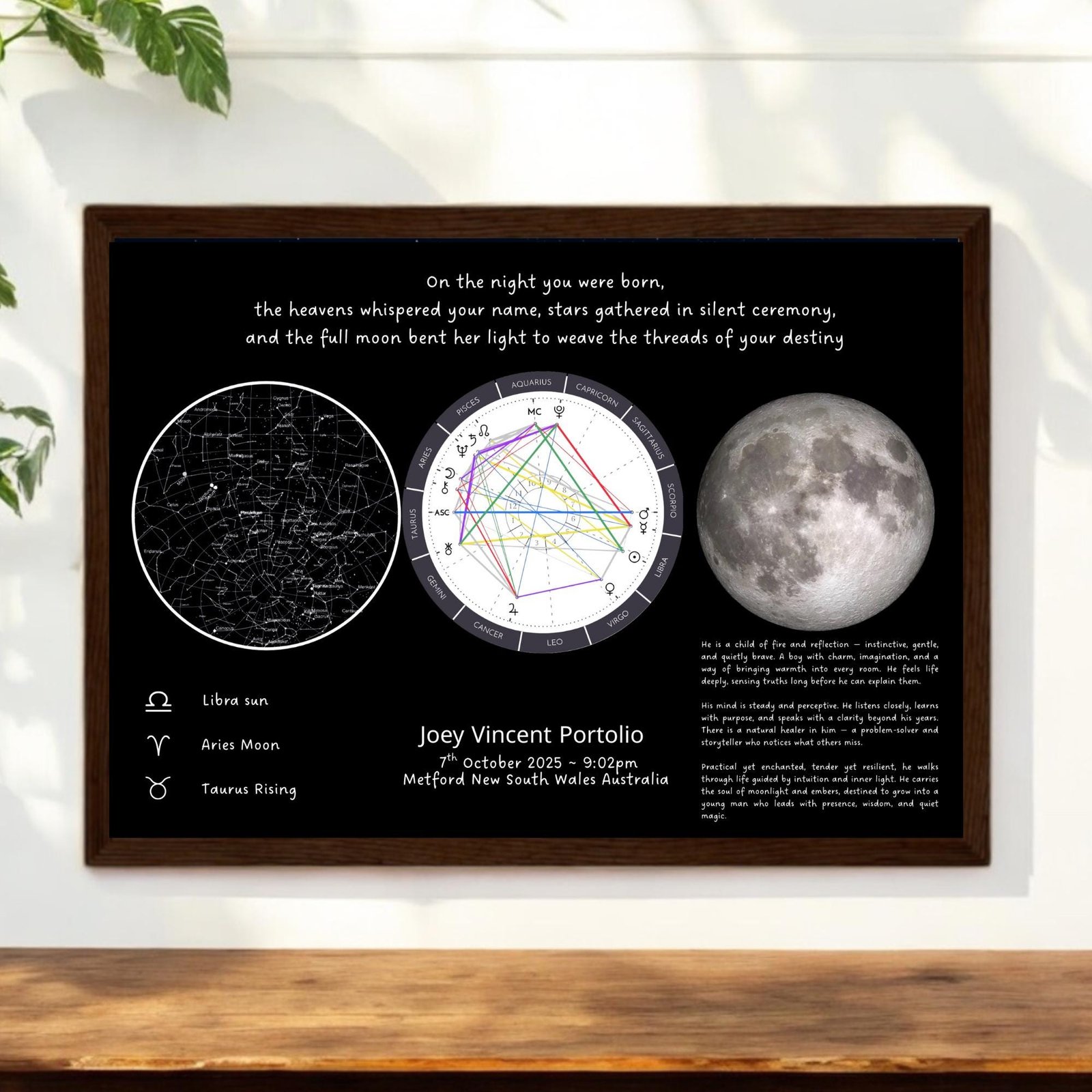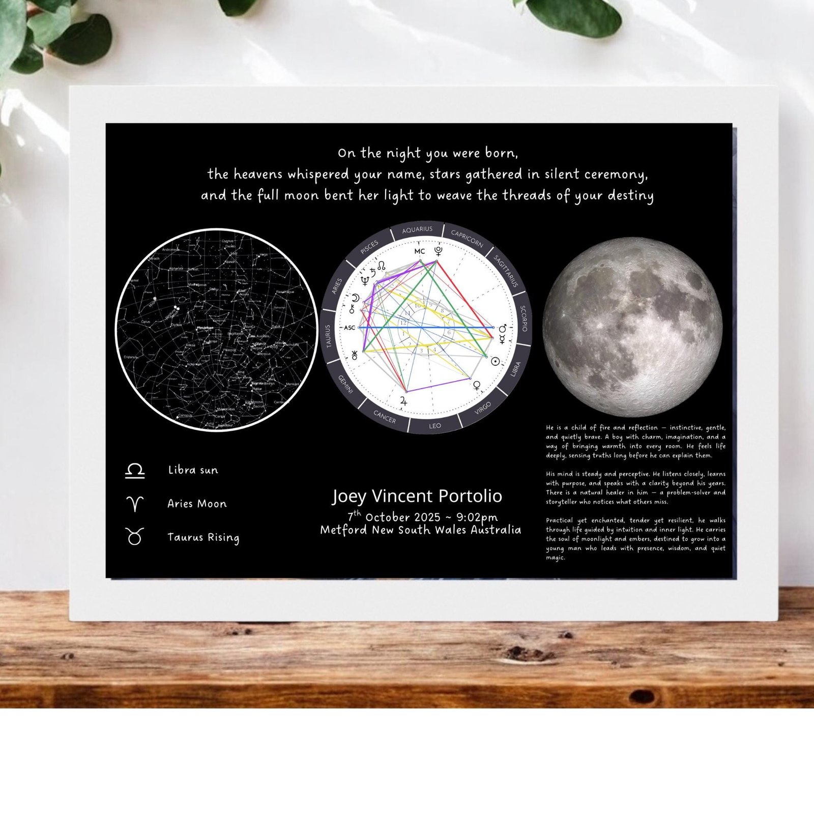 This personalised digital artwork includes the Birth Chart, Moon Phase, Night Sky Map, Big 3 icons, and a custom-written traits section — all created using the exact date, time, and location of birth.