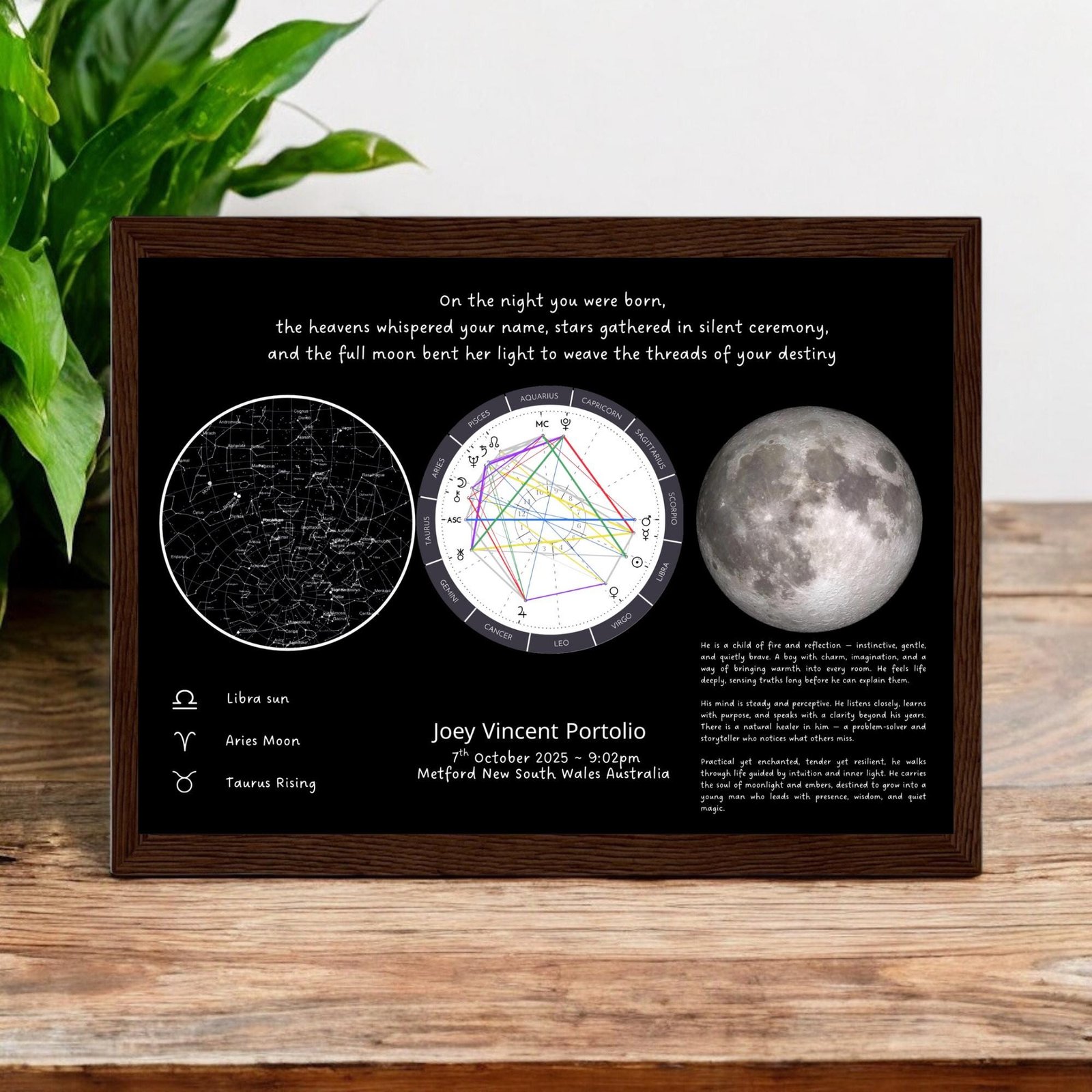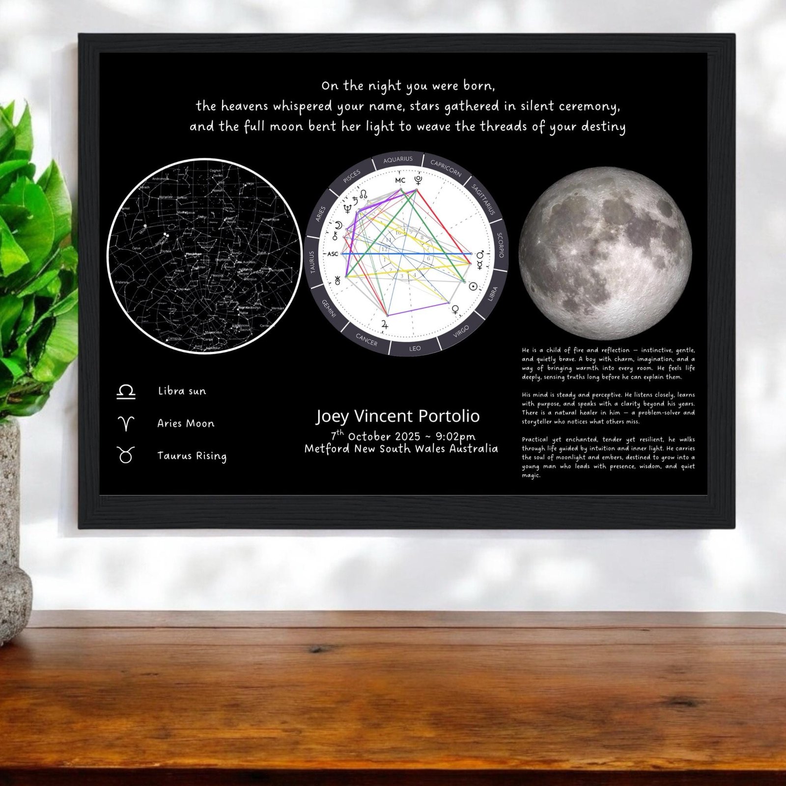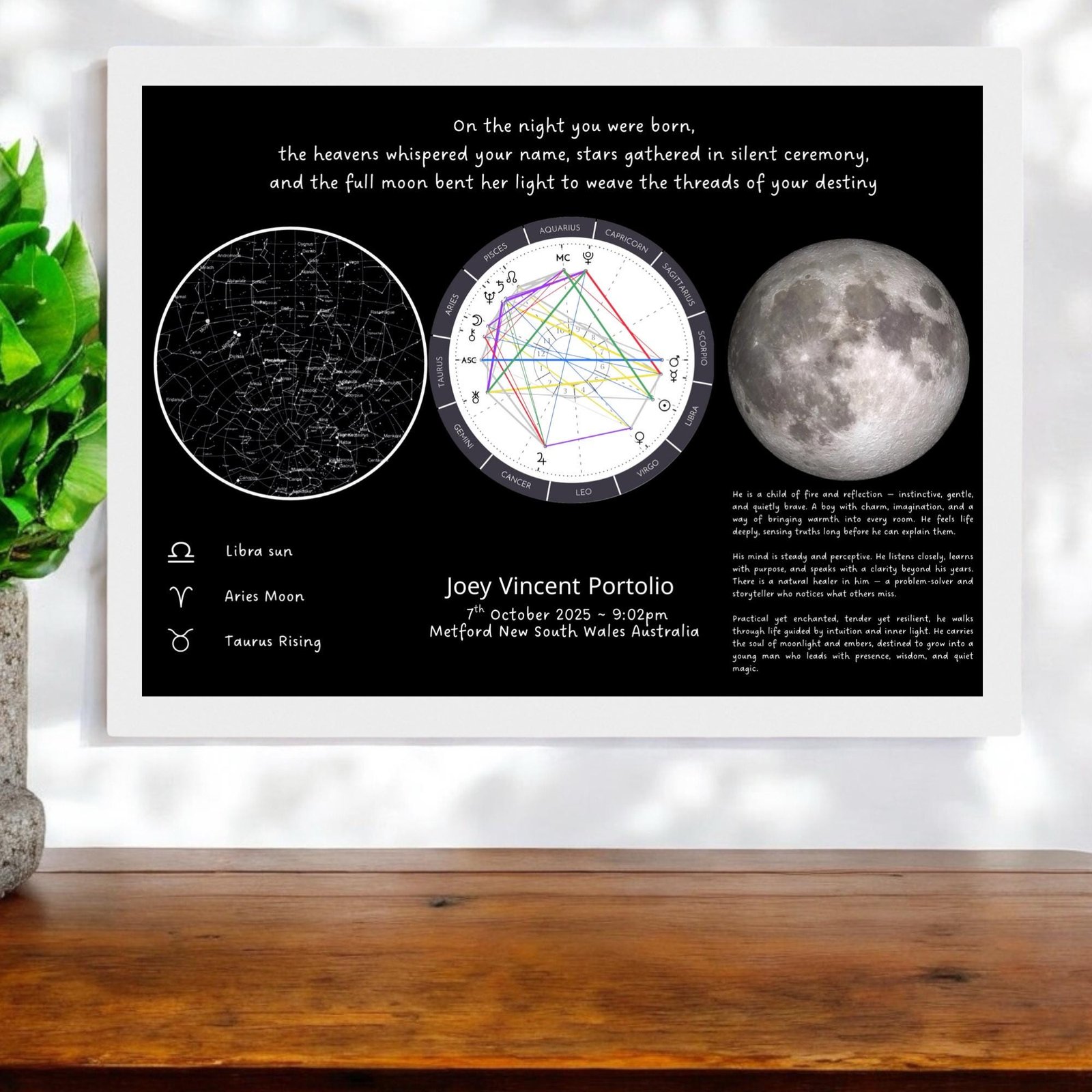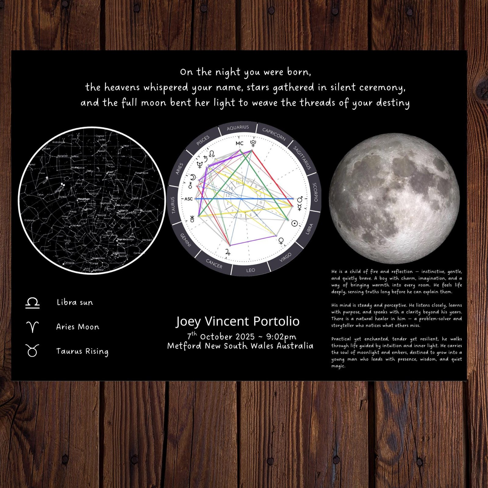 This personalised digital artwork includes the Birth Chart, Moon Phase, Night Sky Map, Big 3 icons, and a custom-written traits section — all created using the exact date, time, and location of birth.