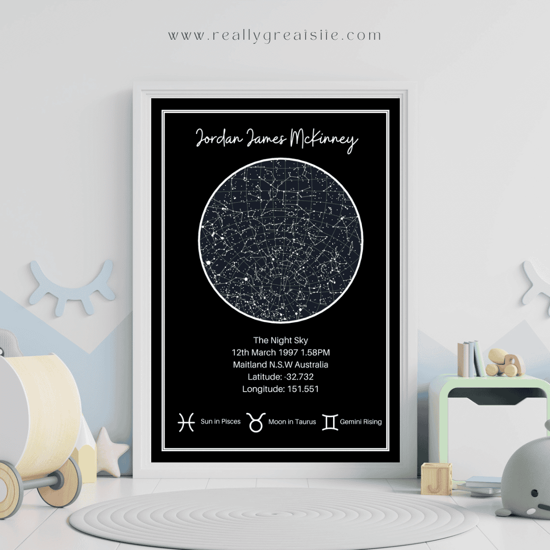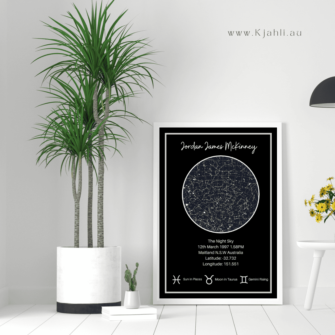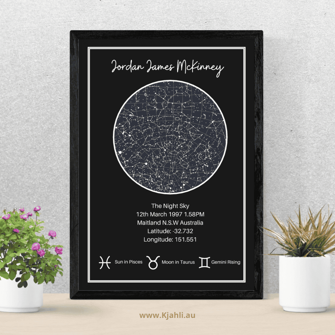 Step into a universe of extraordinary connections and treasured memories with our remarkable collection of night sky prints. Each moment holds immense significance, from the night sky that witnessed your birth. Or to the magical encounter that brought loved ones together. Our timeless frames capture the the stars, moon, constellations, and planets exactly as the where at the time of your special occasion.