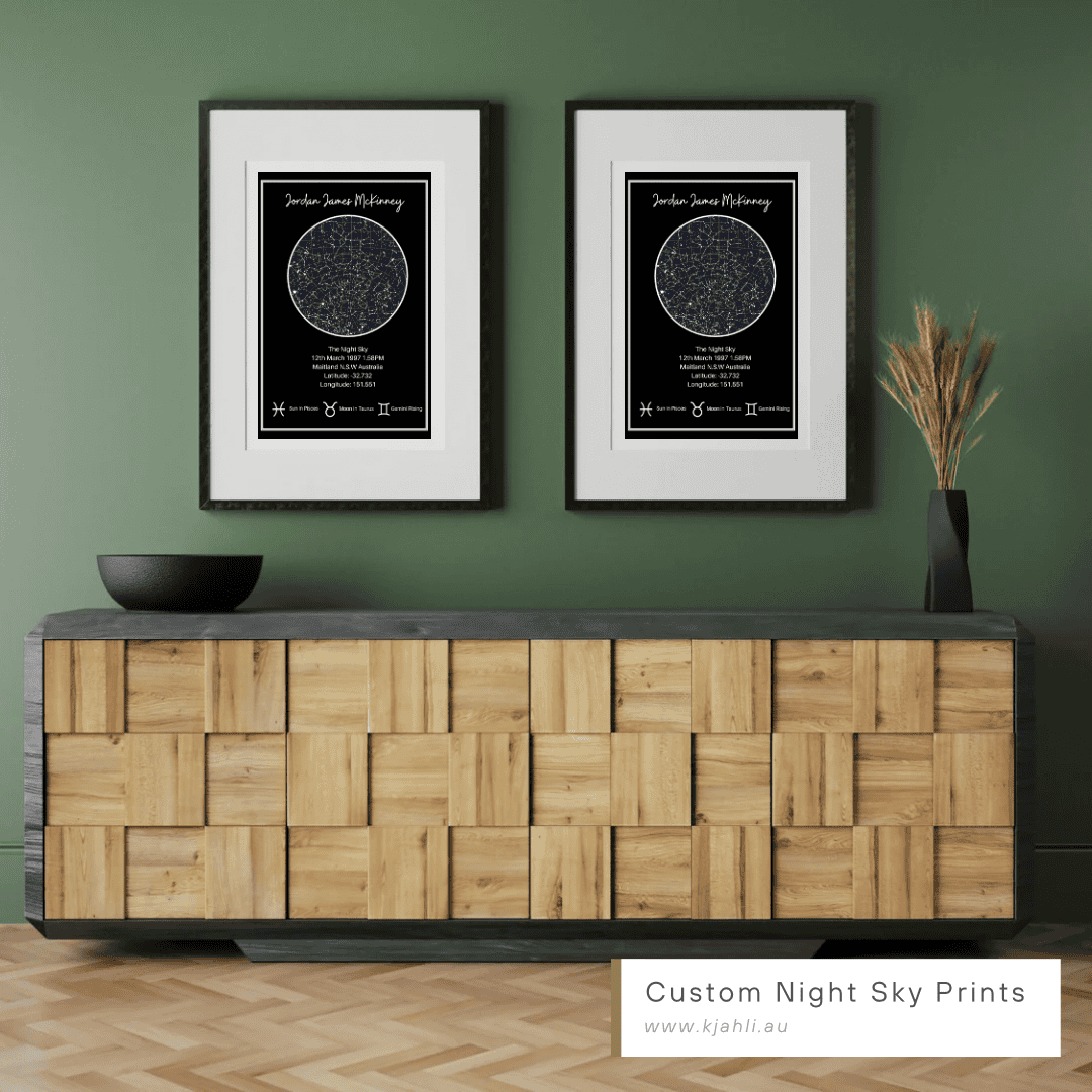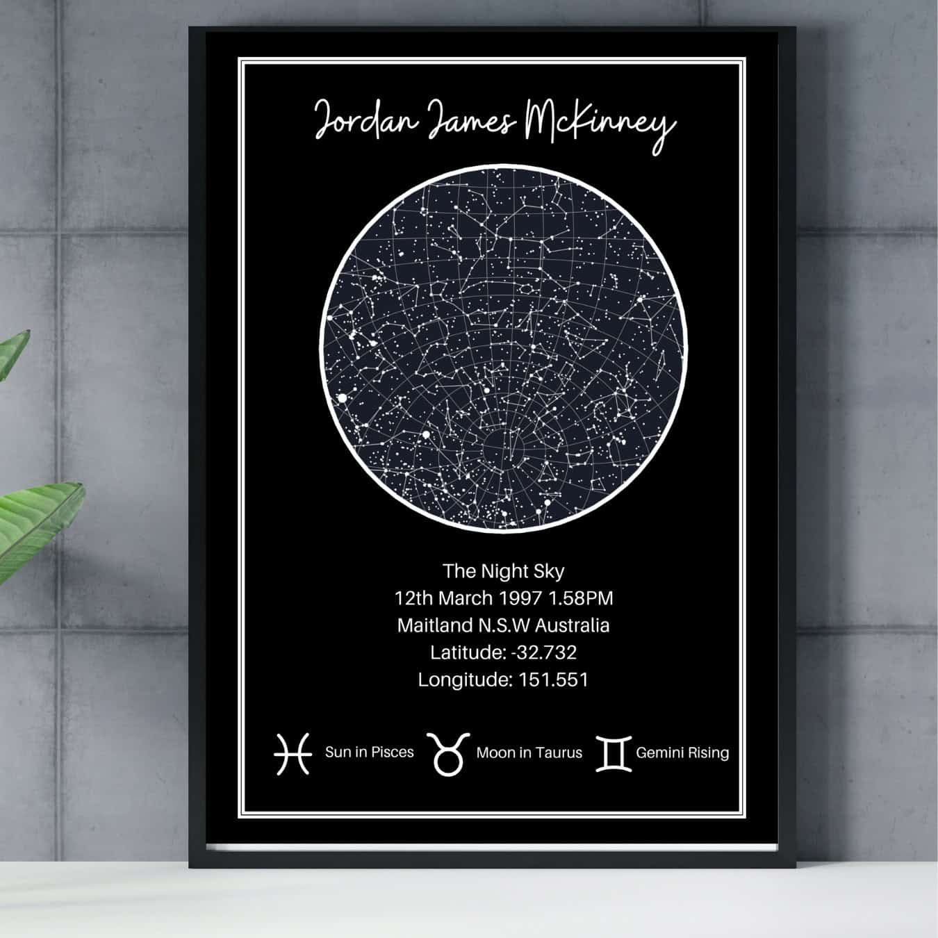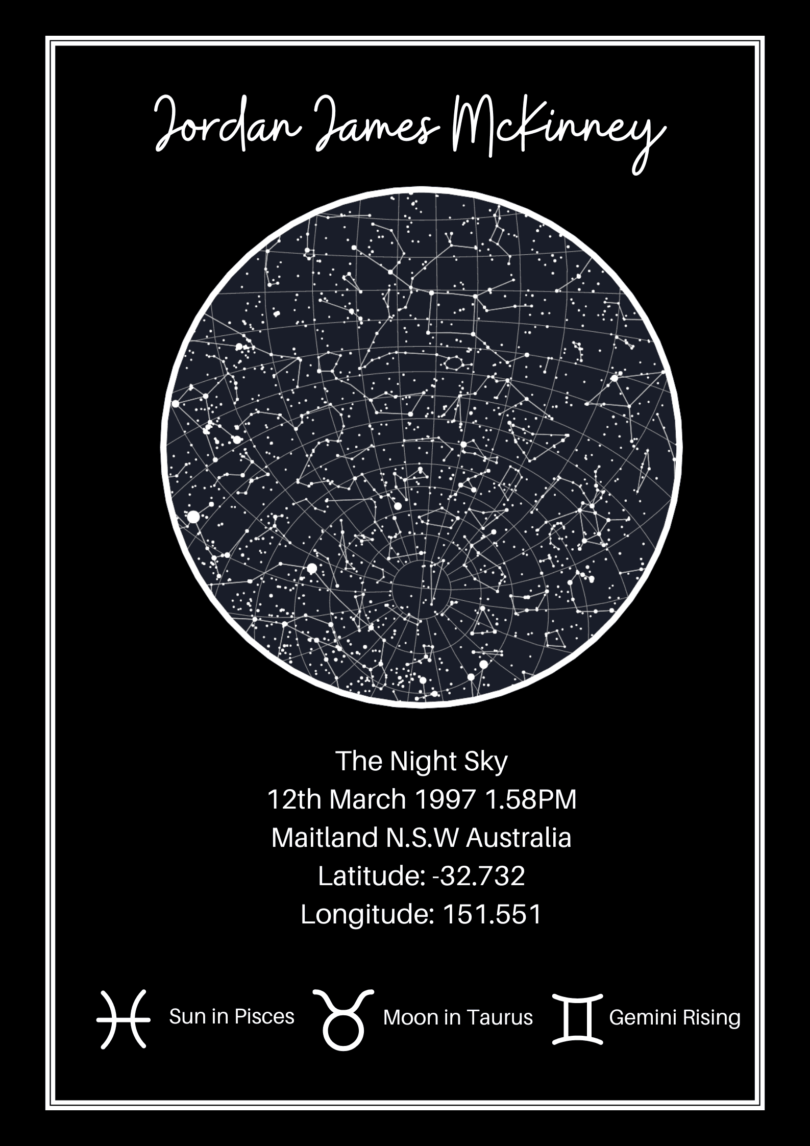Step into a universe of extraordinary connections and treasured memories with our remarkable collection of night sky prints. Each moment holds immense significance, from the night sky that witnessed your birth. Or to the magical encounter that brought loved ones together. Our timeless frames capture the the stars, moon, constellations, and planets exactly as the where at the time of your special occasion.
