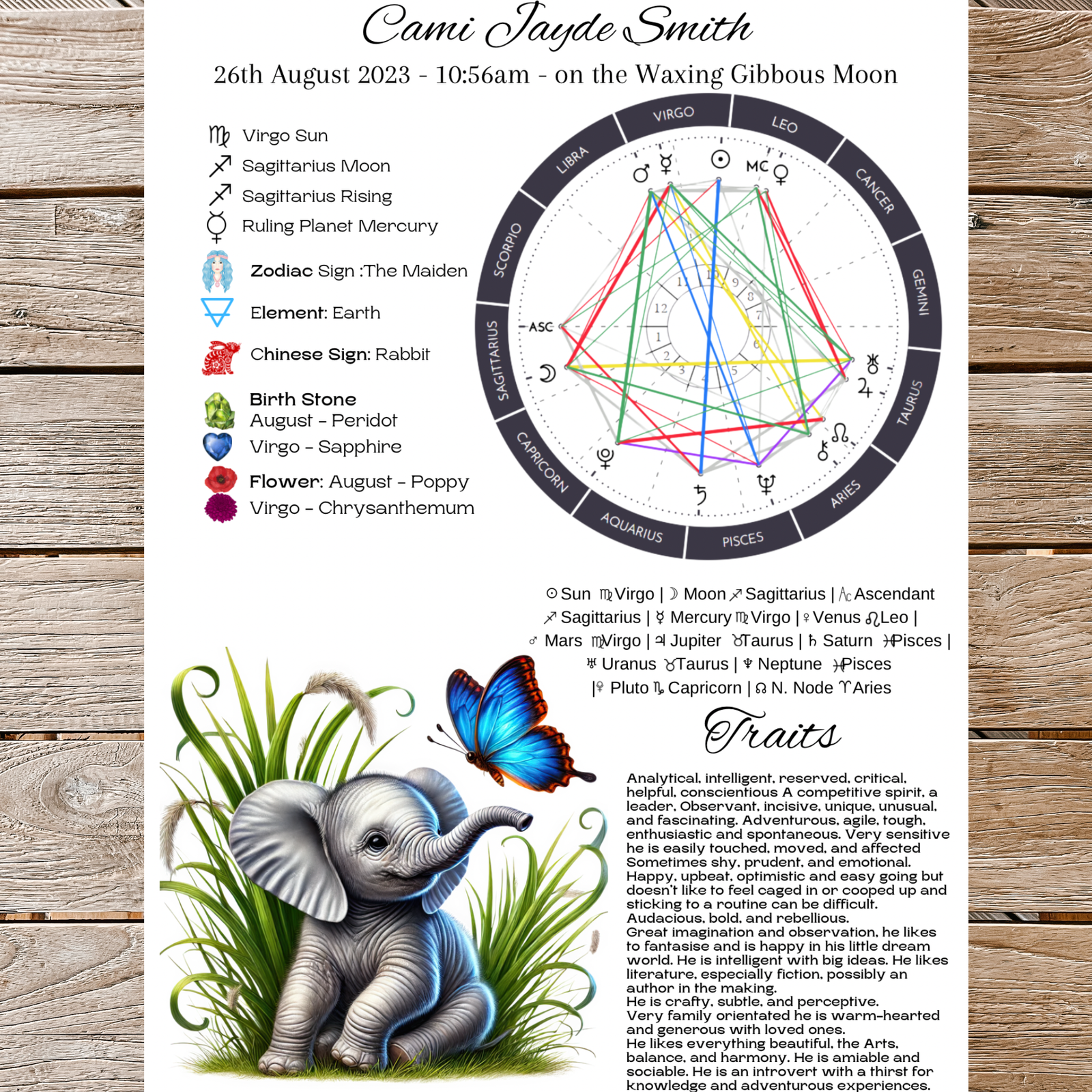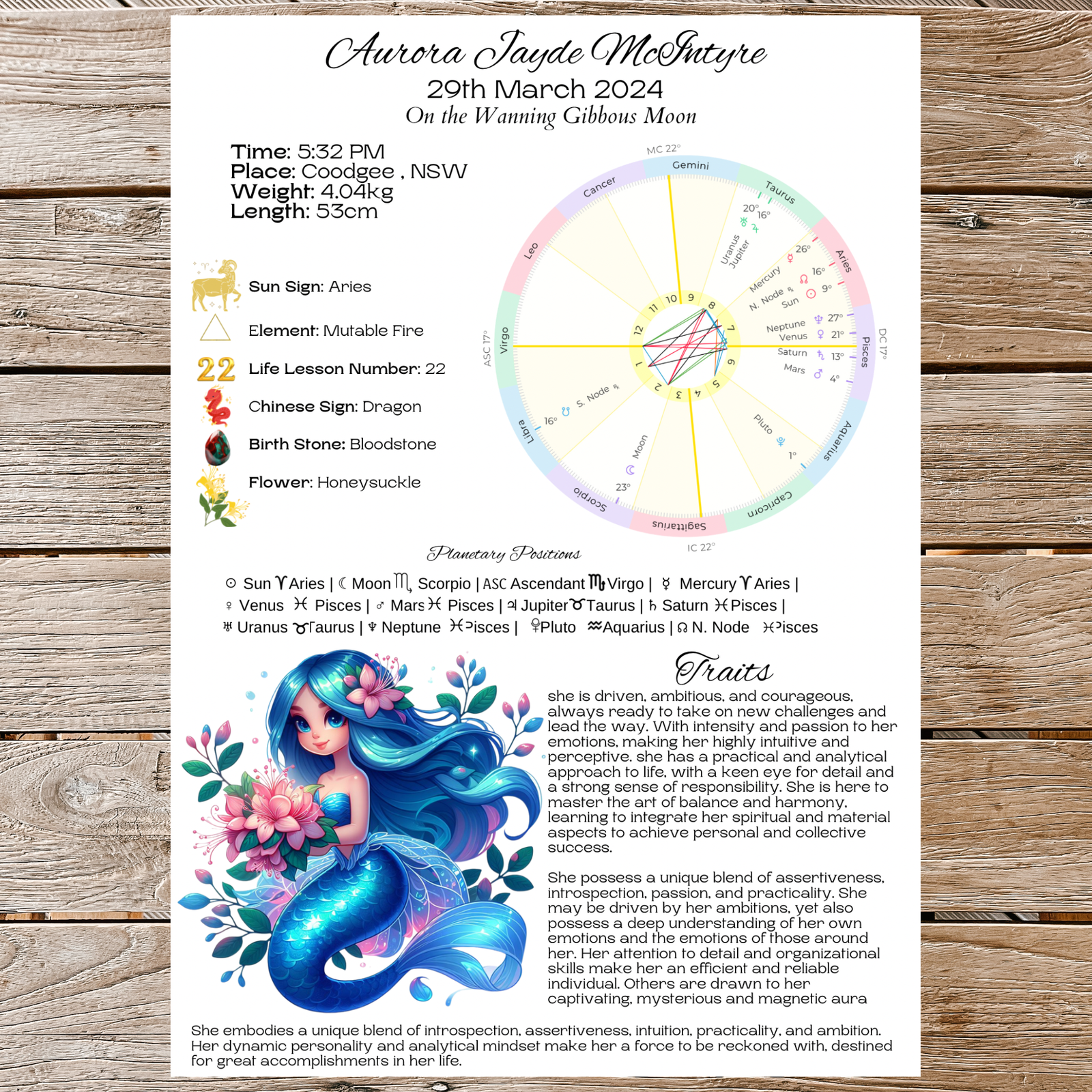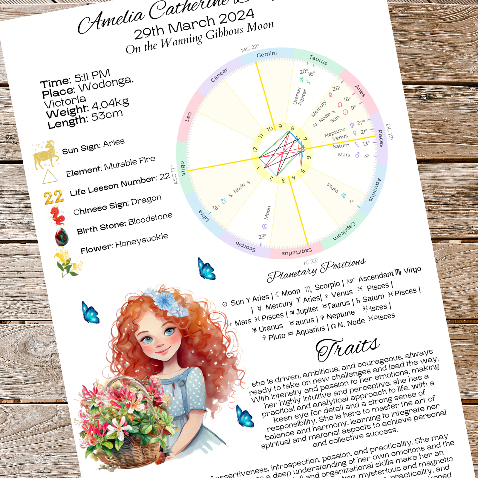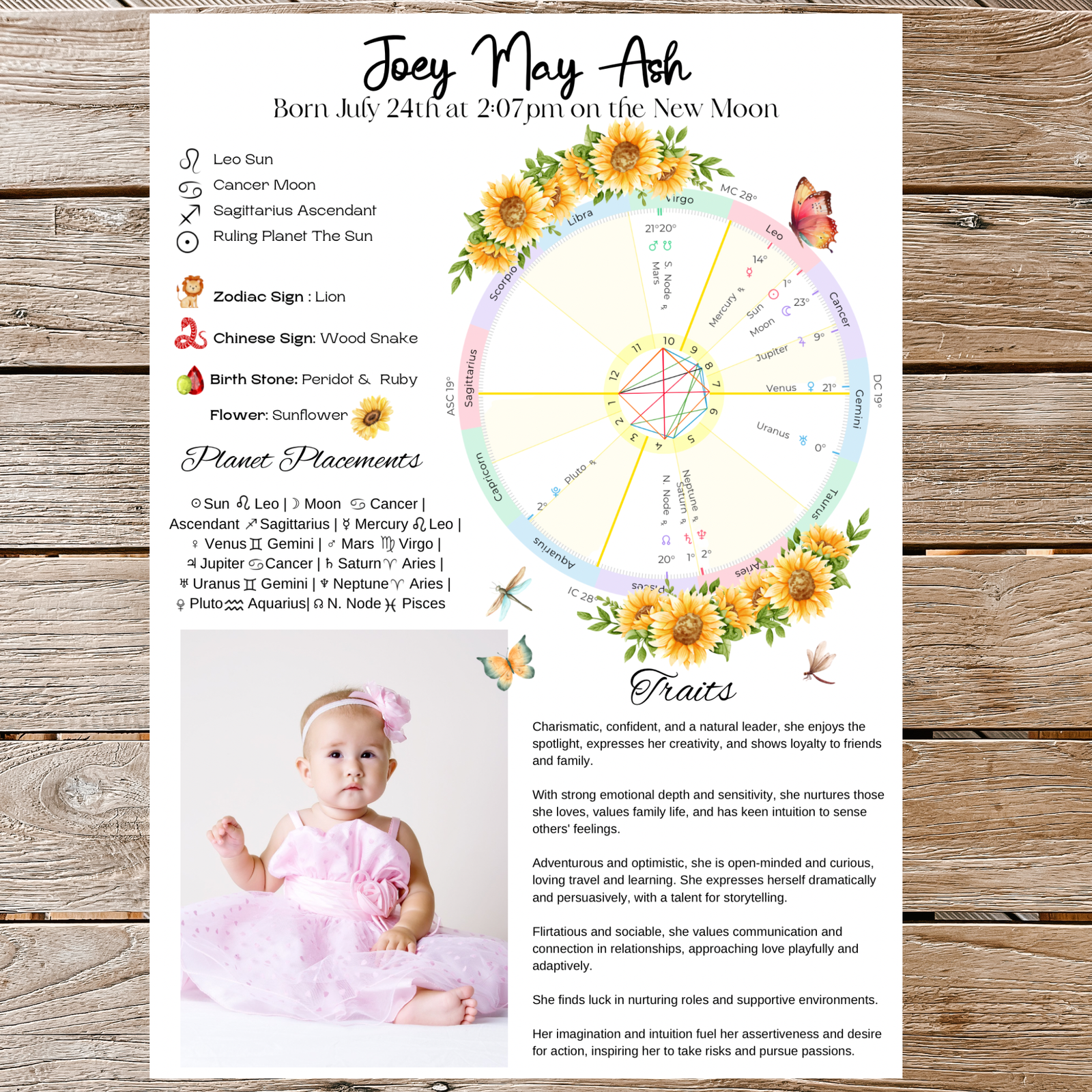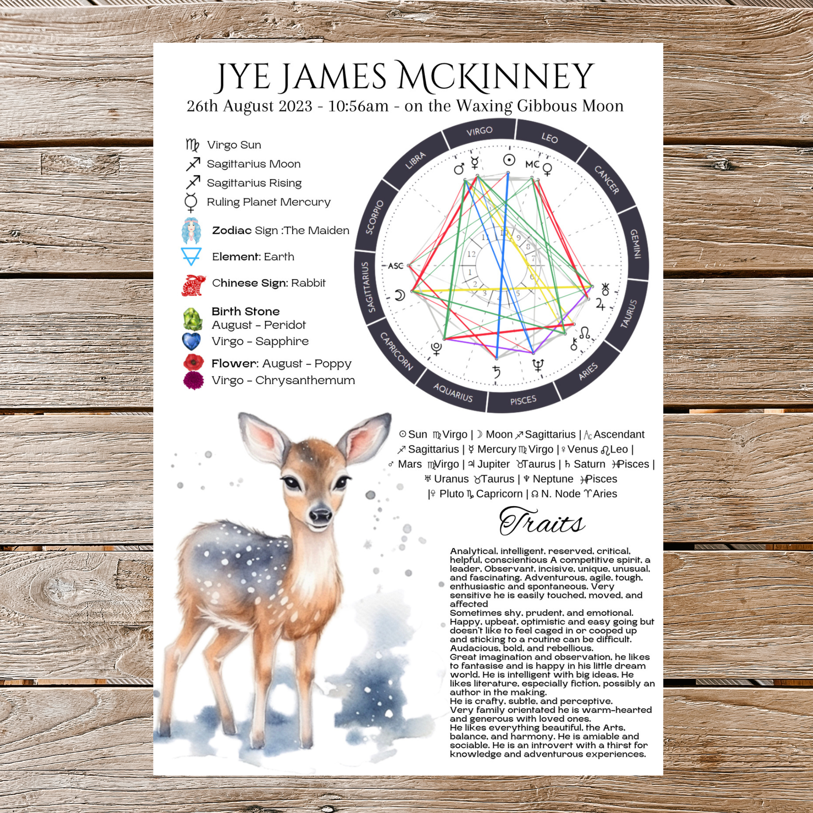 Personalised custom birth chart printable featuring a natal chart wheel, zodiac sign, birth flowers, birthstones, ruling planet, Chinese zodiac and custom artwork. A meaningful digital keepsake for all ages, from babies to grandparents.
