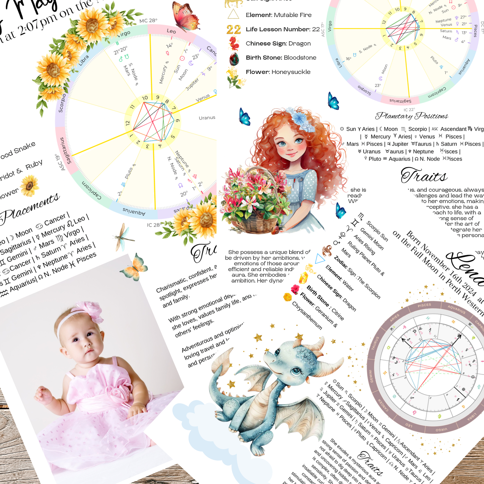 Your chart can feature any image you like — from a real photo to a fully custom illustration. Whether you envision a whimsical child, celestial portrait, floral theme, zodiac artwork, or something deeply personal, your design is created just for you.