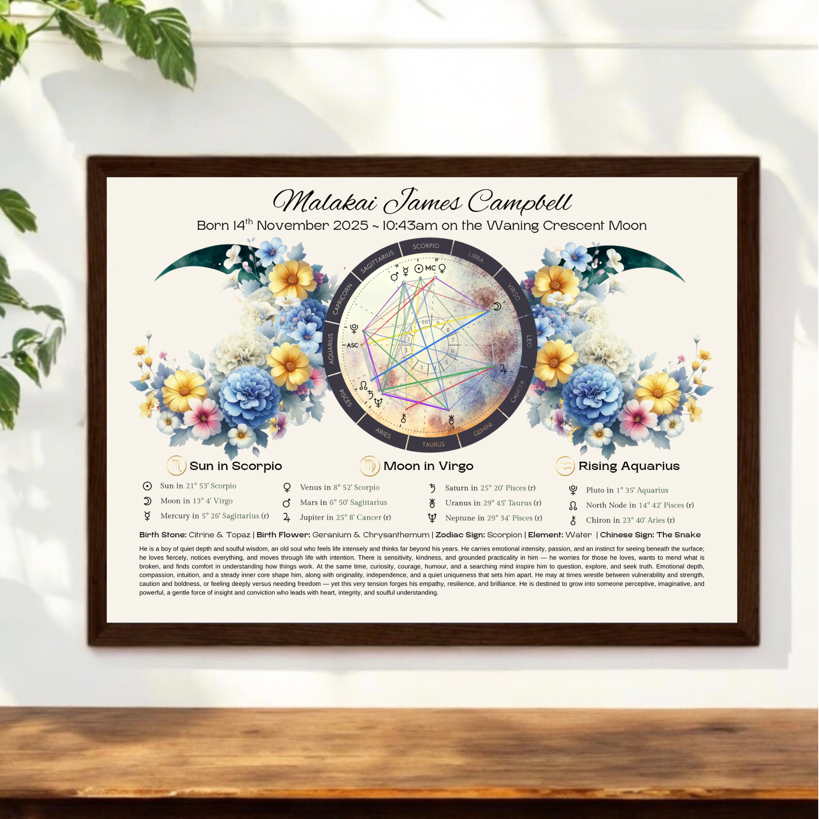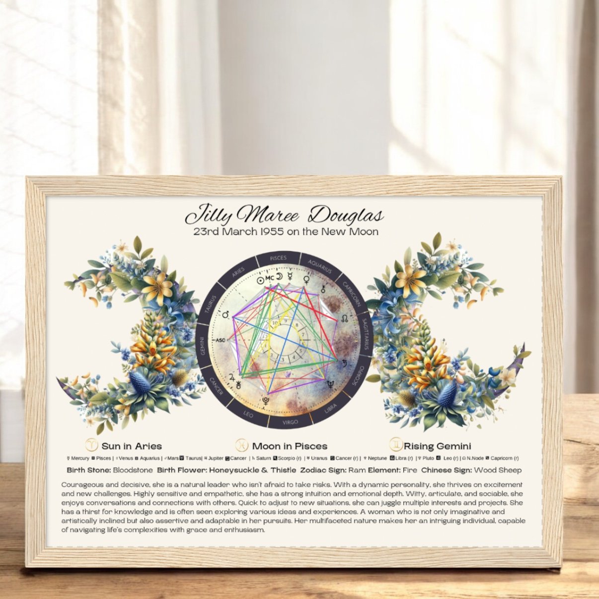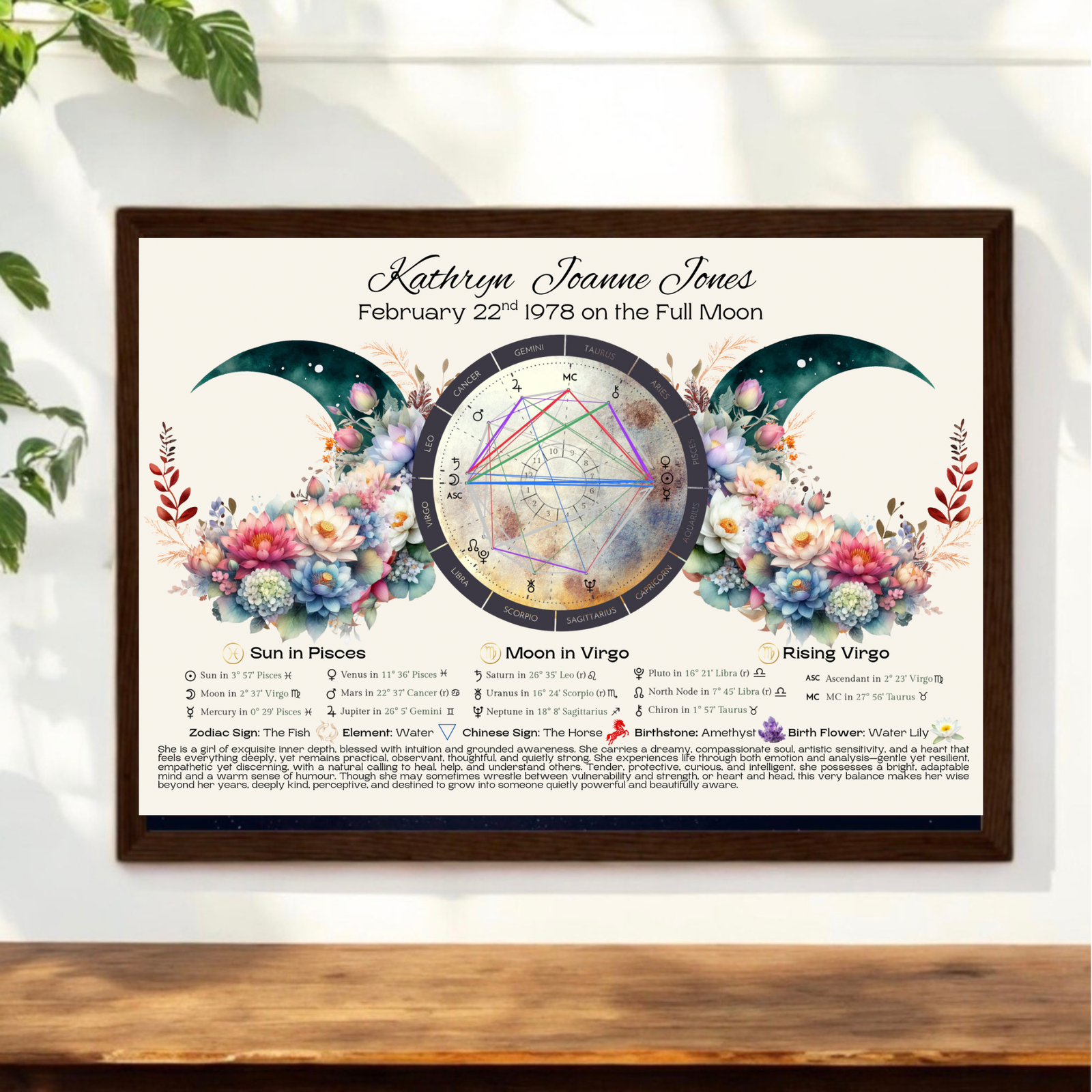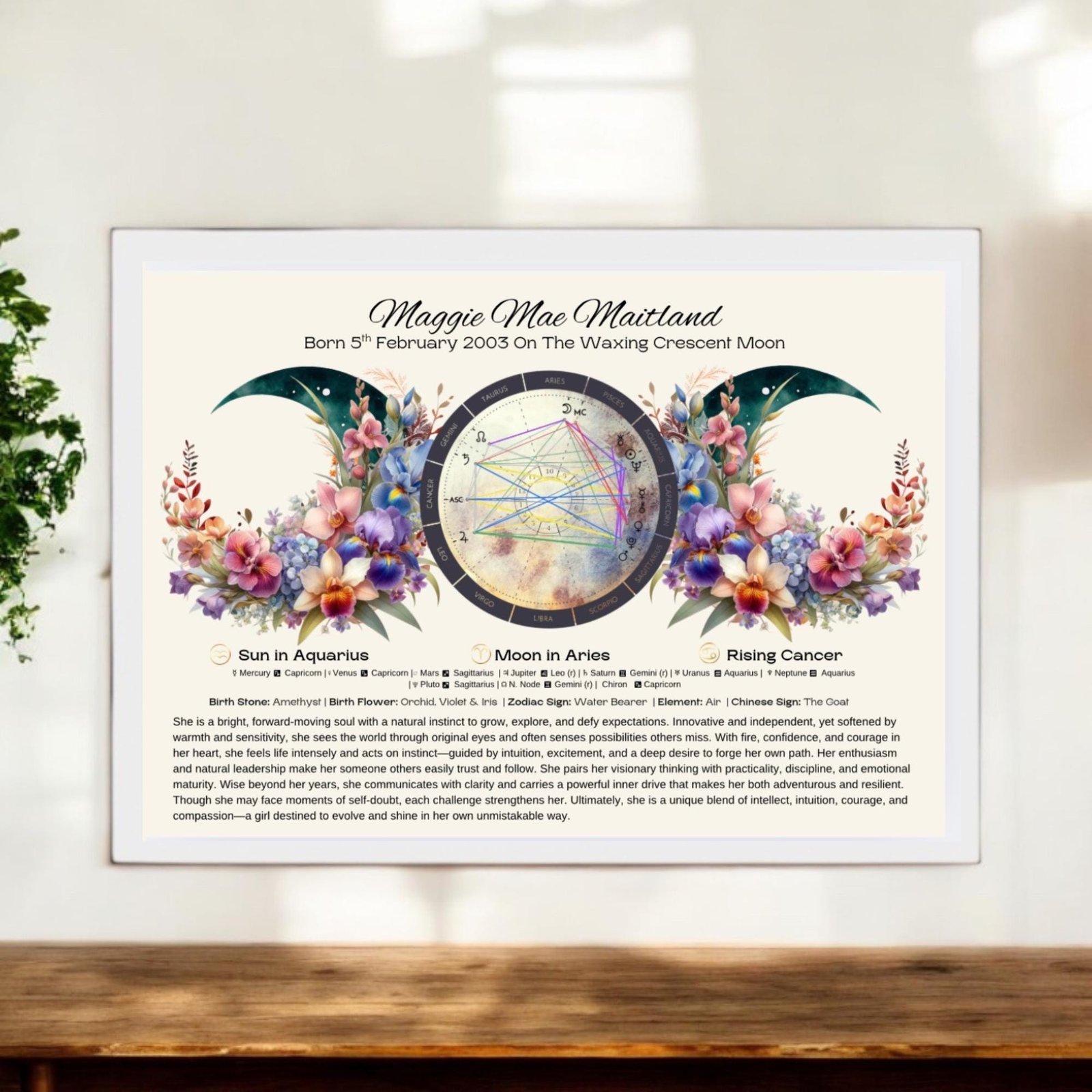 • Personalised Birth Chart Reading: Includes astrological placements, traits, moon phase, zodiac sign, birth flower, and birthstone.