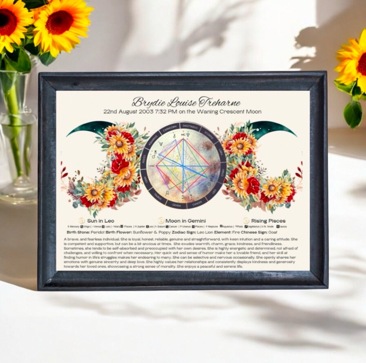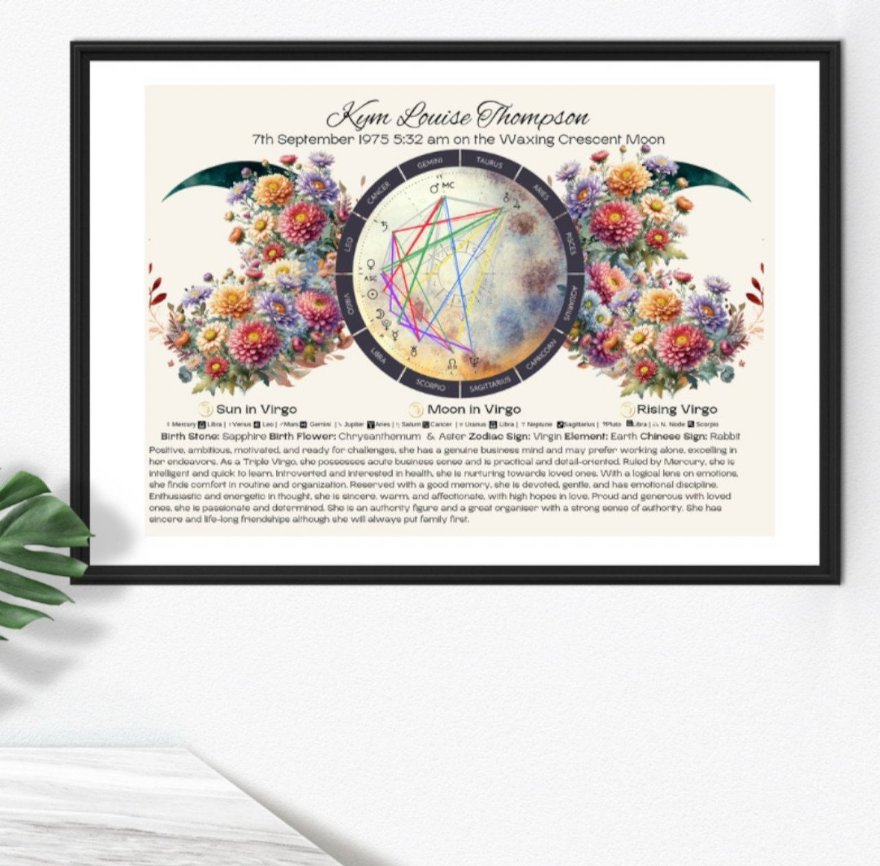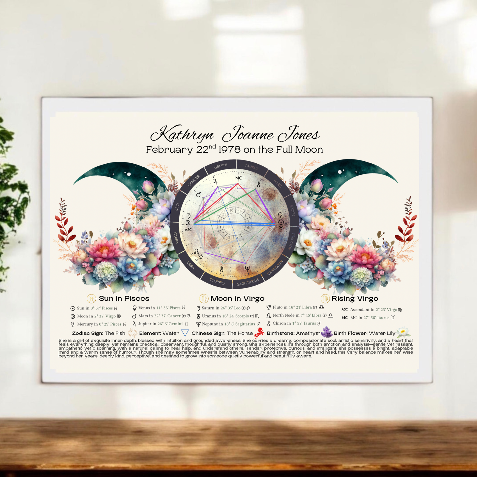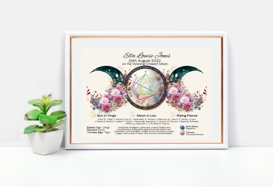 Discover the magic written in the stars with this personalised Triple Moon Birth Chart Reading Print. Designed with the powerful Triple Moon symbol (waxing, full, and waning phases), this piece reflects intuition, cycles, and spiritual balance. Each artwork is customised with your astrological placements, zodiac traits, birthstones, and flowers, creating a one-of-a-kind celestial keepsake.