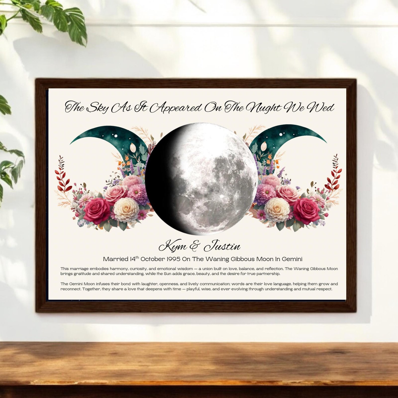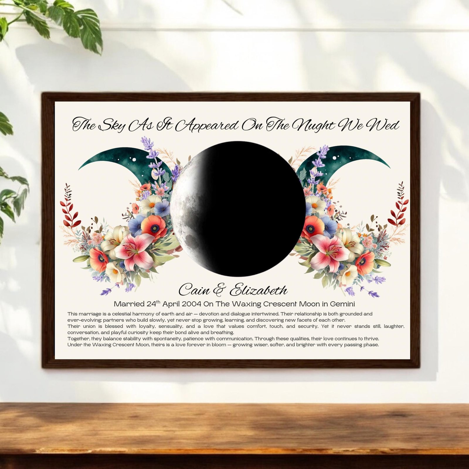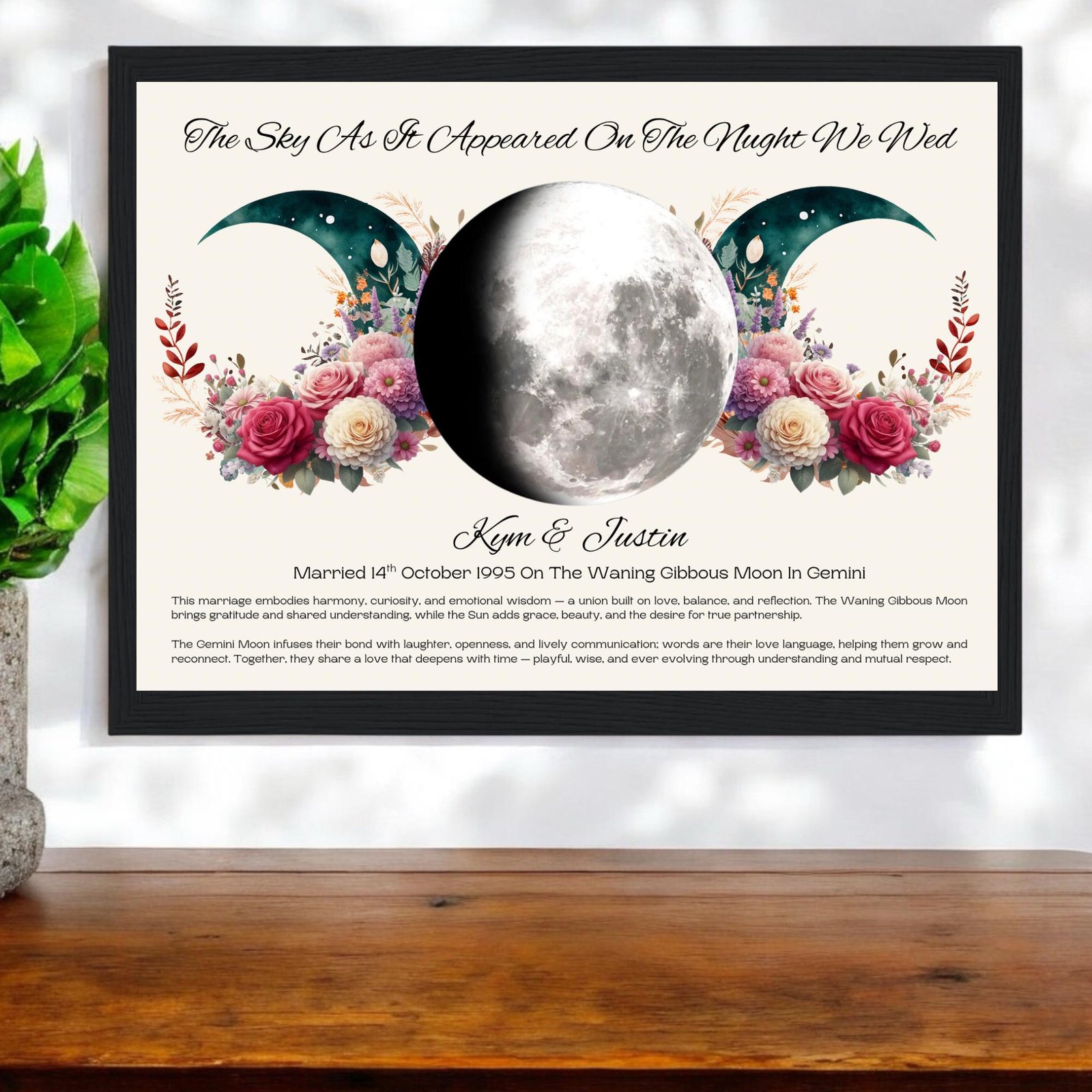 Custom Triple Moon Couple Print — Personalised Moon Phase, Zodiac & Wedding Art