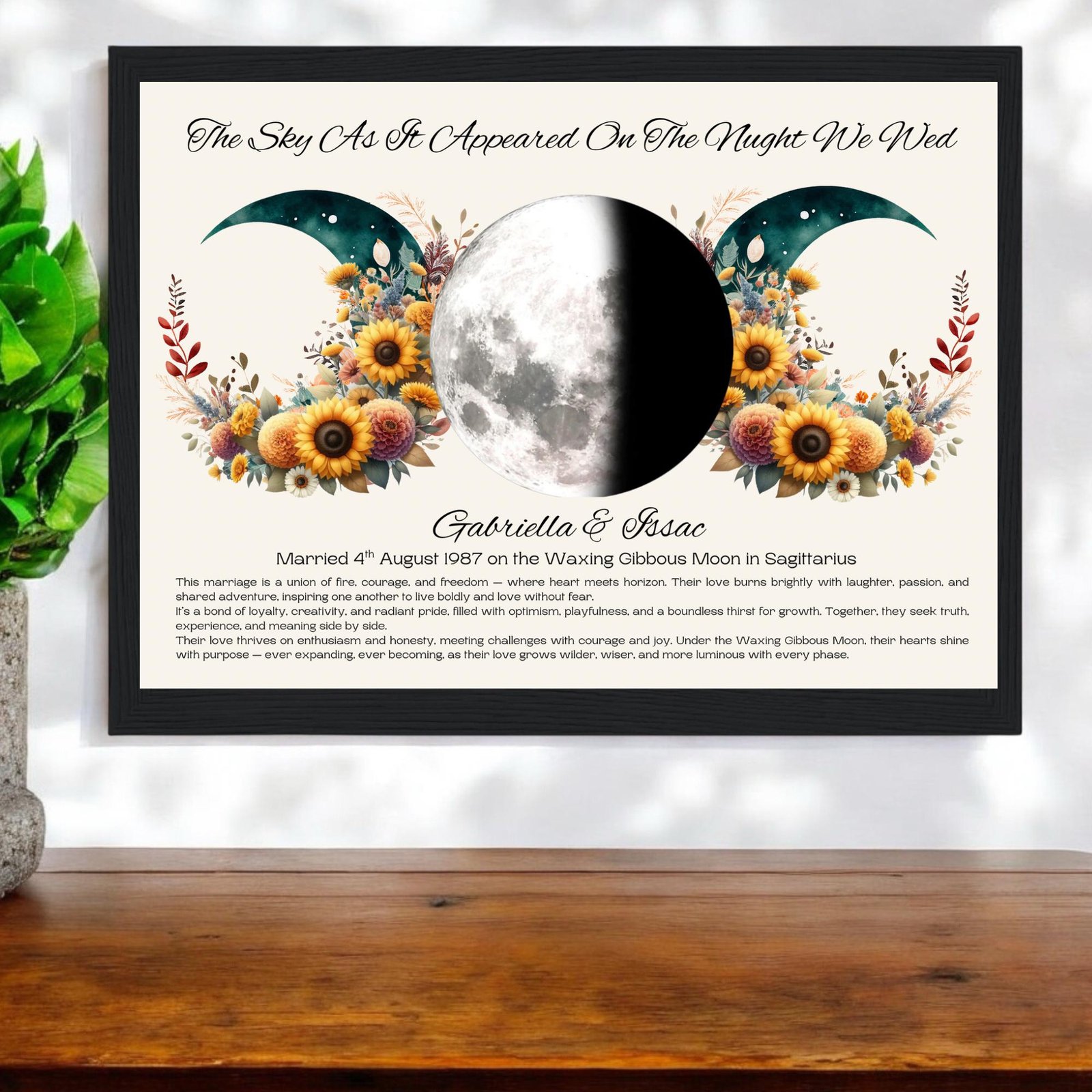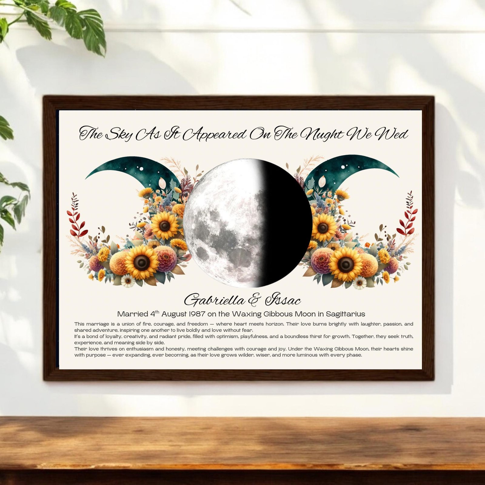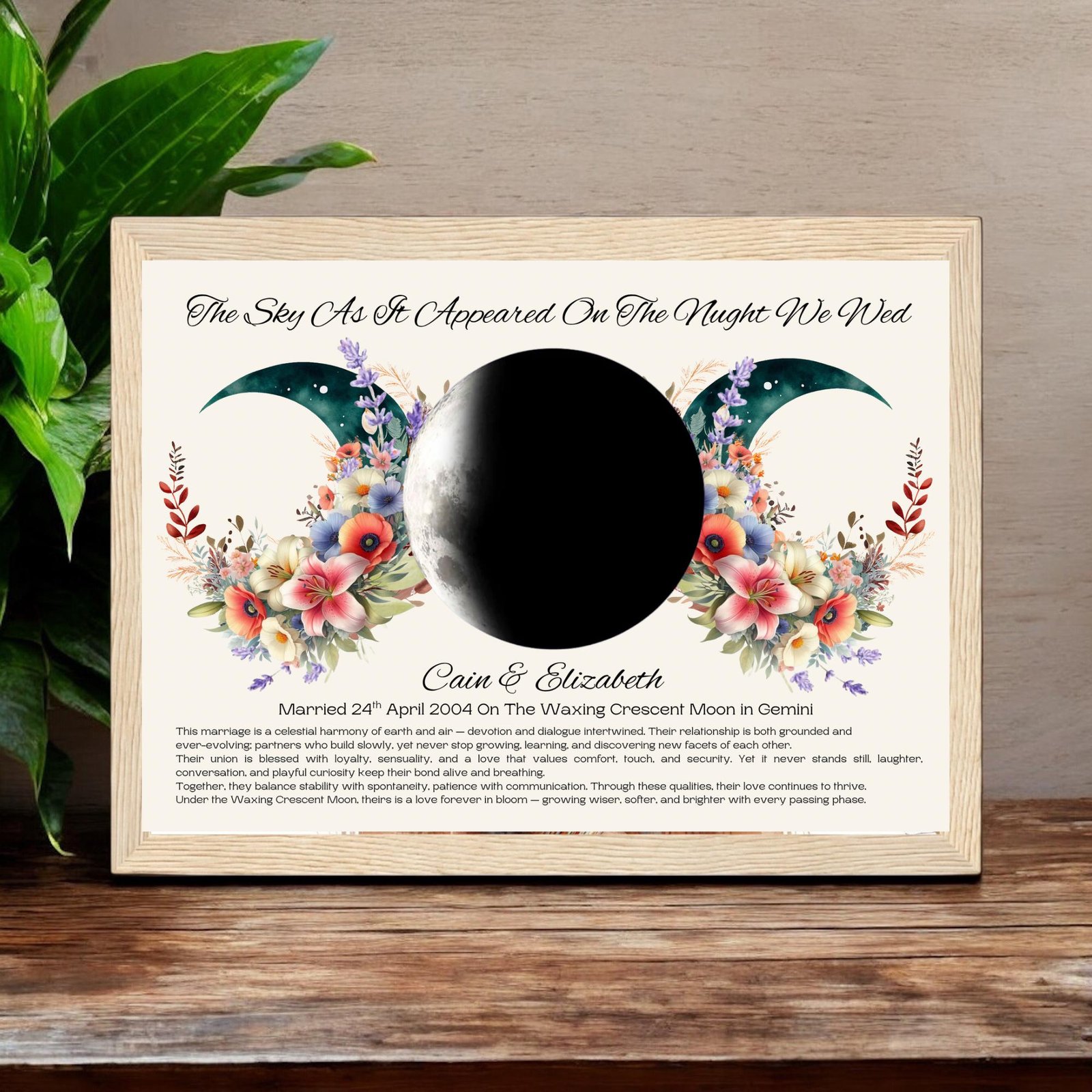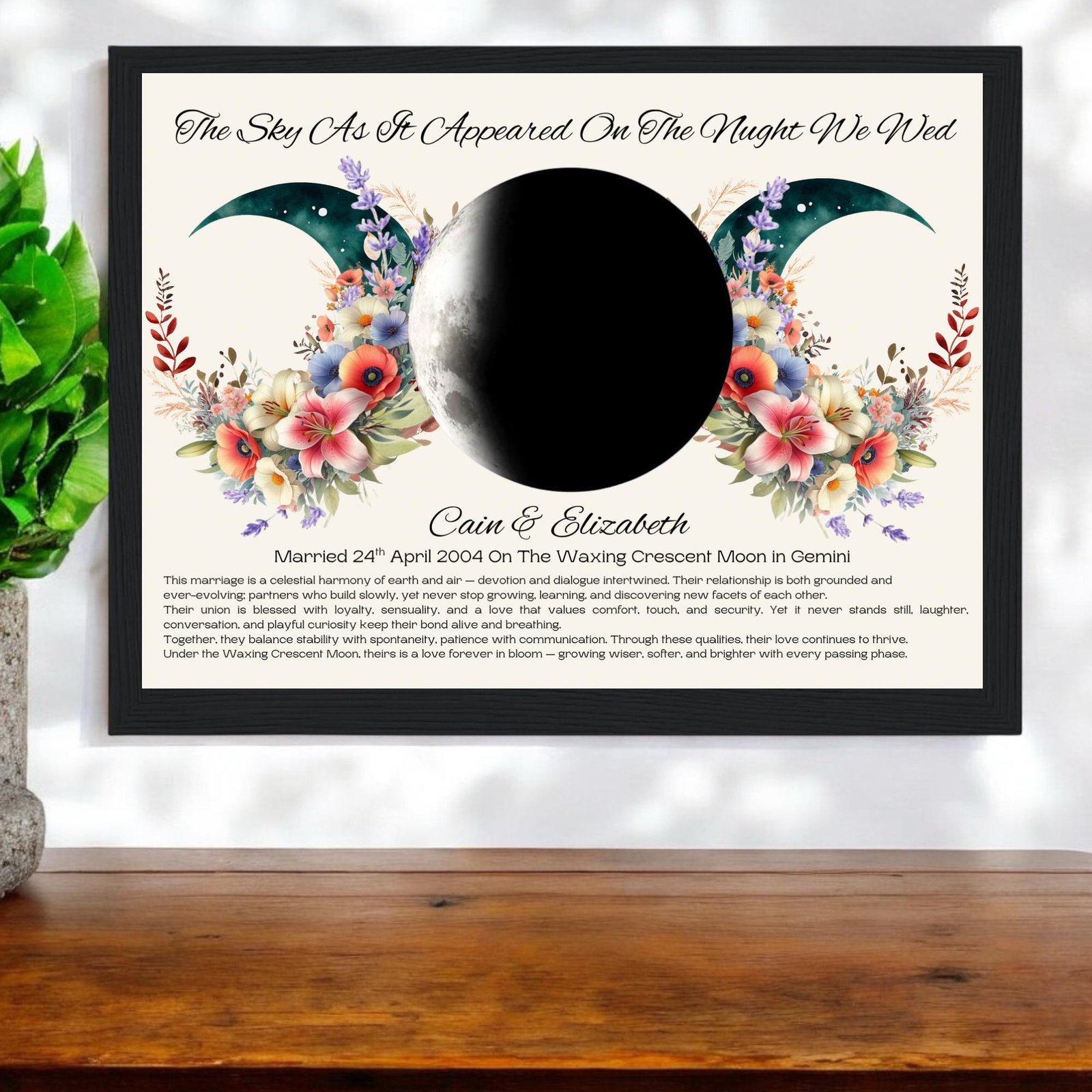 Each custom print is uniquely designed to capture the celestial magic of your relationship — whether it’s the moon you met under, the one that lit your engagement, or the night you said “I do.”