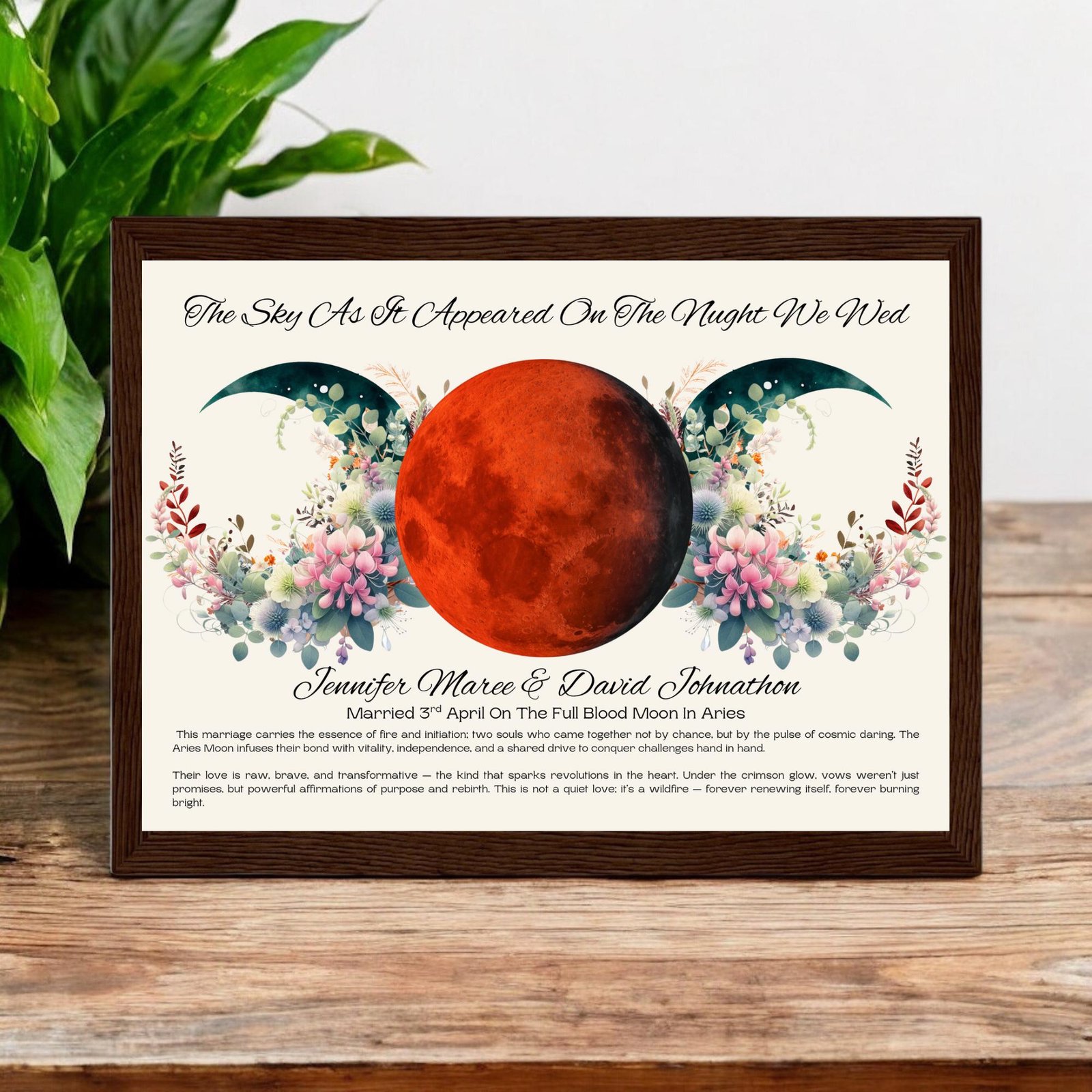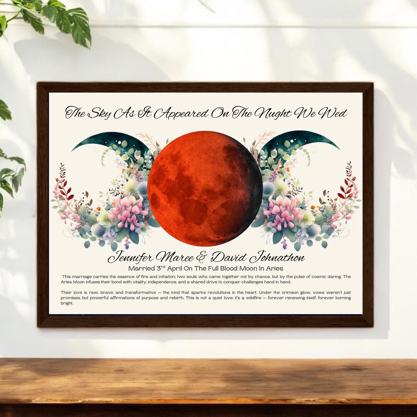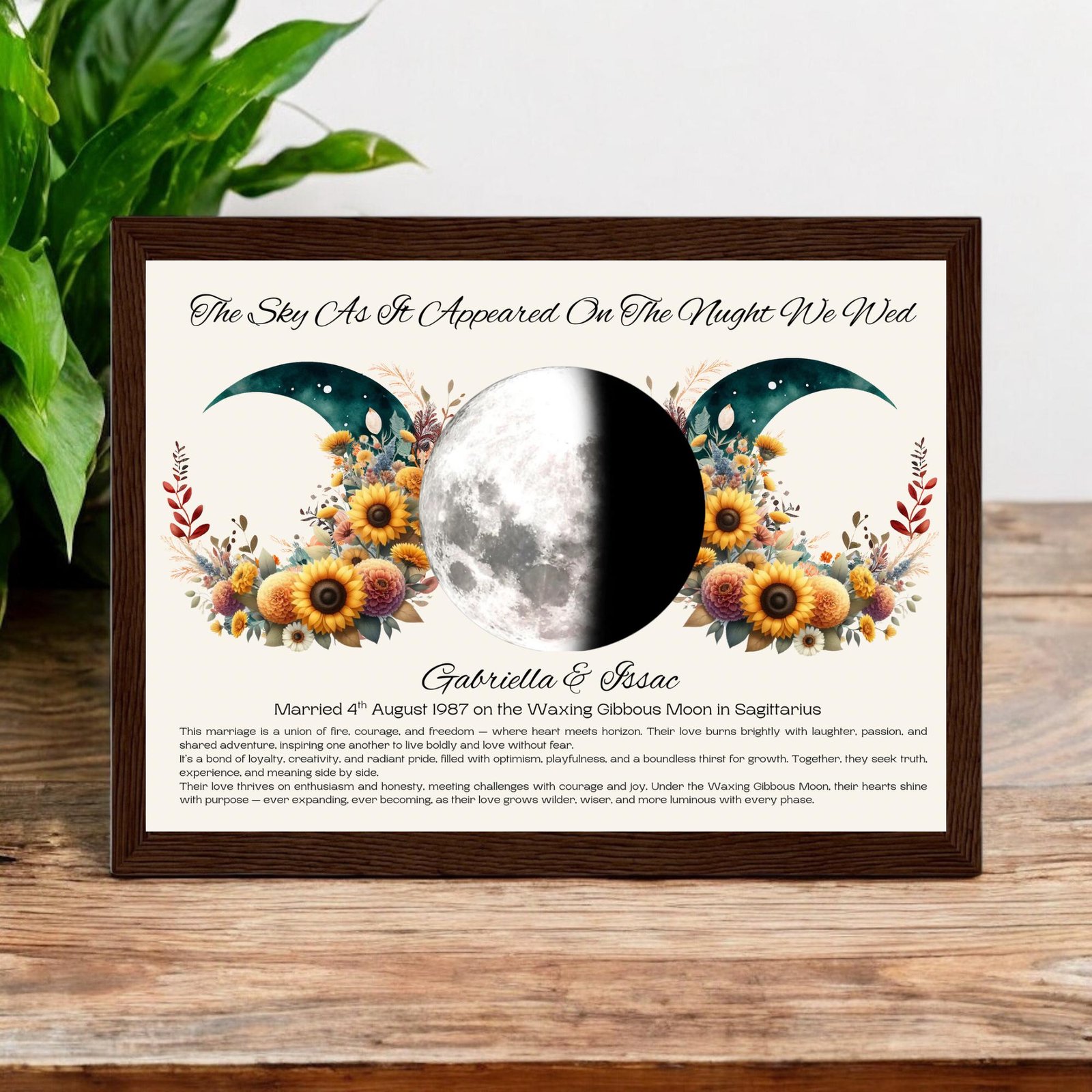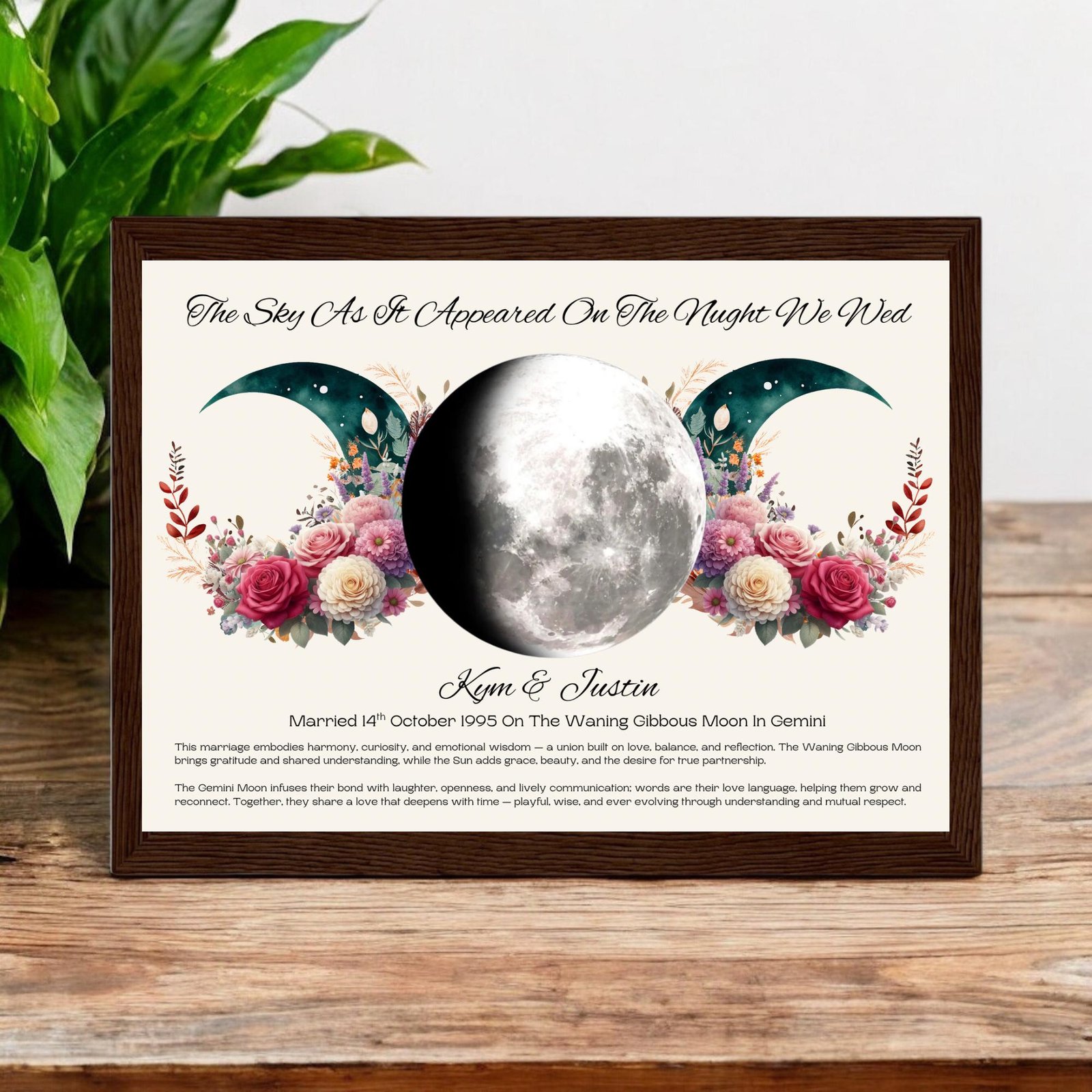 Each custom print is uniquely designed to capture the celestial magic of your relationship — whether it’s the moon you met under, the one that lit your engagement, or the night you said “I do.”