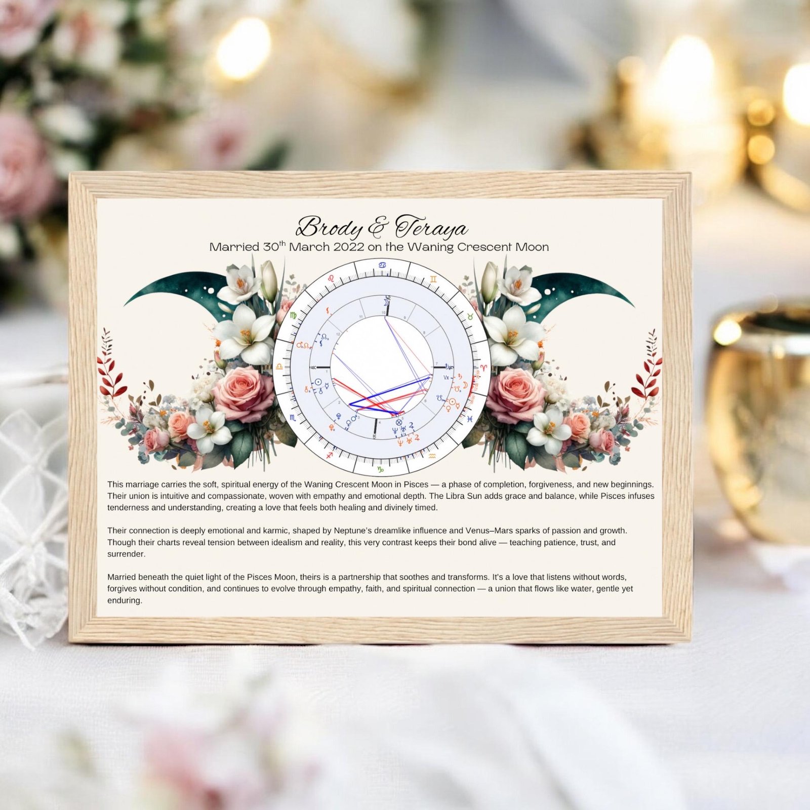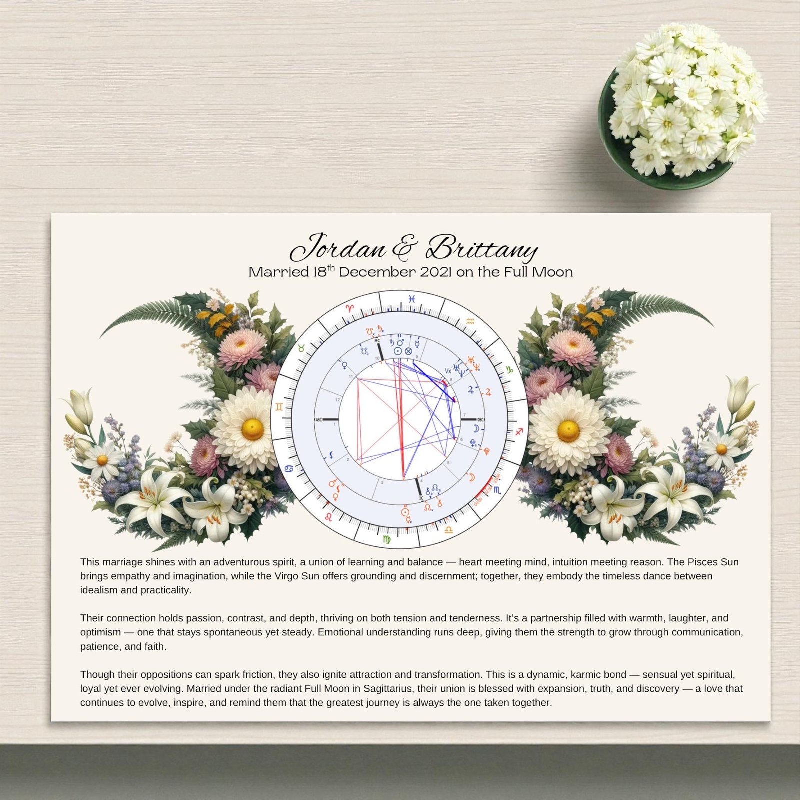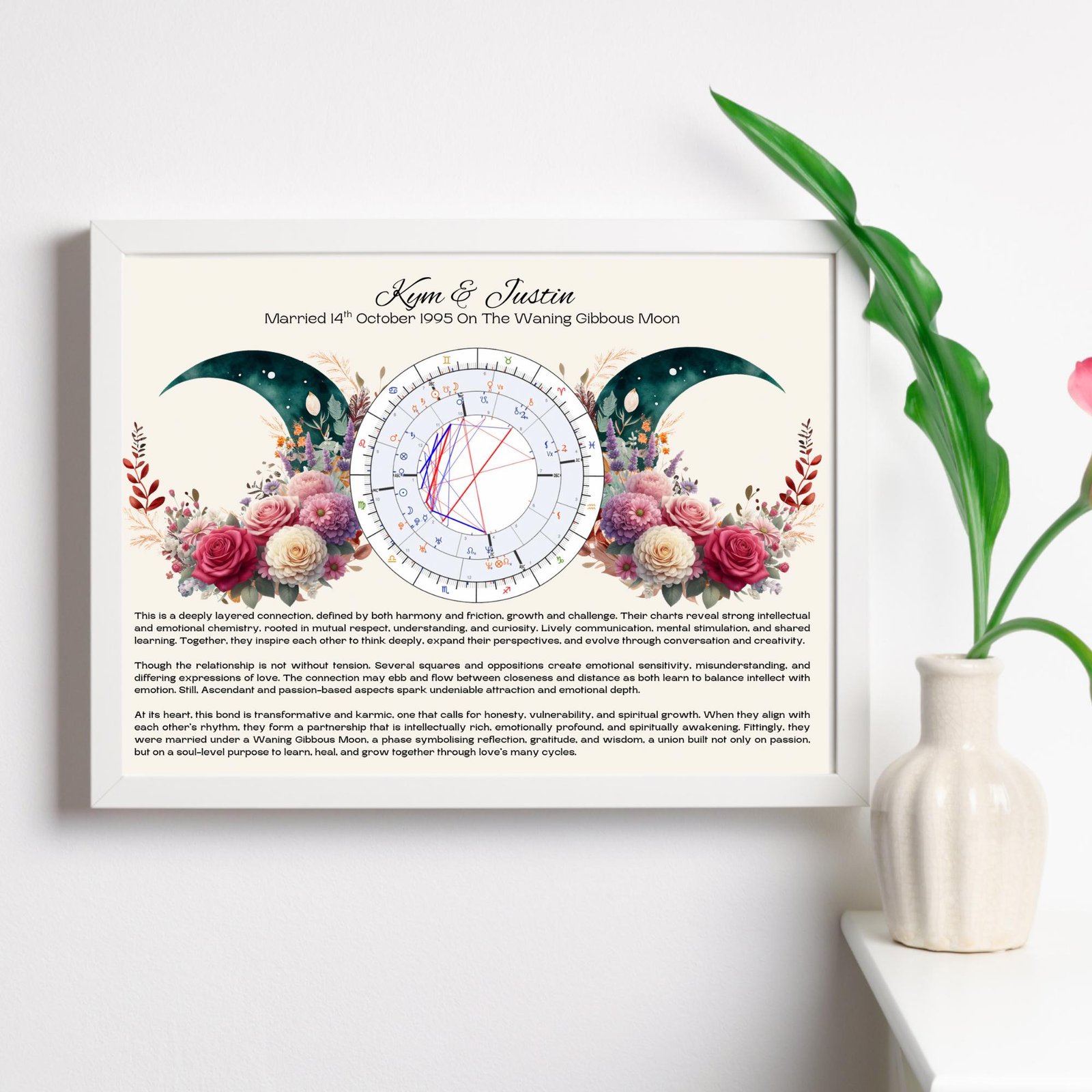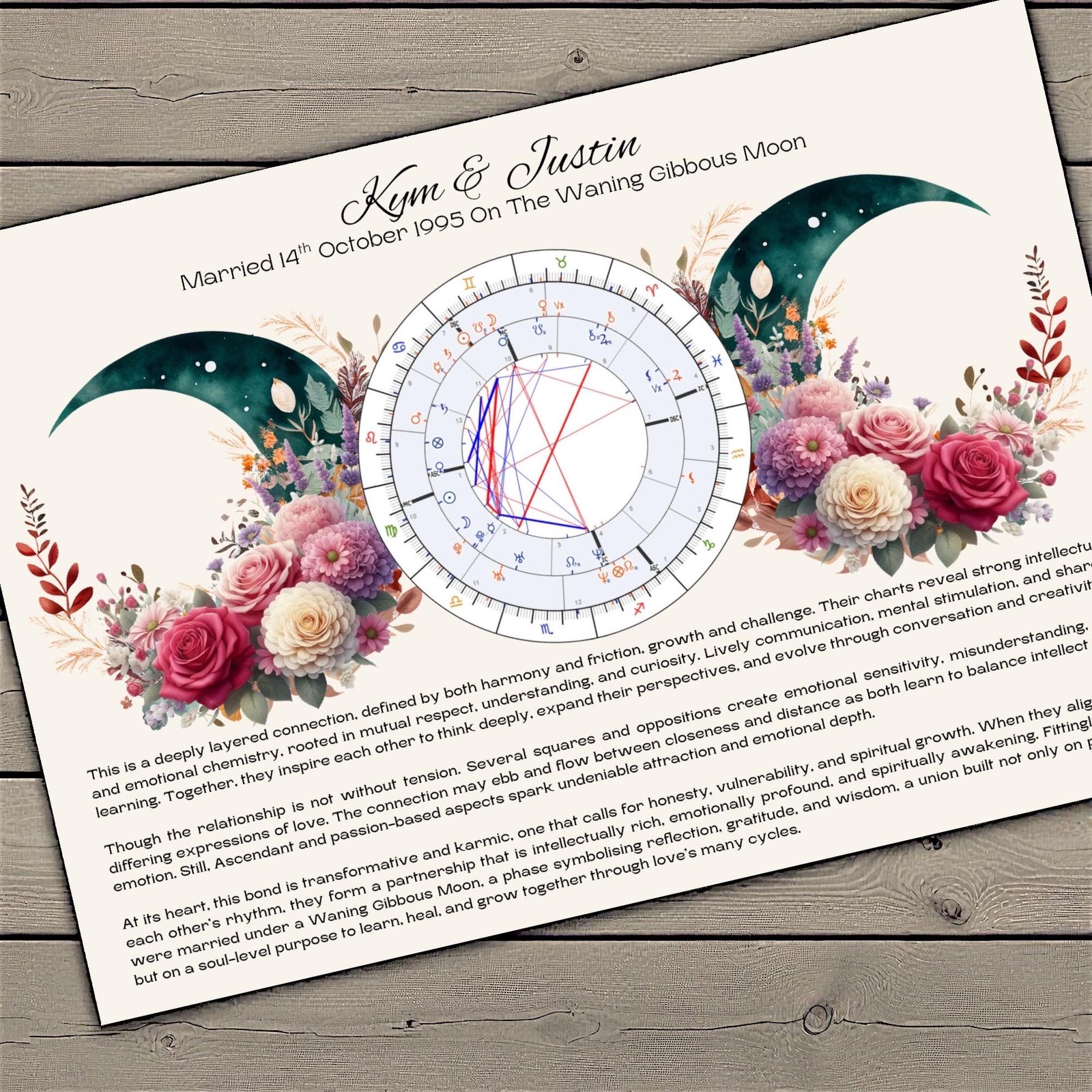 A celestial digital keepsake Custom synastry chart created from your birth details & wedding moon phase — ready to download, print & frame your way.