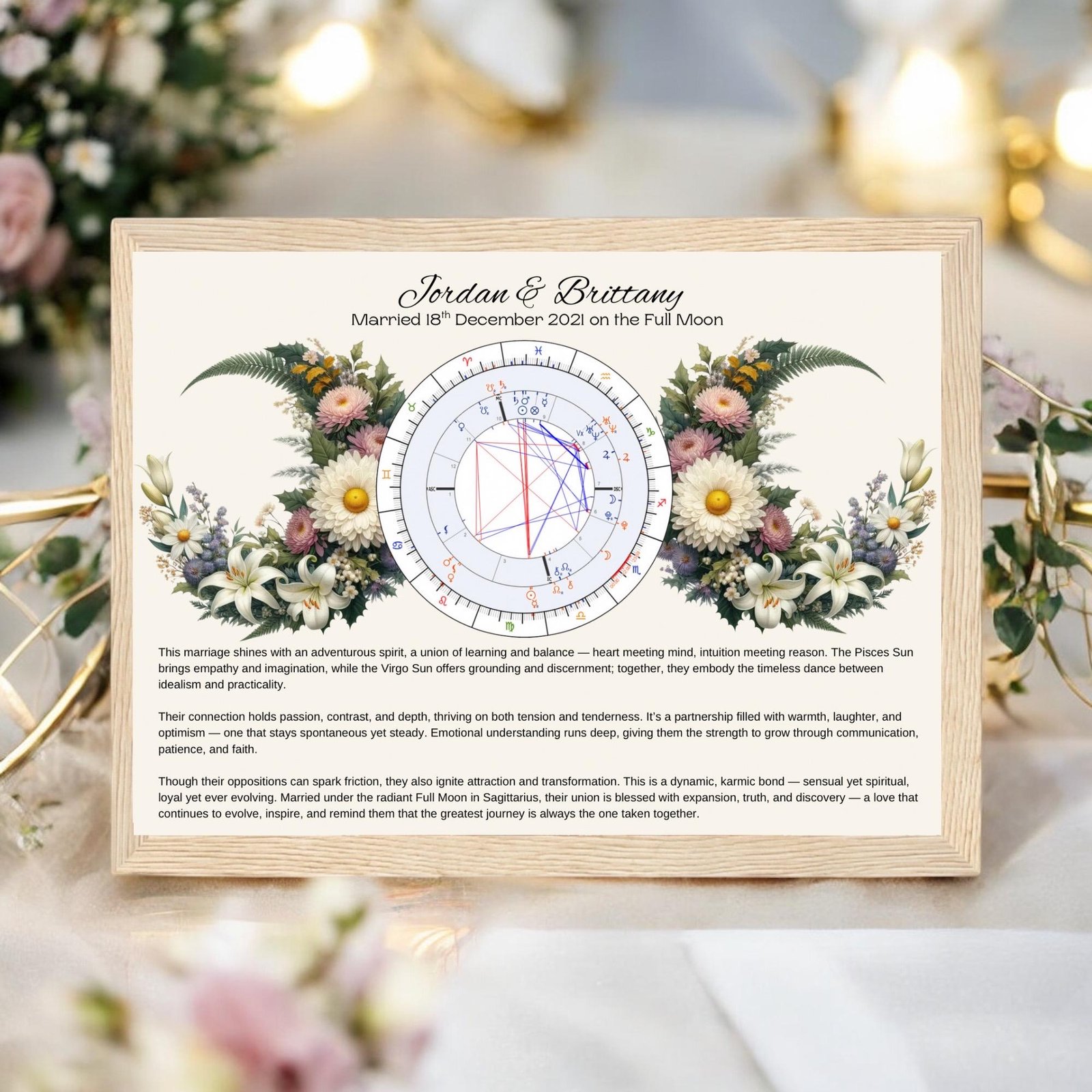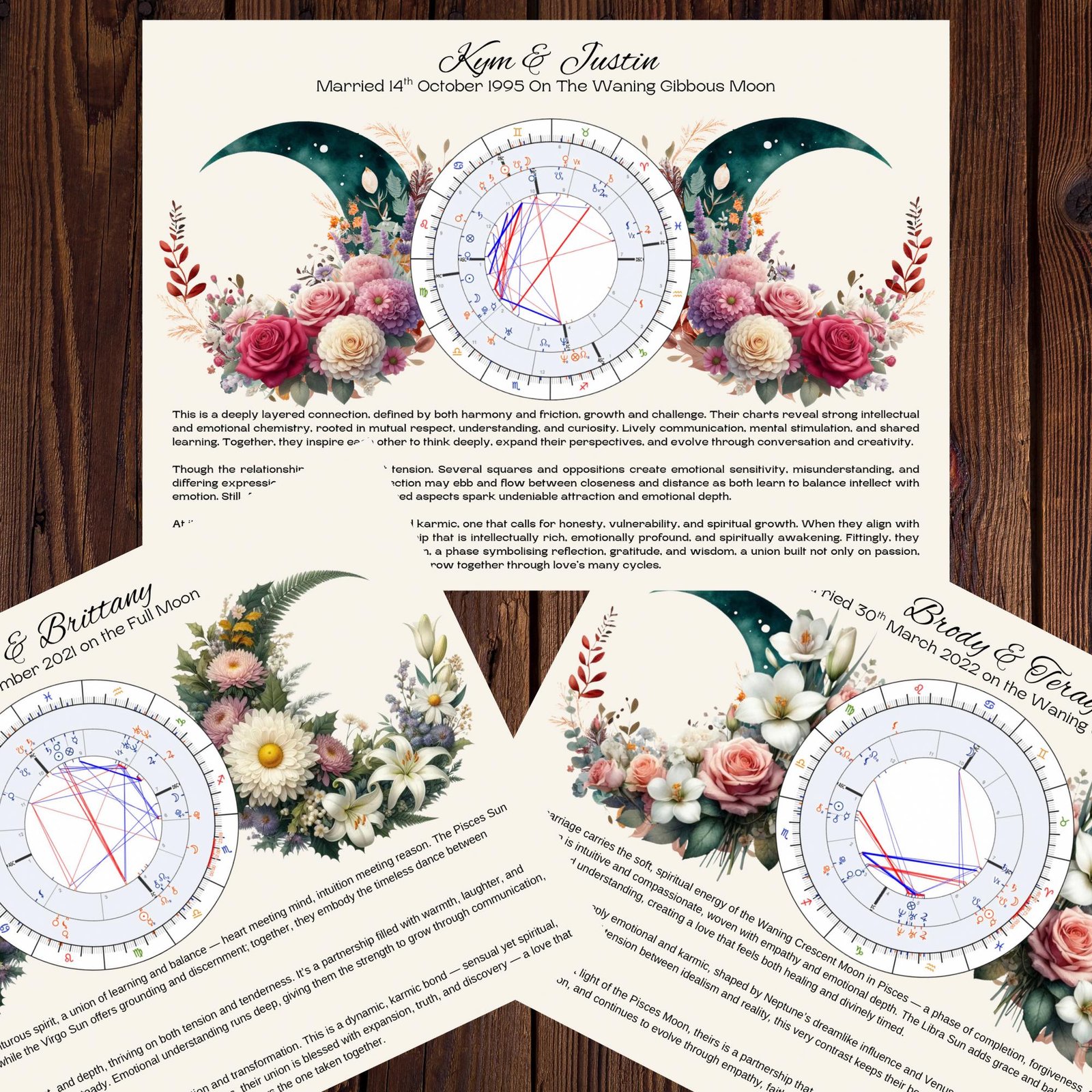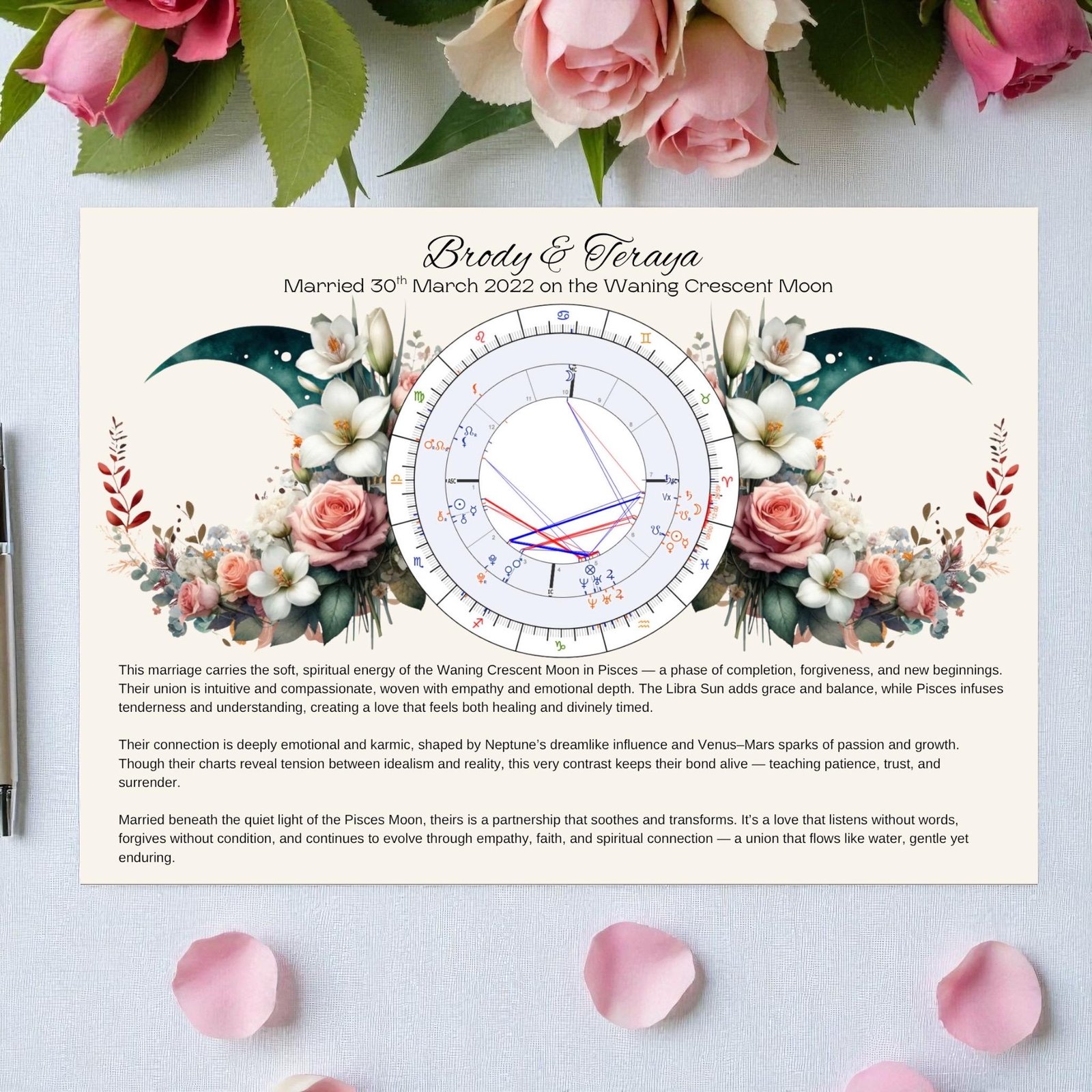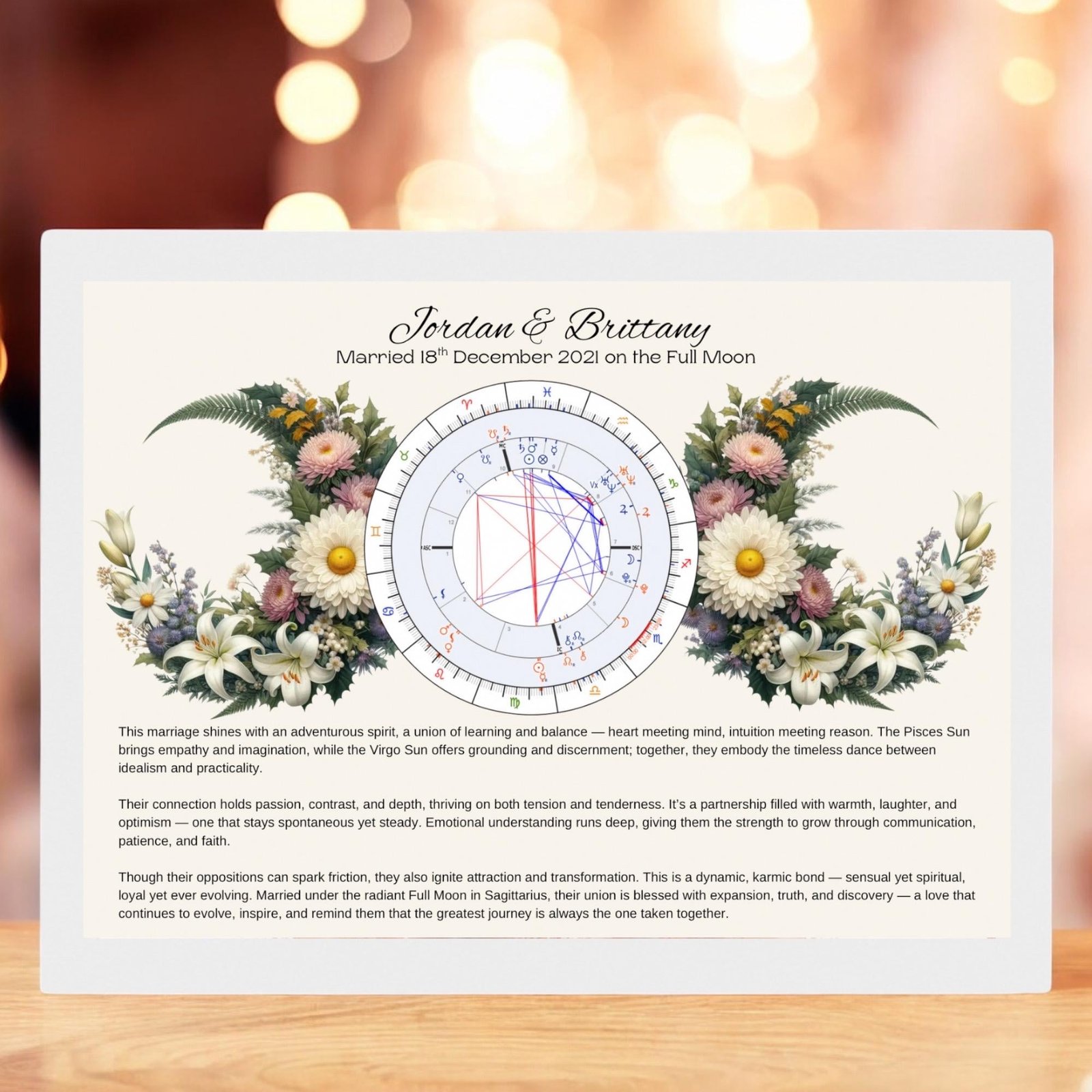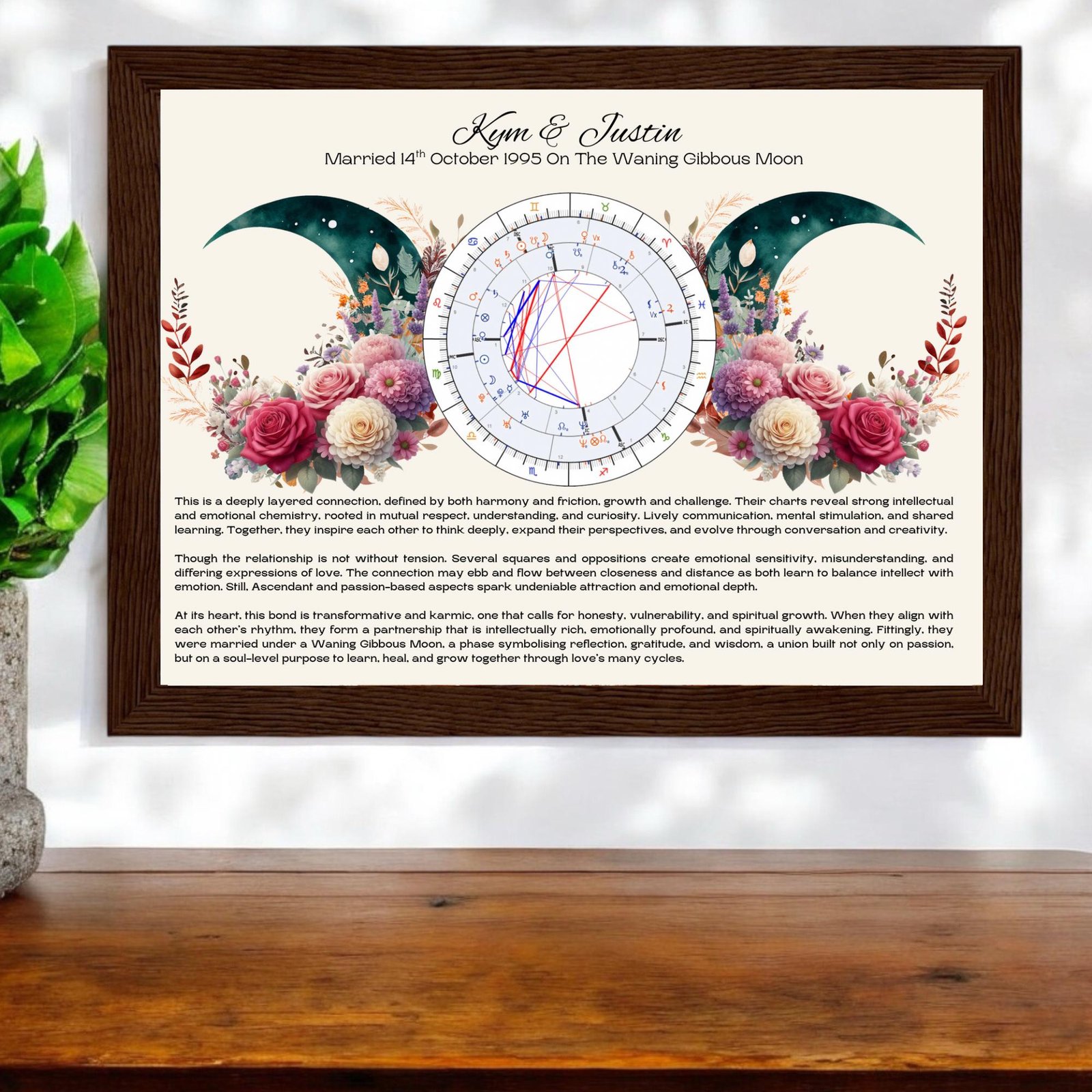 A celestial digital keepsake Custom synastry chart created from your birth details & wedding moon phase — ready to download, print & frame your way.