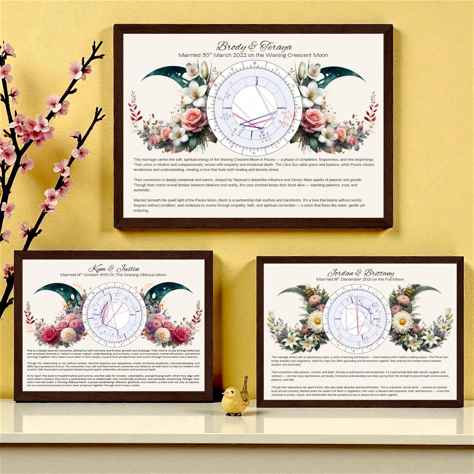 The result is a beautifully detailed synastry chart displayed in a triple moon design, adorned with your birth flowers and the wedding zodiac blooms — a celestial portrait of your union.