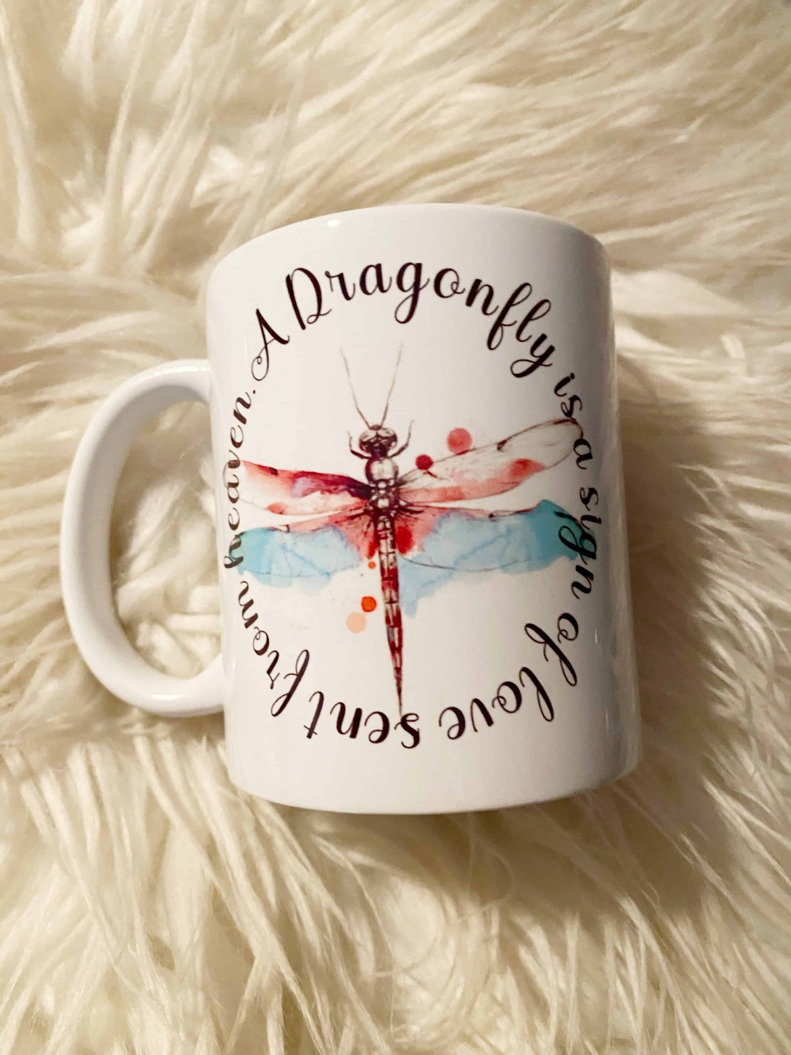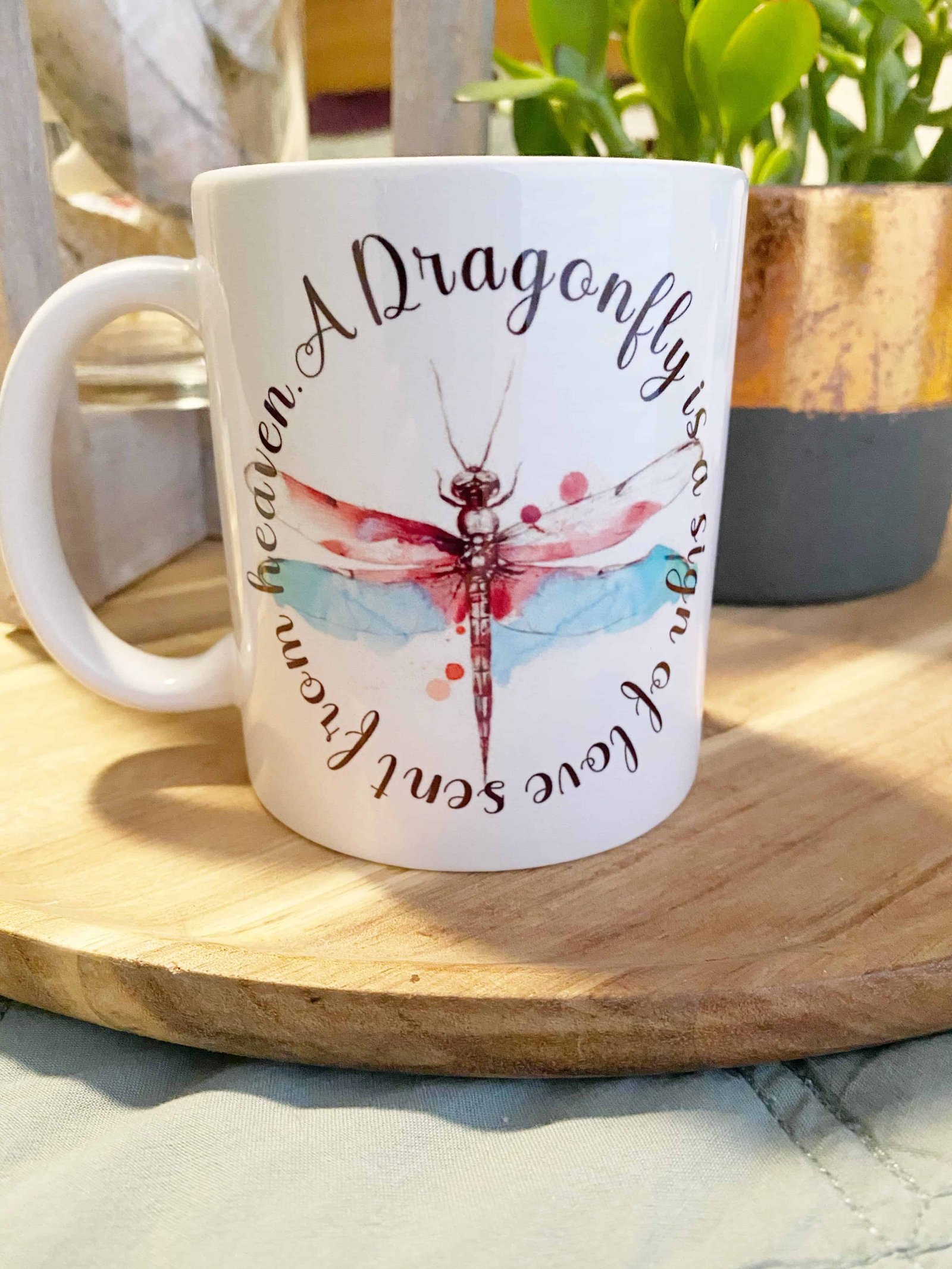 Beautiful water colour dragonfly with the quote ‘A Dragonfly is a sign of love sent from heaven’ printed on ceramic coffee mug, white travel mug or keyring