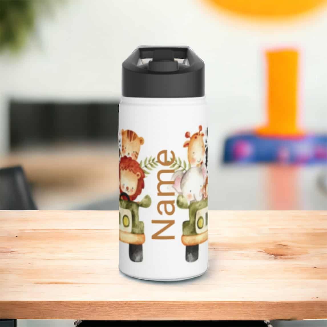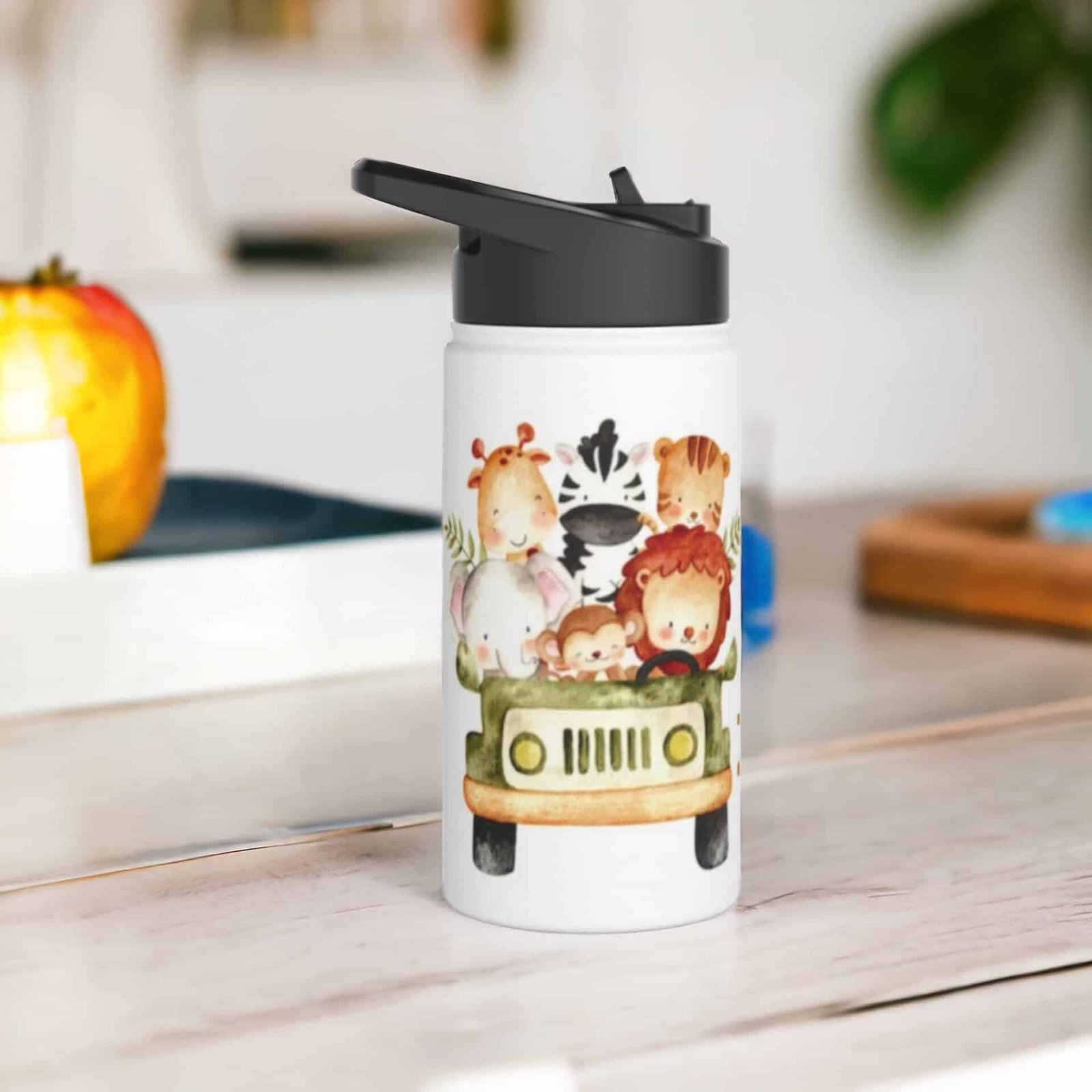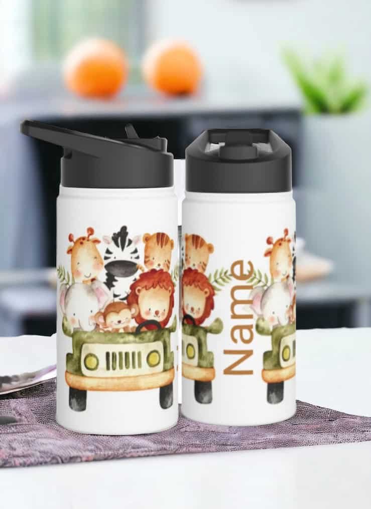 Driving Jungle Animals Personalised Water Bottle, super cute design for toddlers and kids. Stainless steel drink bottle with leak proof lid.