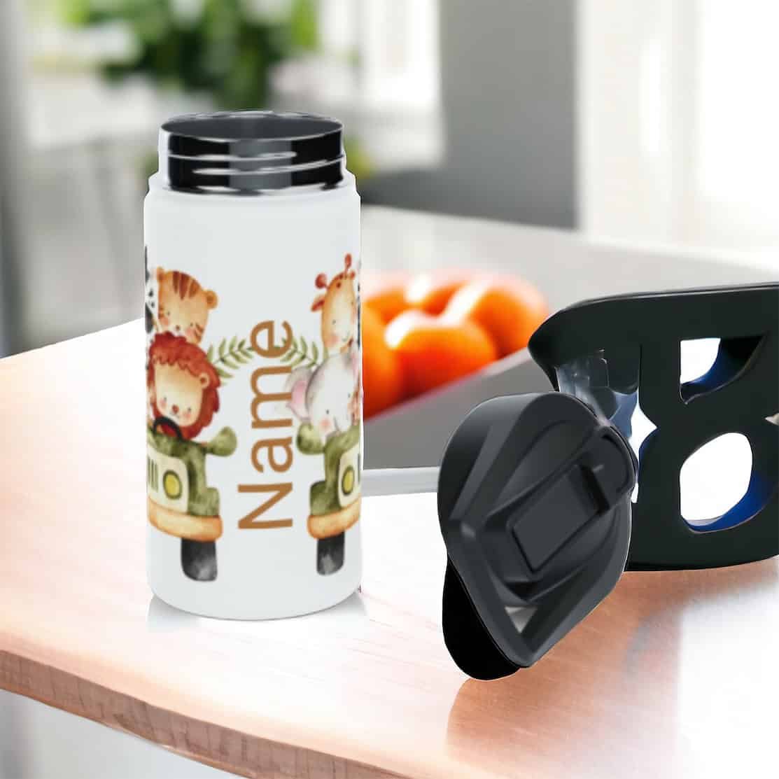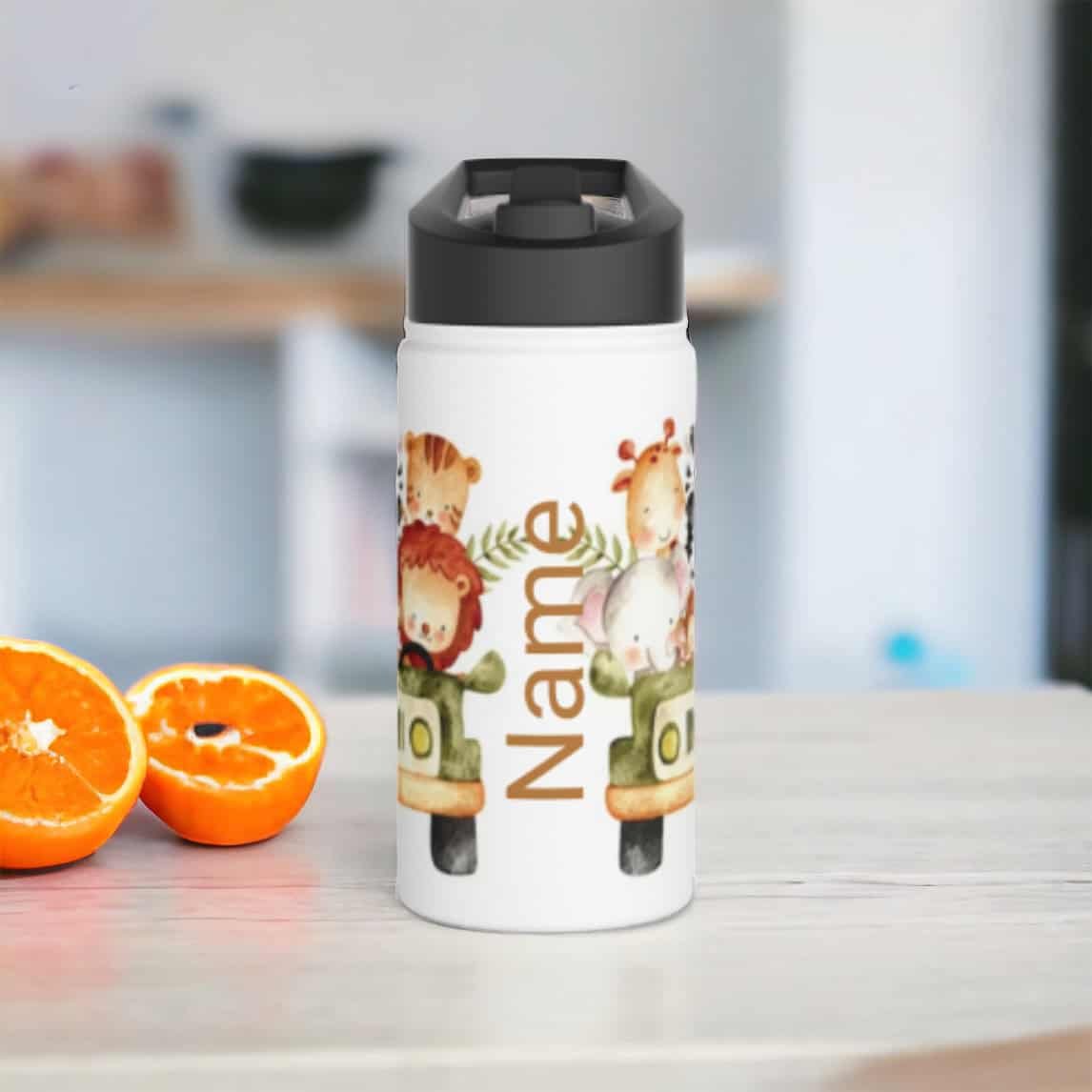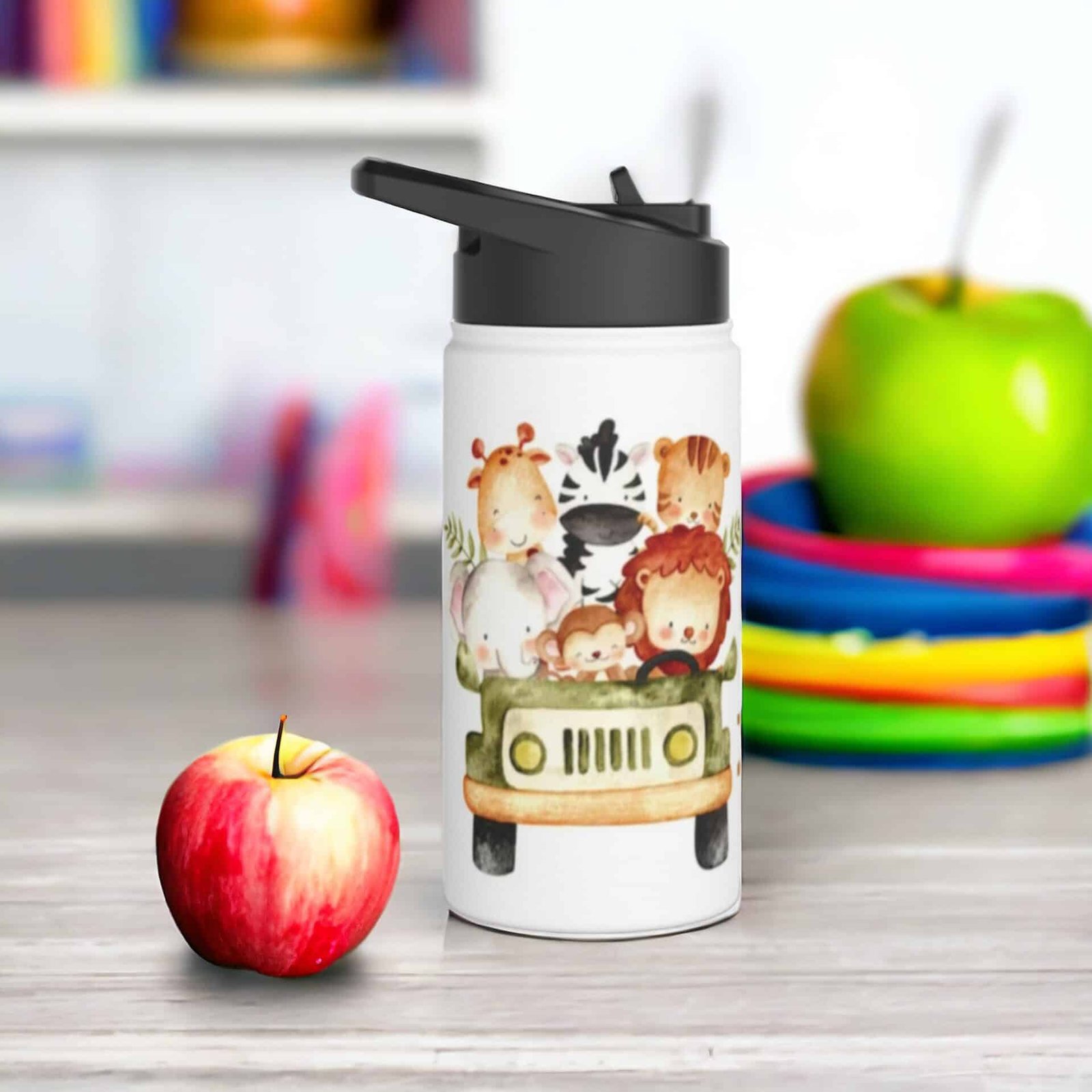 Driving Jungle Animals Personalised Water Bottle, super cute design for toddlers and kids. Stainless steel drink bottle with leak proof lid.