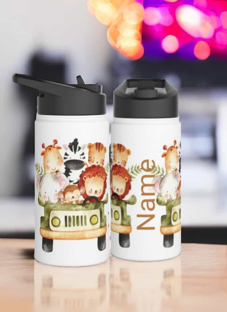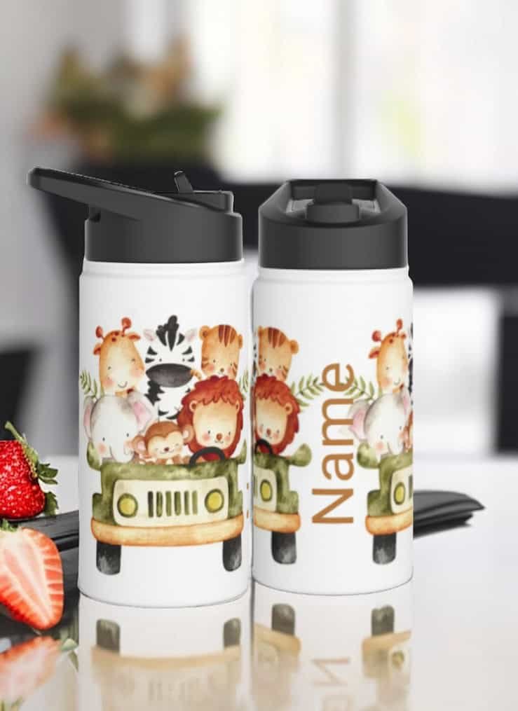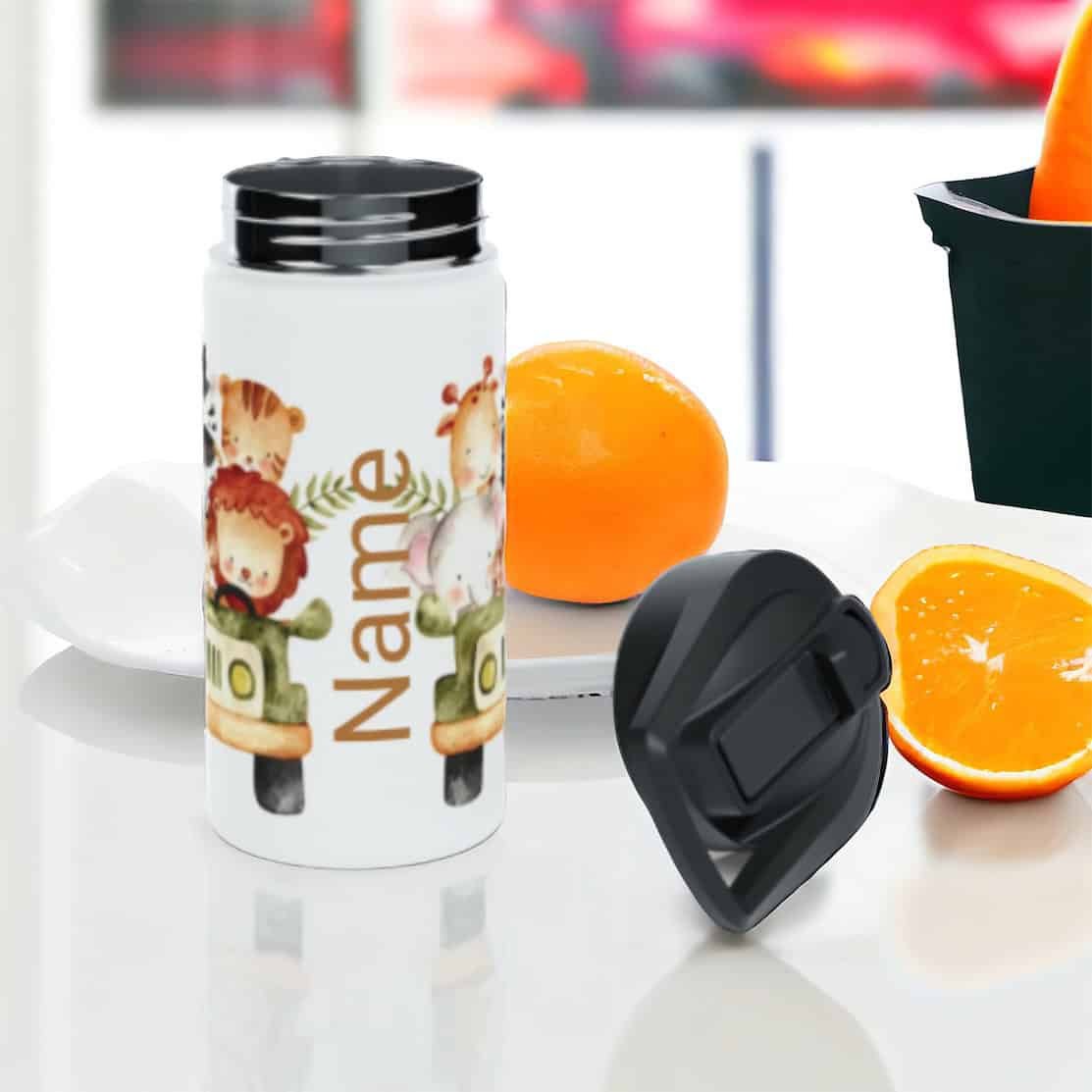 Featuring our Driving Jungle Animals design, this personalised, this water bottle features a double-wall stainless steel build that keeps your kids drinks frosty for 24h and soothingly hot for 12h. This BPA-free, steel water bottle comes with a twist-on lid for easy sipping, making it excellent for daily use at work, at college, in the car, and beyond.