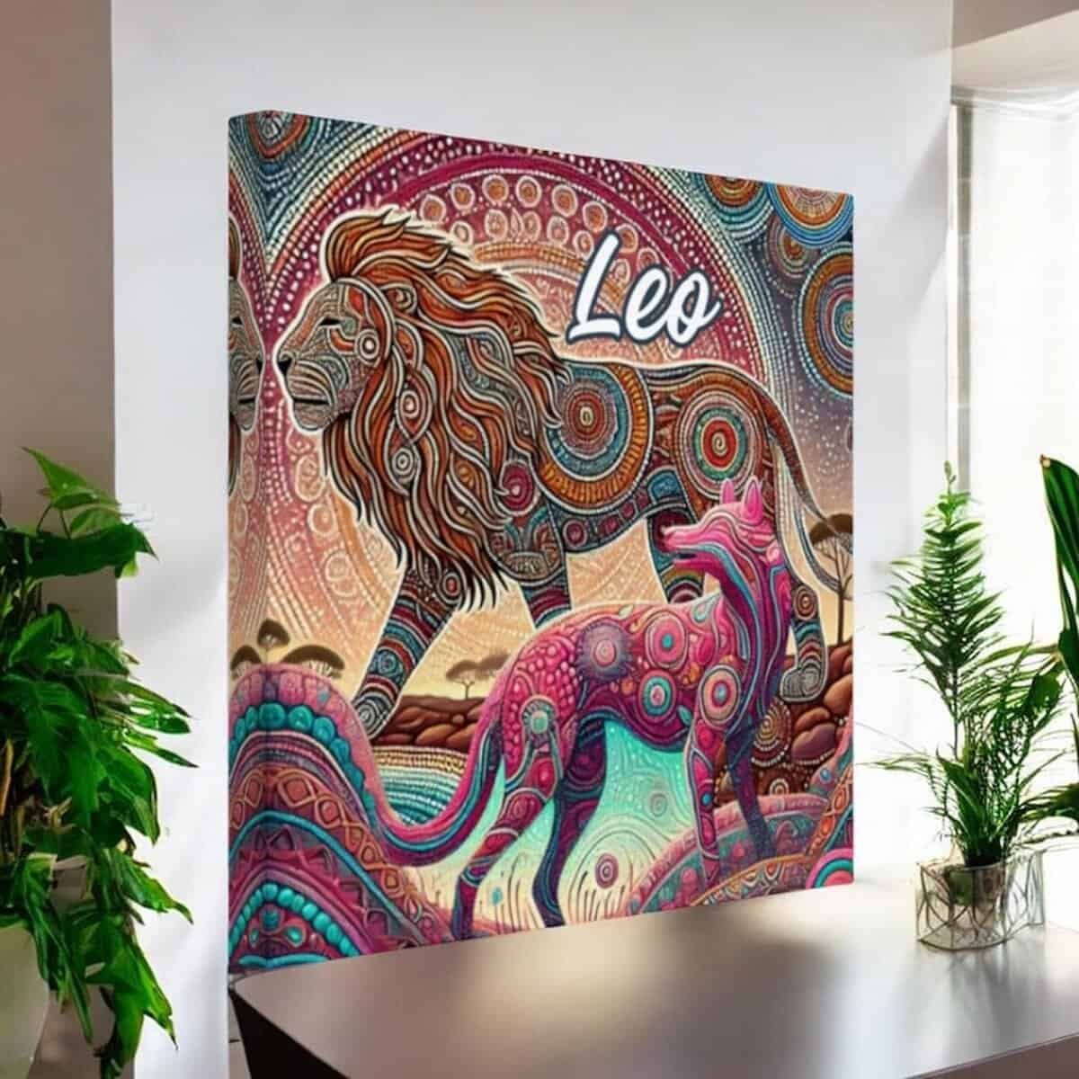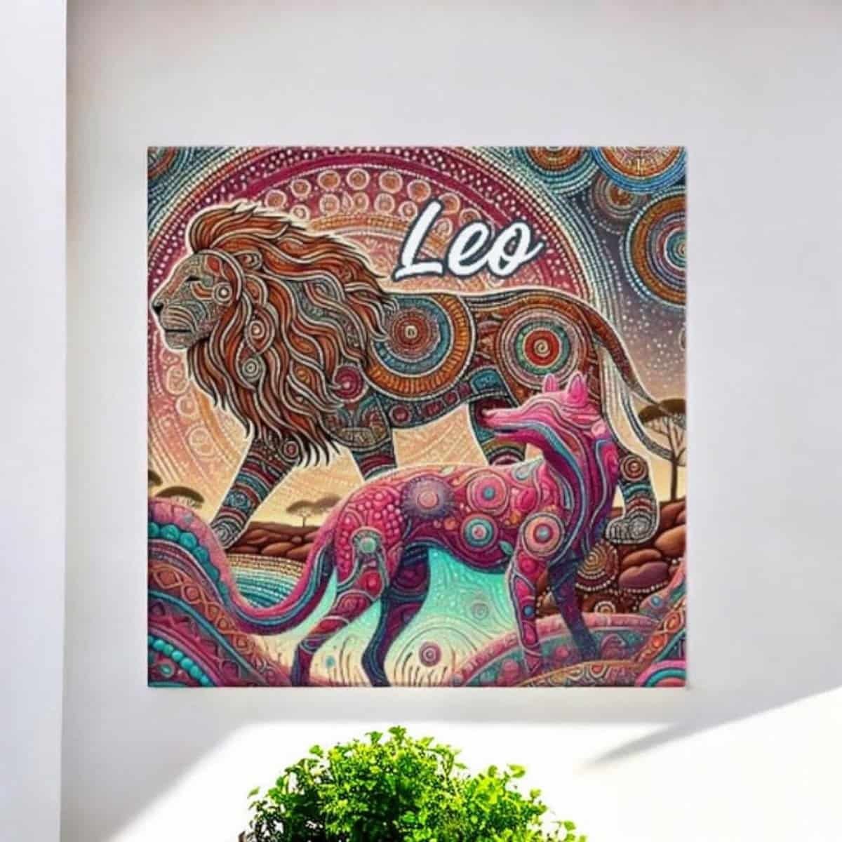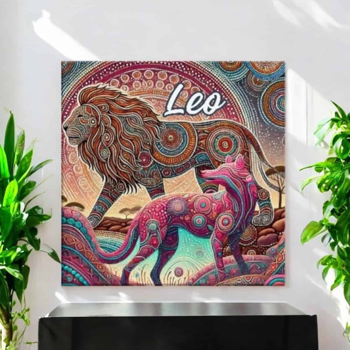 This vibrant Aboriginal Art Leo Zodiac Print captivates with its intricate patterns and rich colors. The artwork features a majestic lion along with the dingo, symbolizing the Leo zodiac sign, adorned with traditional Aboriginal dot painting techniques. The background showcases a pink and green blue mandala, blending seamlessly with circular motifs that represent the connection to nature and cosmic cycles. This piece is perfect for astrology enthusiasts or anyone who appreciates the fusion of cultural artistry with contemporary design. Ideal for adding a bold, artistic statement to any living space.