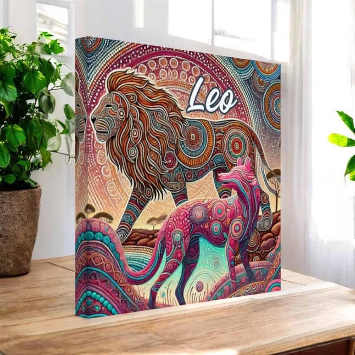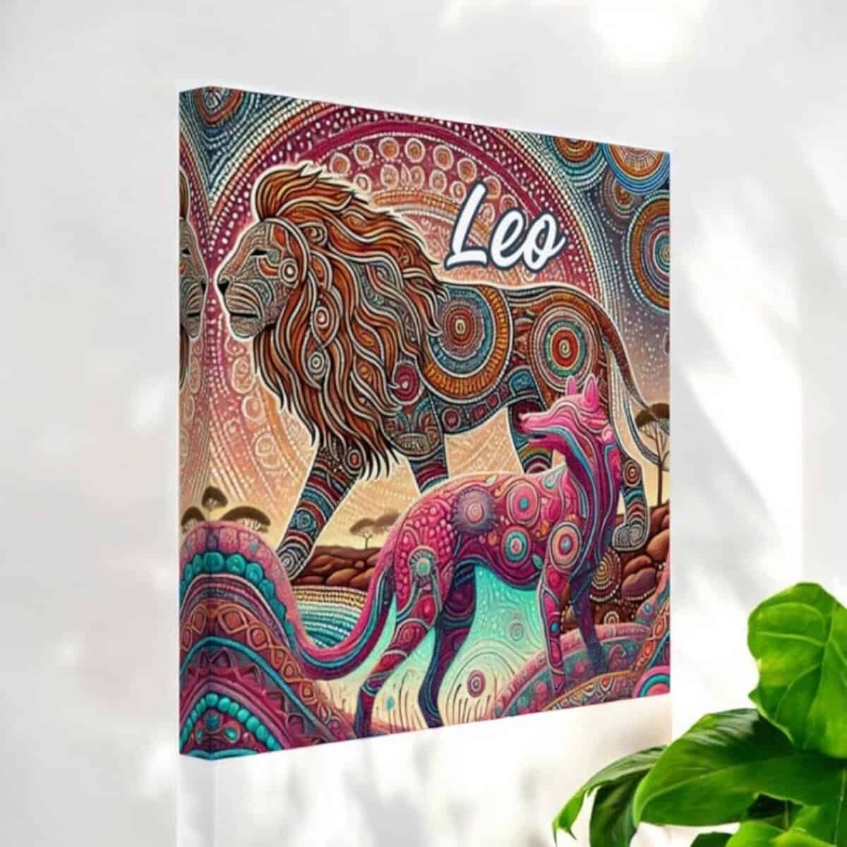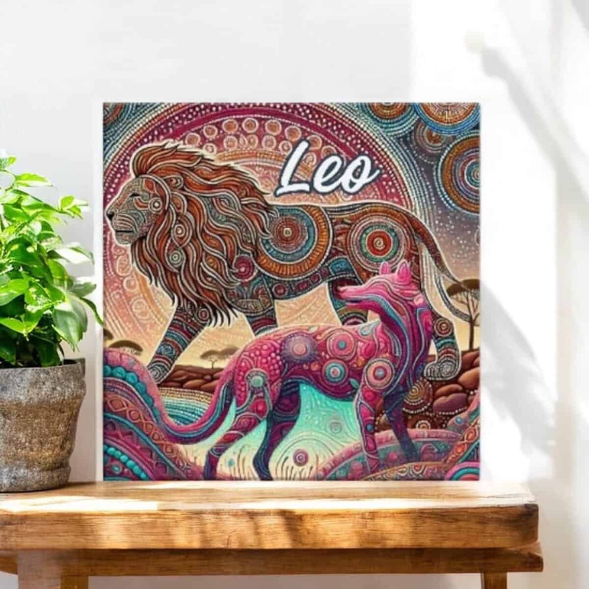 This vibrant Aboriginal Art Leo Zodiac Print captivates with its intricate patterns and rich colors. The artwork features a majestic lion along with the dingo, symbolizing the Leo zodiac sign, adorned with traditional Aboriginal dot painting techniques. The background showcases a pink and green blue mandala, blending seamlessly with circular motifs that represent the connection to nature and cosmic cycles. This piece is perfect for astrology enthusiasts or anyone who appreciates the fusion of cultural artistry with contemporary design. Ideal for adding a bold, artistic statement to any living space.
