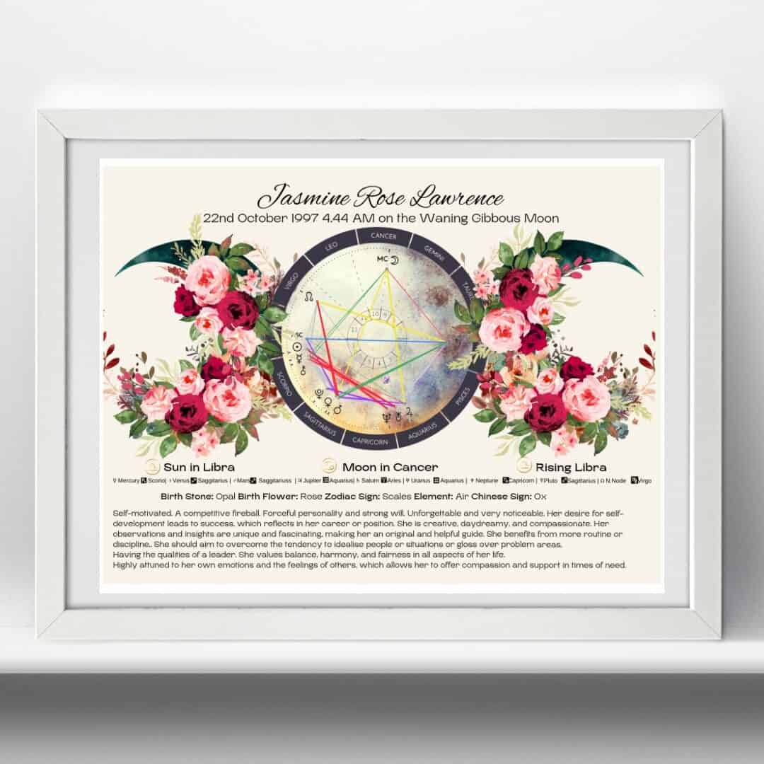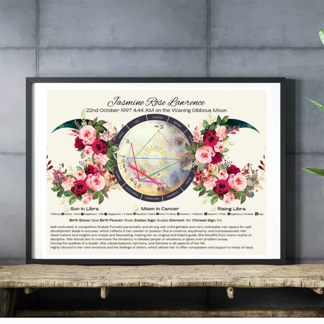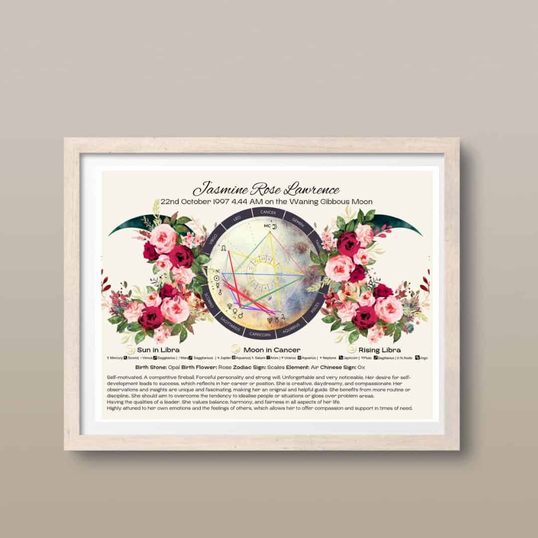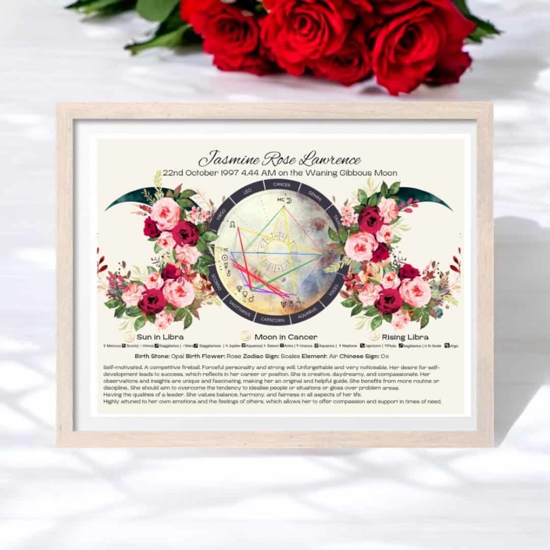 Libra birth chart and traits personalised print. Framed or printable the Libra traits triple moon features the Rose, birth flower of Libra.