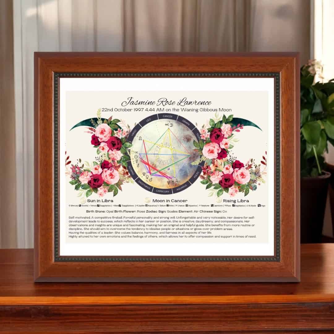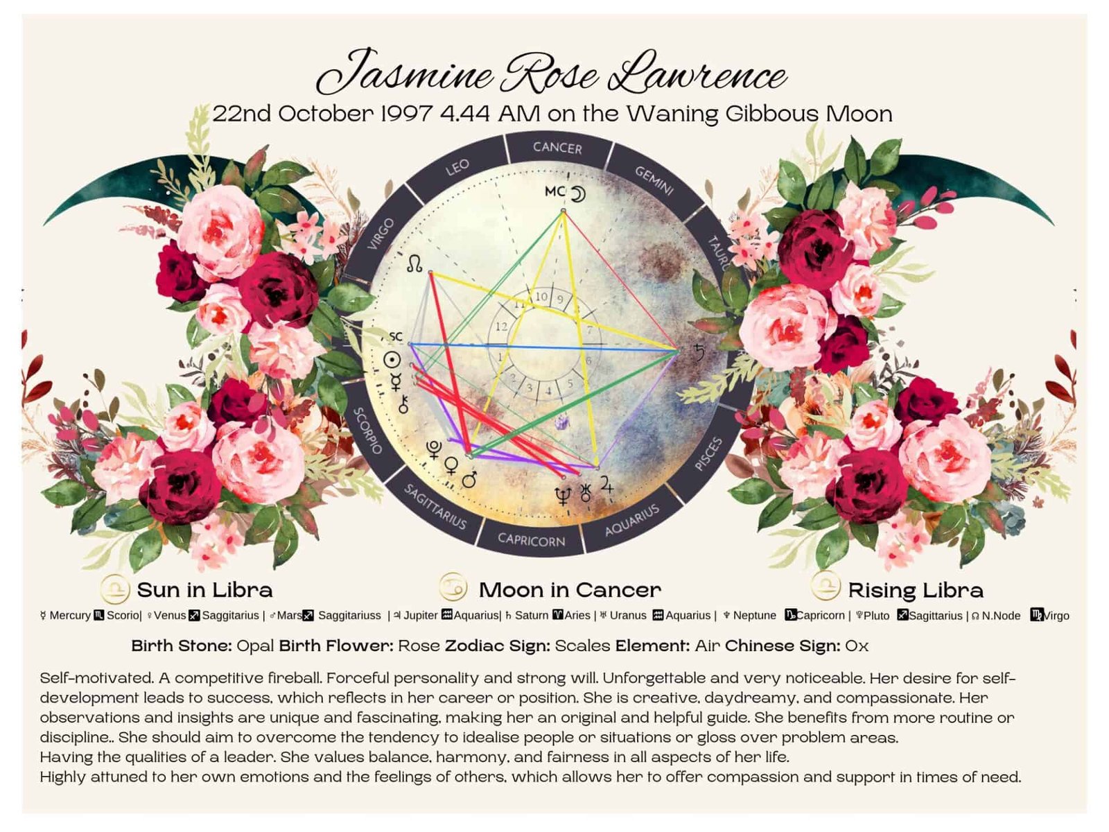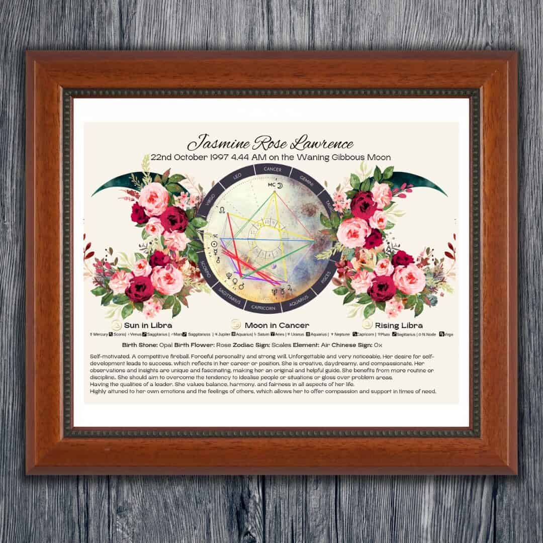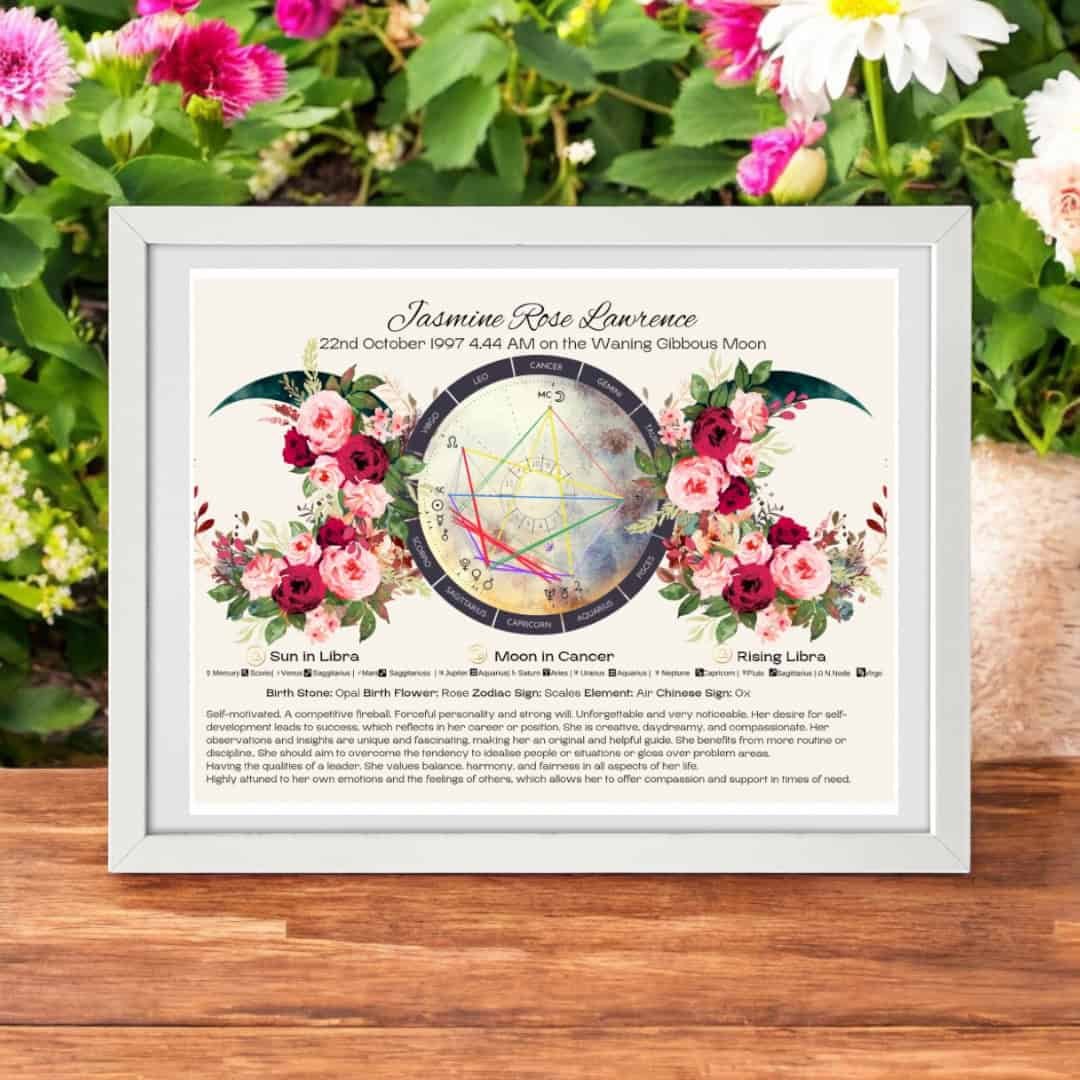 Libra birth chart and traits personalised print. Framed or printable the Libra traits triple moon features the Rose, birth flower of Libra.