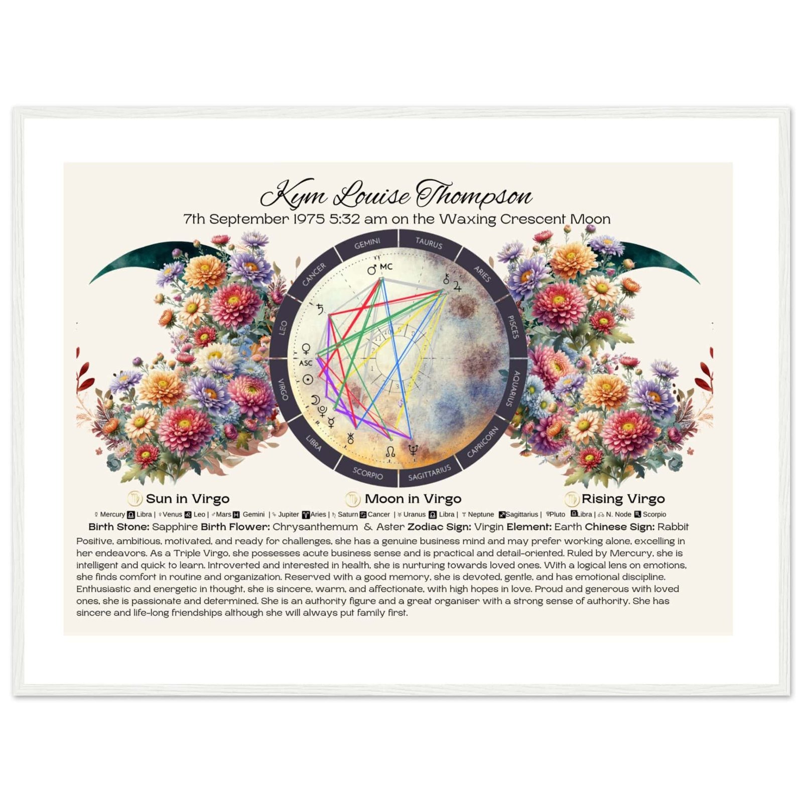 Our Libra Birth Chart & Traits Triple Moon Downloadable file or Framed Print is personalised and using the date, time and place of birth of the person your framed print is for.