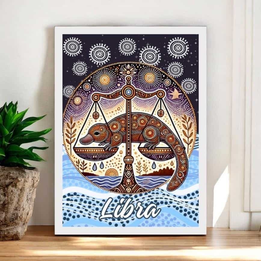 This artwork is a stunning piece of Aboriginal dot art featuring the Libra zodiac symbol represented by scales. The scales are uniquely depicted with a platypus, which is the Aboriginal symbol for Libra.