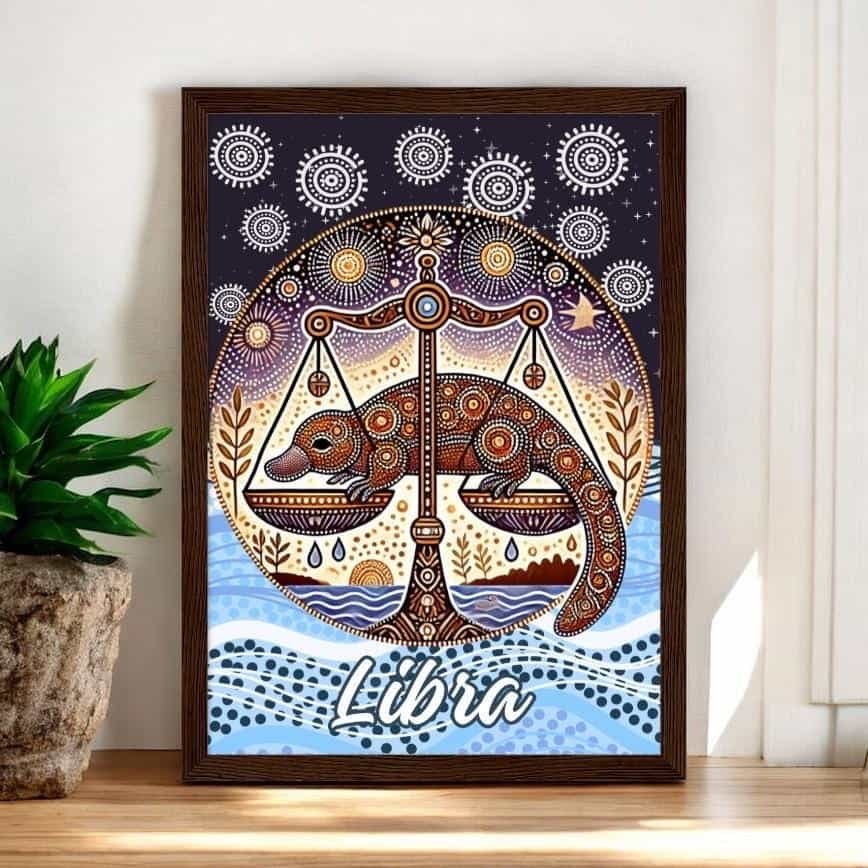 Libra Scales with Platypus Celestial Aboriginal Dot Art wood framed print