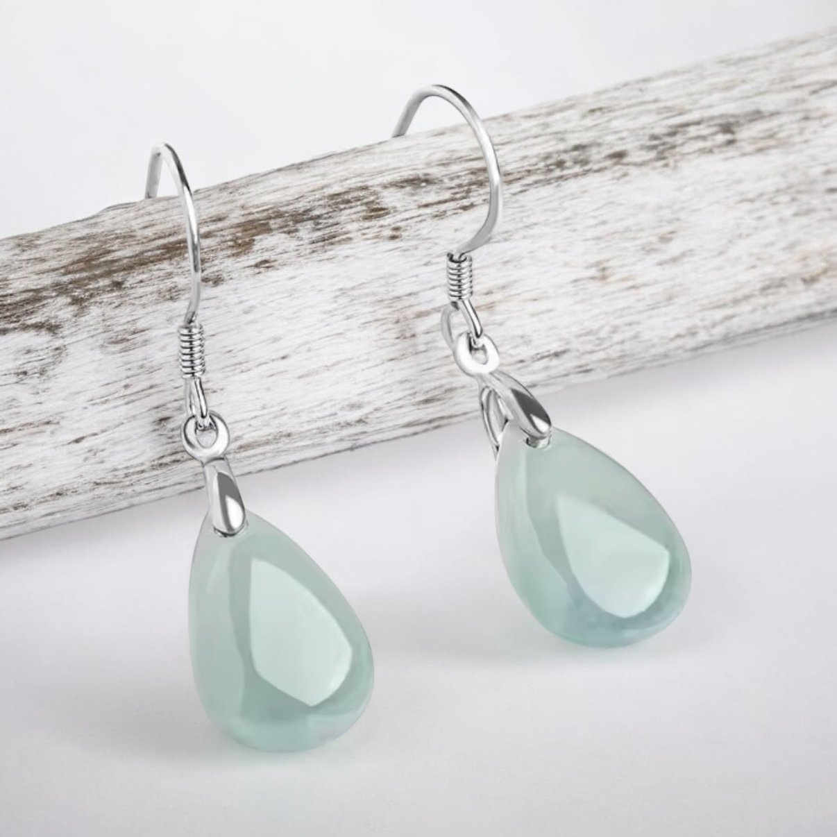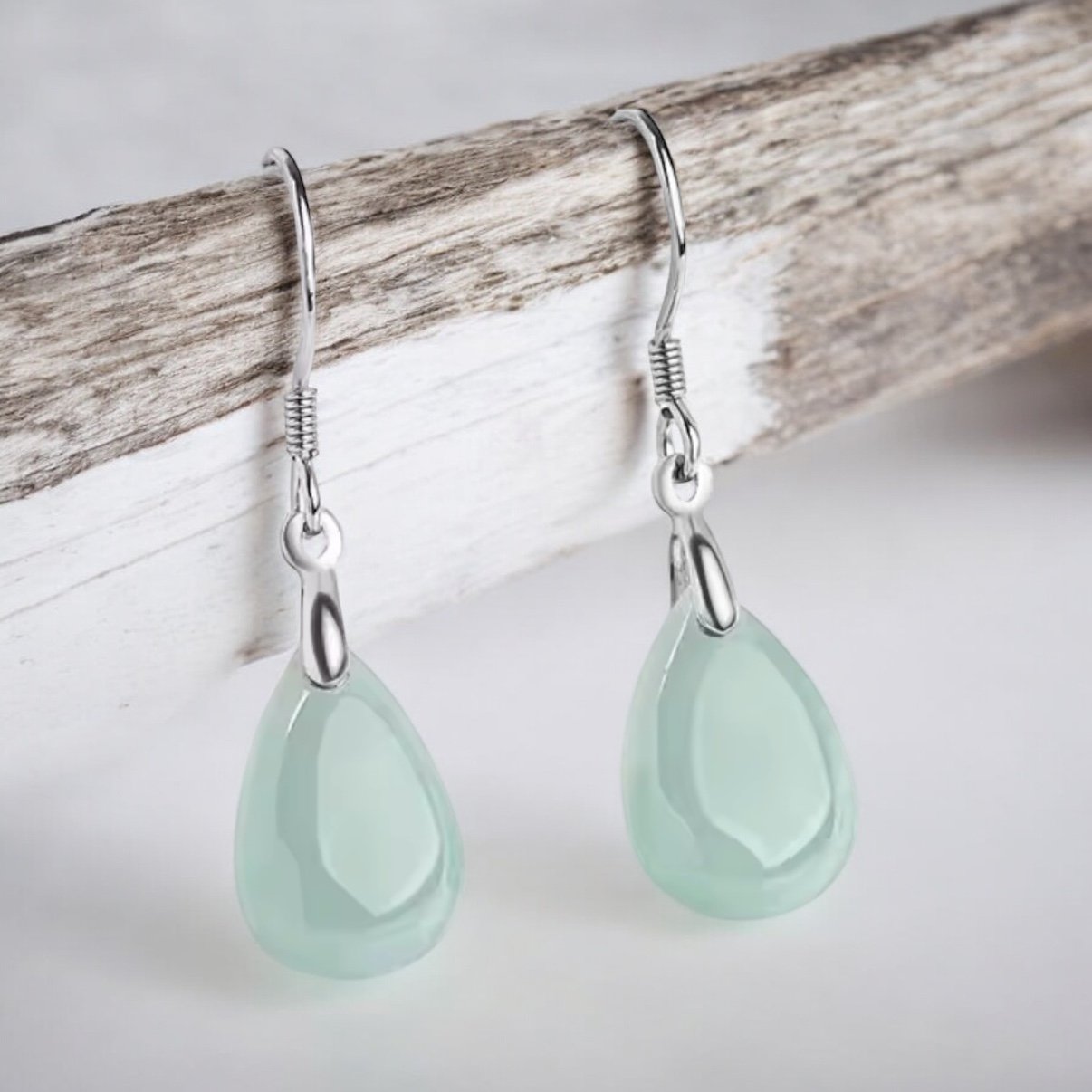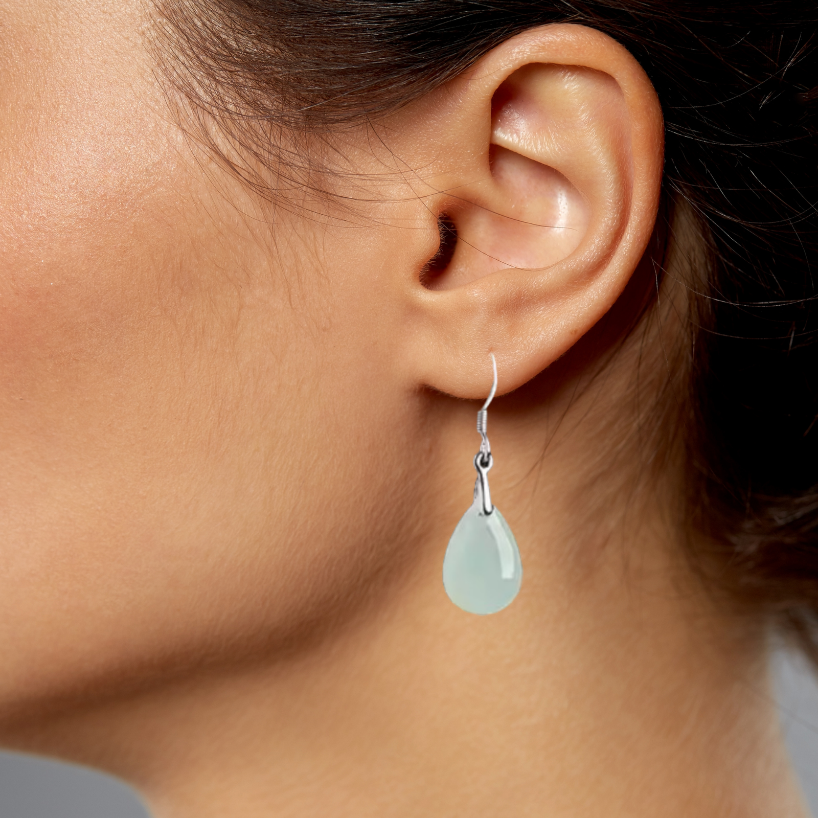 Bring balance, beauty, and positive energy into your life with these authentic natural jadeite earrings. Each earring showcases a Grade A jadeite gemstone measuring 14 x 9 mm, elegantly carved into a smooth teardrop. The light green stones are paired with polished sterling silver hooks, creating a graceful design that complements any style.