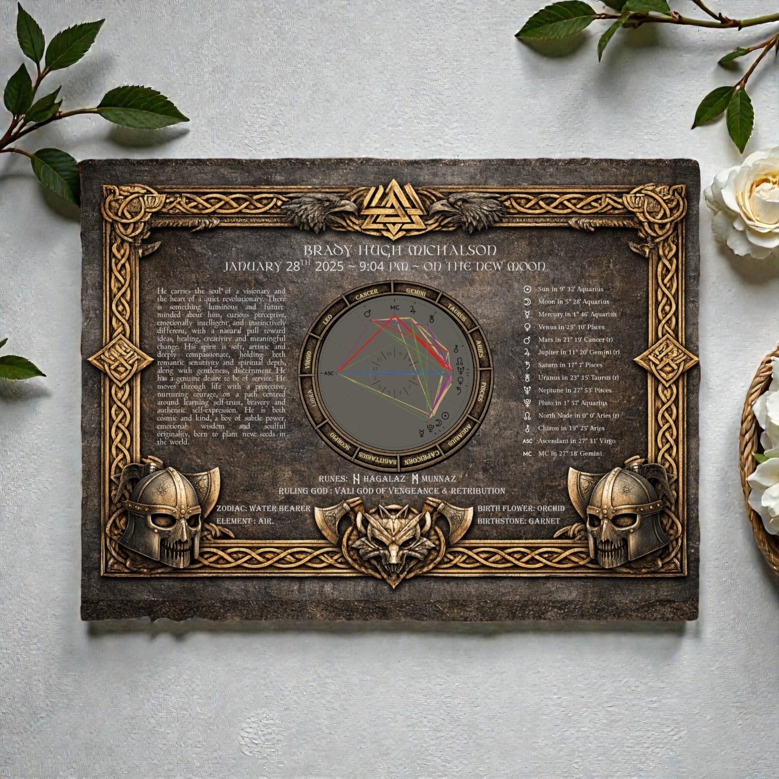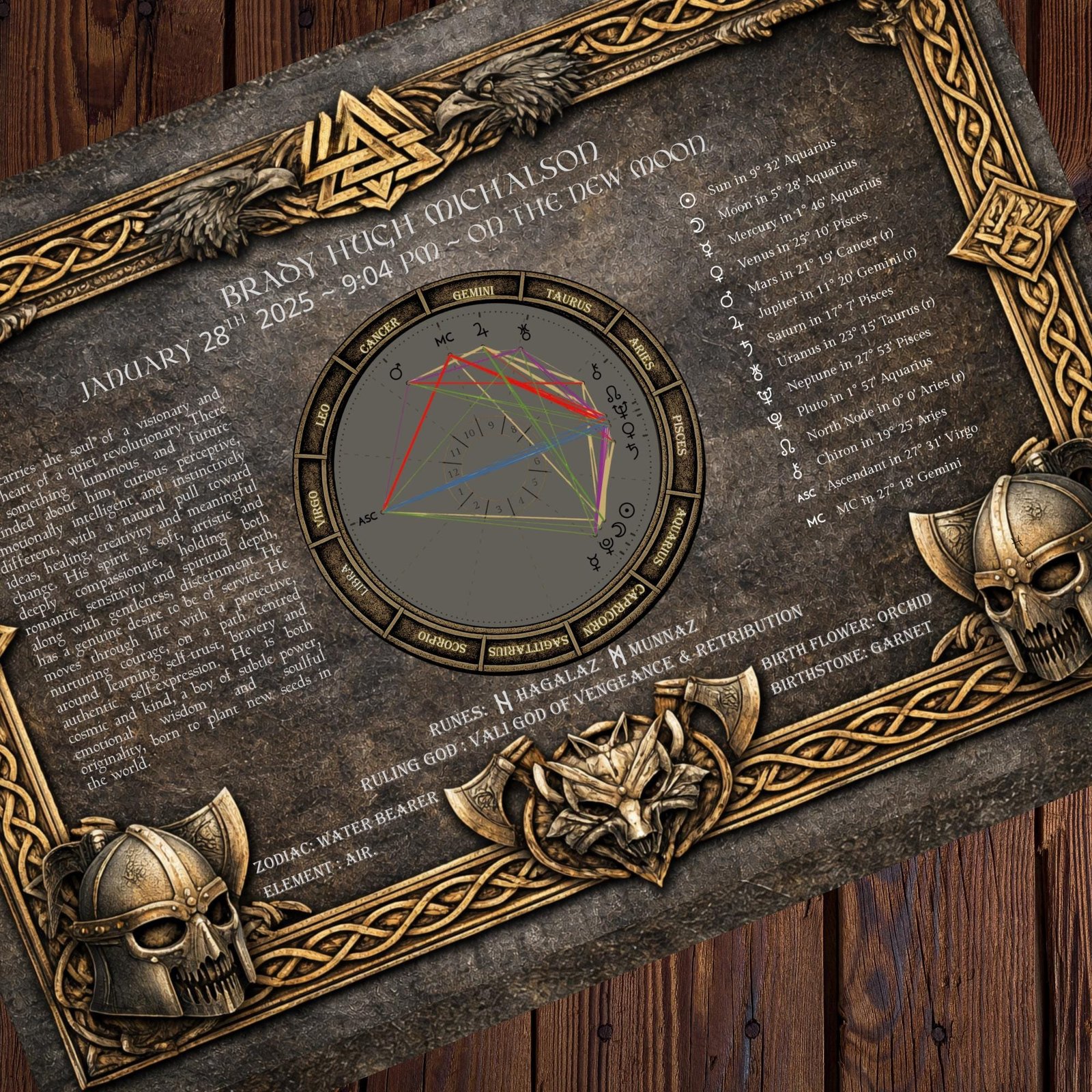 Discover your cosmic saga with a personalised Viking birth chart digital download, custom created from your exact birth details and infused with Norse symbolism, ancient runes and astrological meaning.