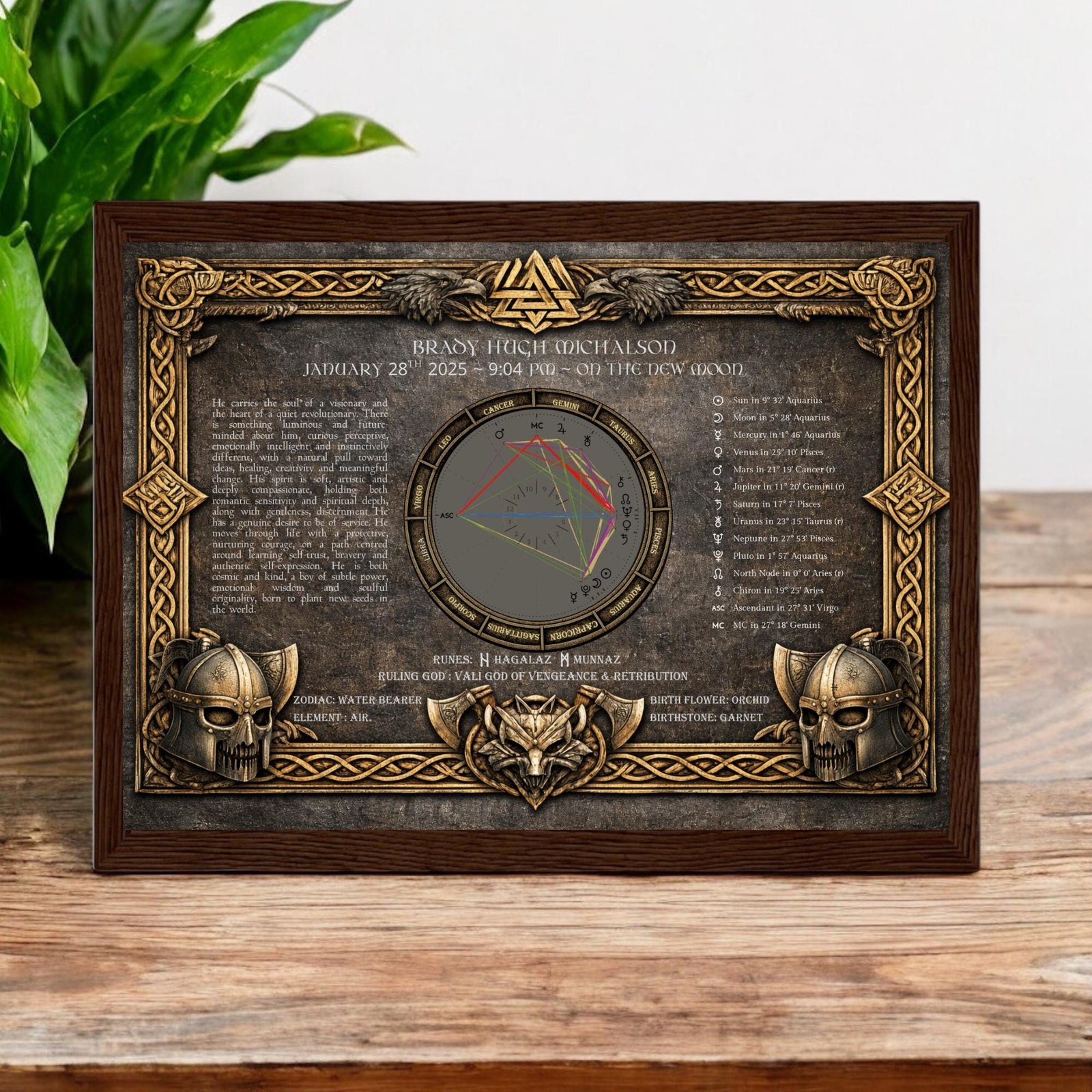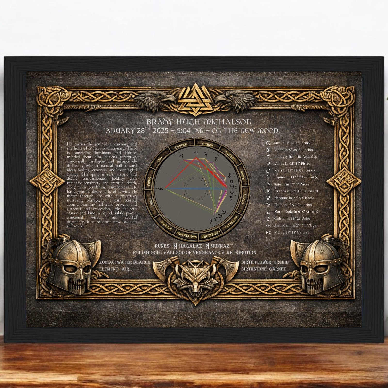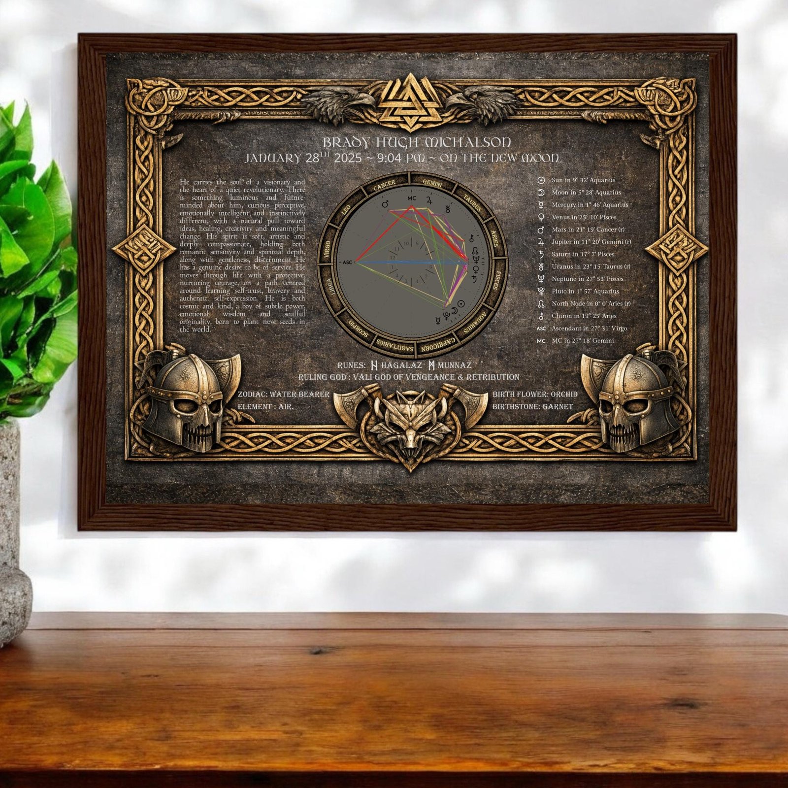 Personalised Viking birth chart wall art created from your exact birth details. Features a custom natal chart, zodiac sign, Viking god, runes, birthstone and traits paragraph. Available as a digital download, ready to print in your size of choice. Unique Norse astrology gift.