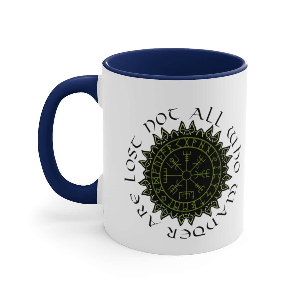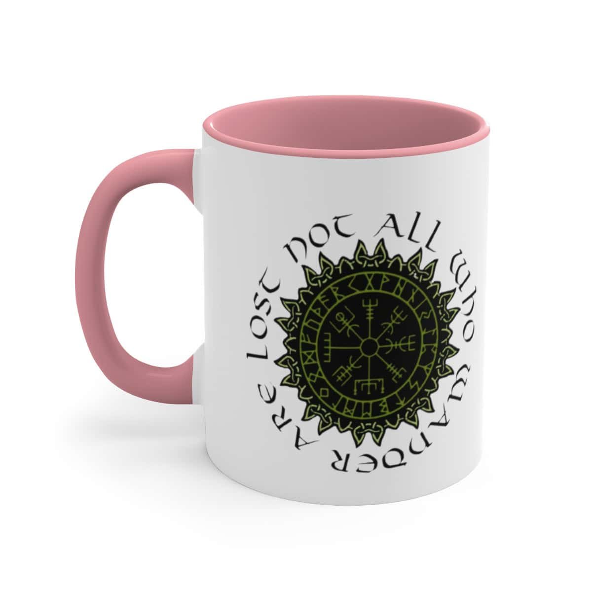 Not all who wander are lost, 11oz ceramic coffee mug with coloured handle and interior featuring the Vegvisir within a Celtic knot and the words Not All Who Wander are Lost.