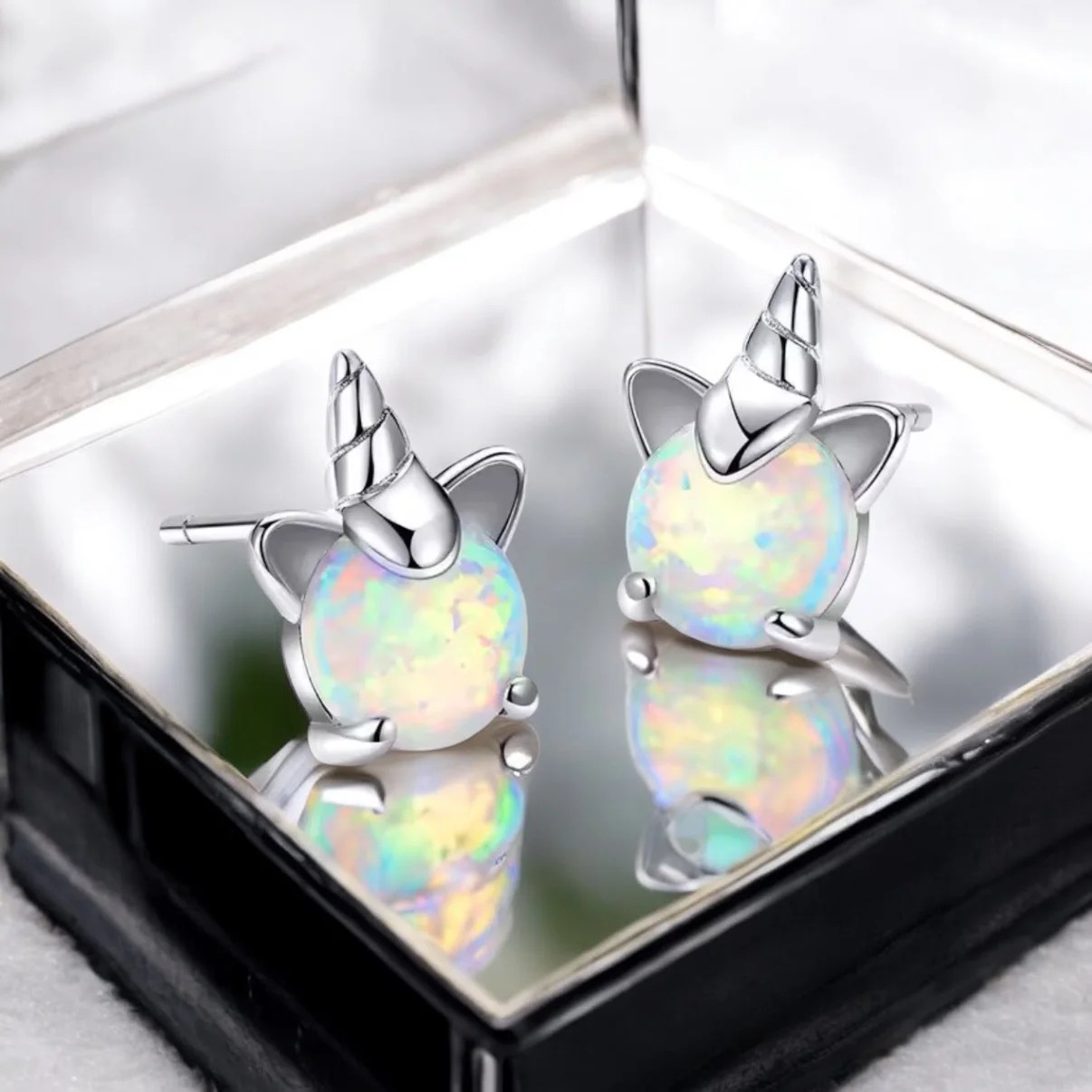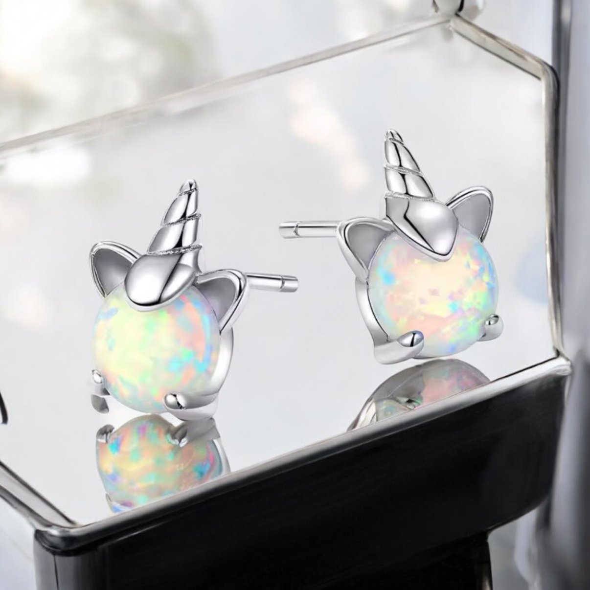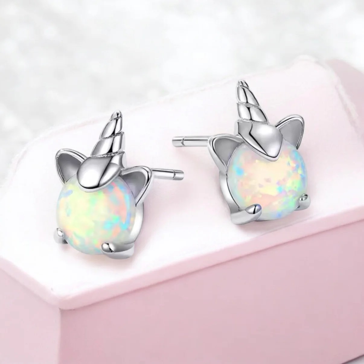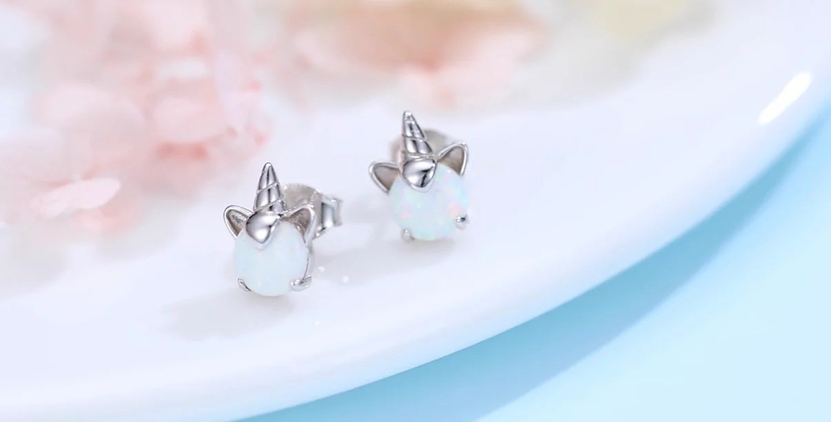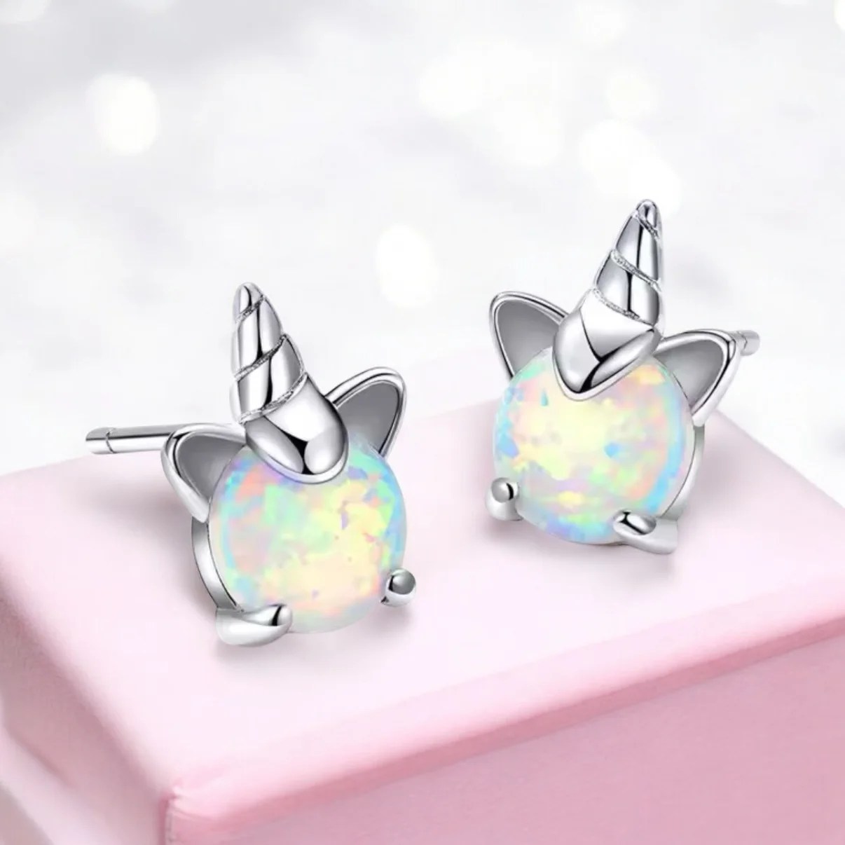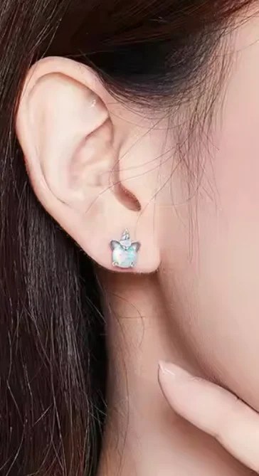 Magical 925 sterling silver unicorn earrings featuring shimmering opal gemstones (October birthstone for Libra & Scorpio). Dainty 0.8cm studs, hypoallergenic, and presented in a gift box – a perfect gift for unicorn lovers or zodiac jewellery fans. Girls and women of all ages will adore them.