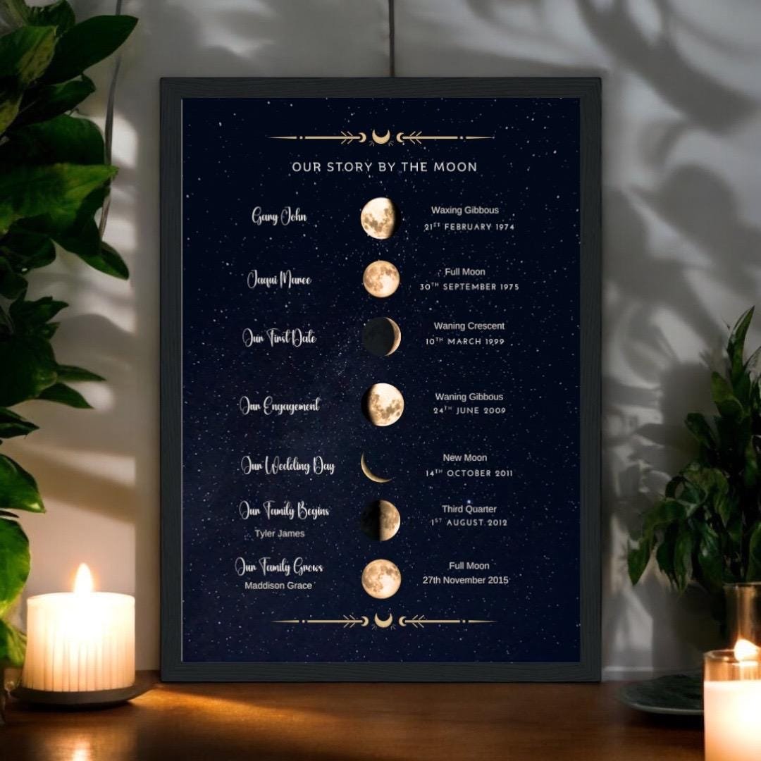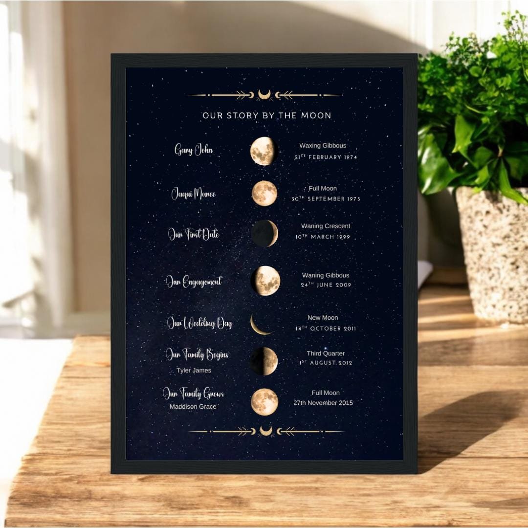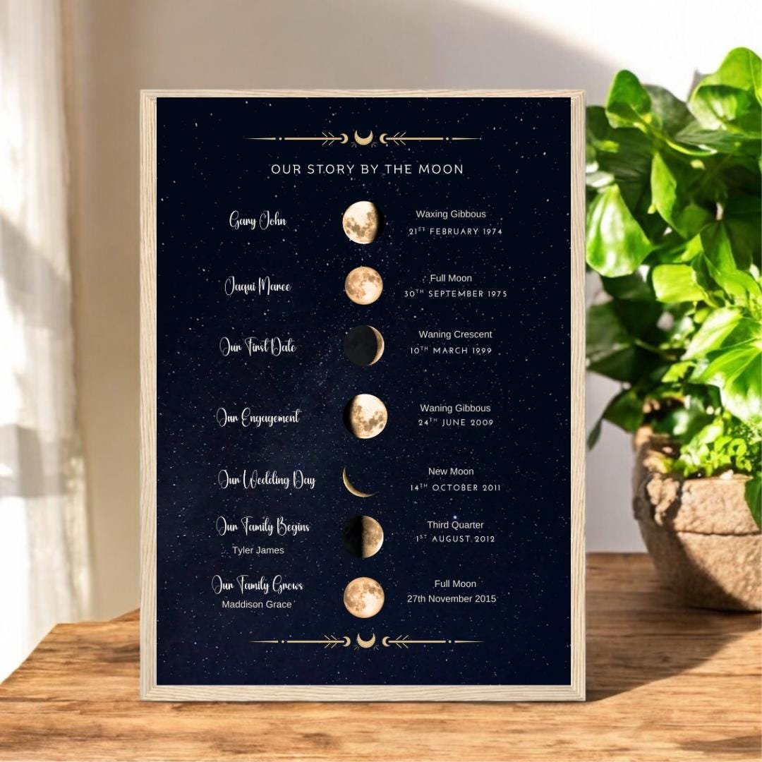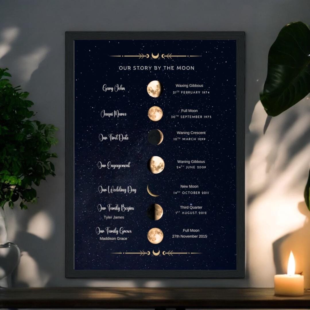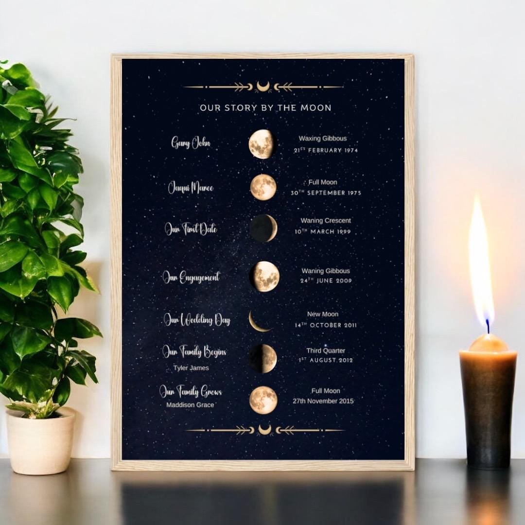 Our Story By The Moon, Customised Moon phase chart for couples and families. Download and print yourself .