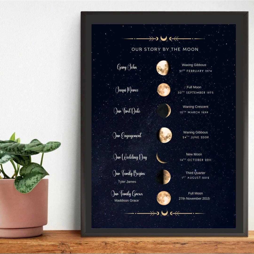 The design showcases the moon phase on the exact date that the special occasions occurred , capturing the magic and beauty of that moment. The intricate details of the moon’s phase are beautifully displayed by golden moons on a stary night sky. Our Moon phase prints make a great addition to any home decor.